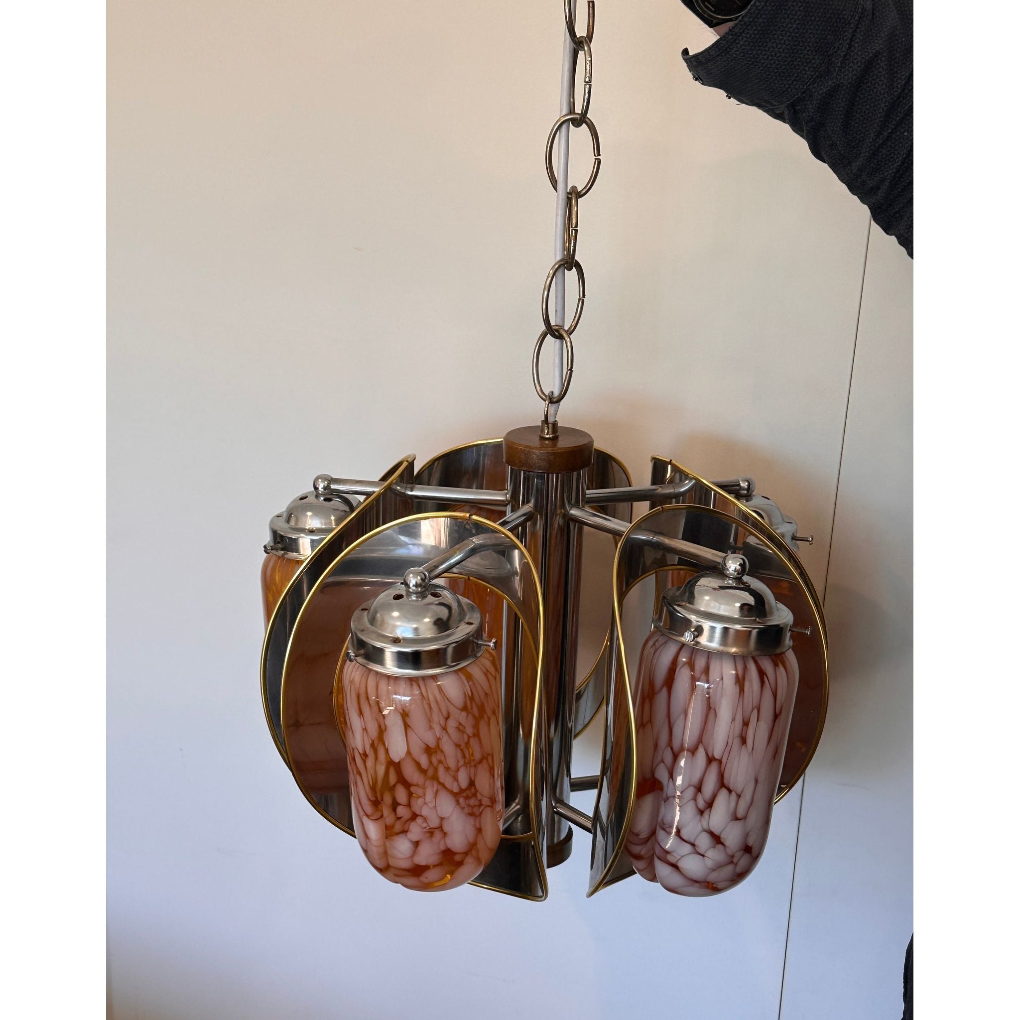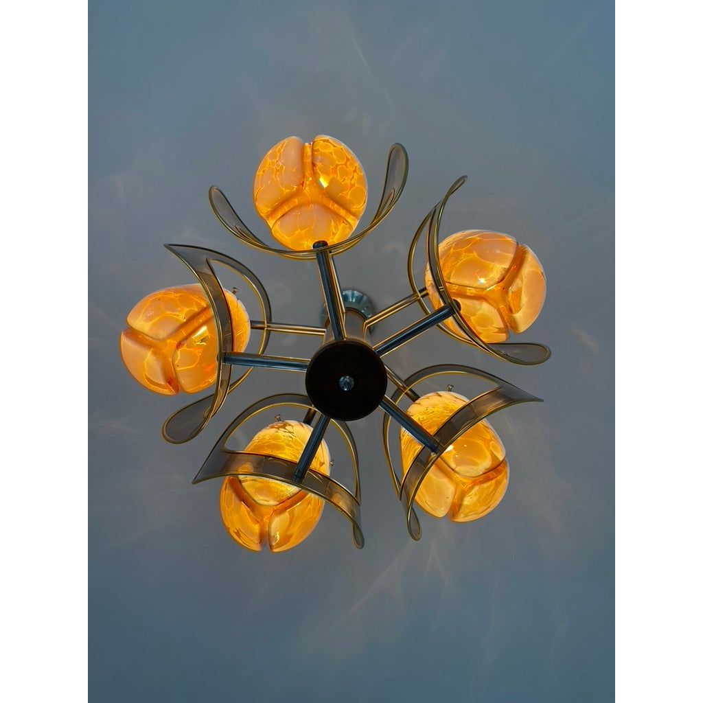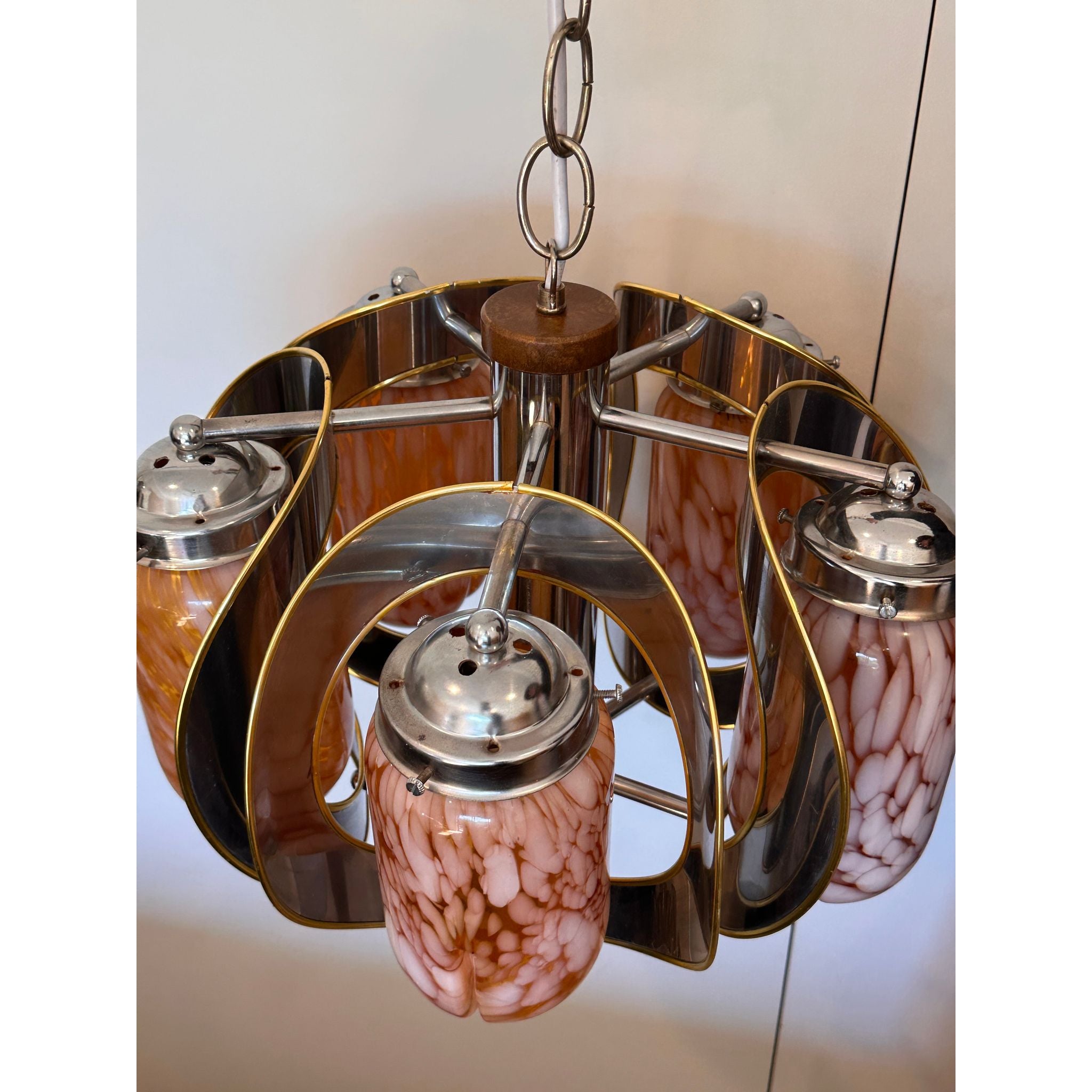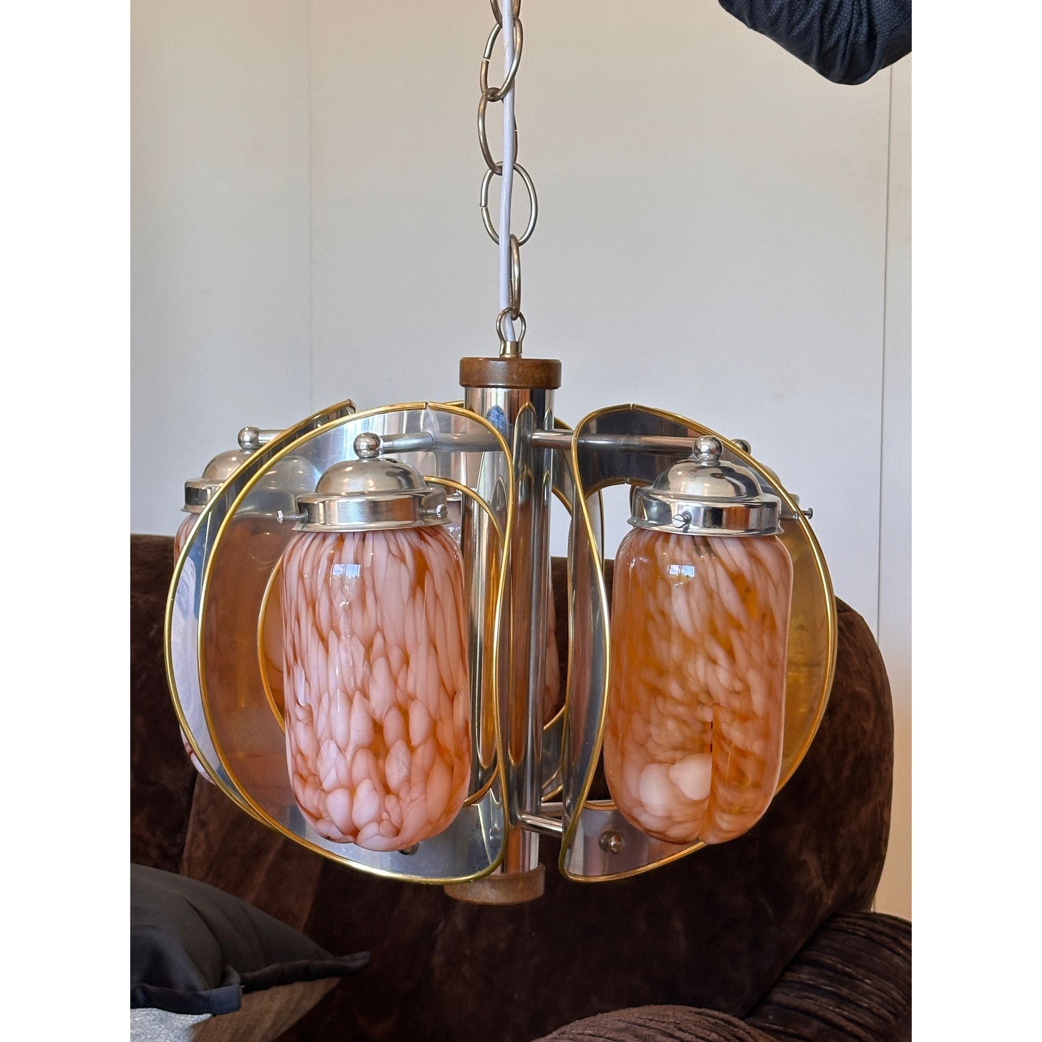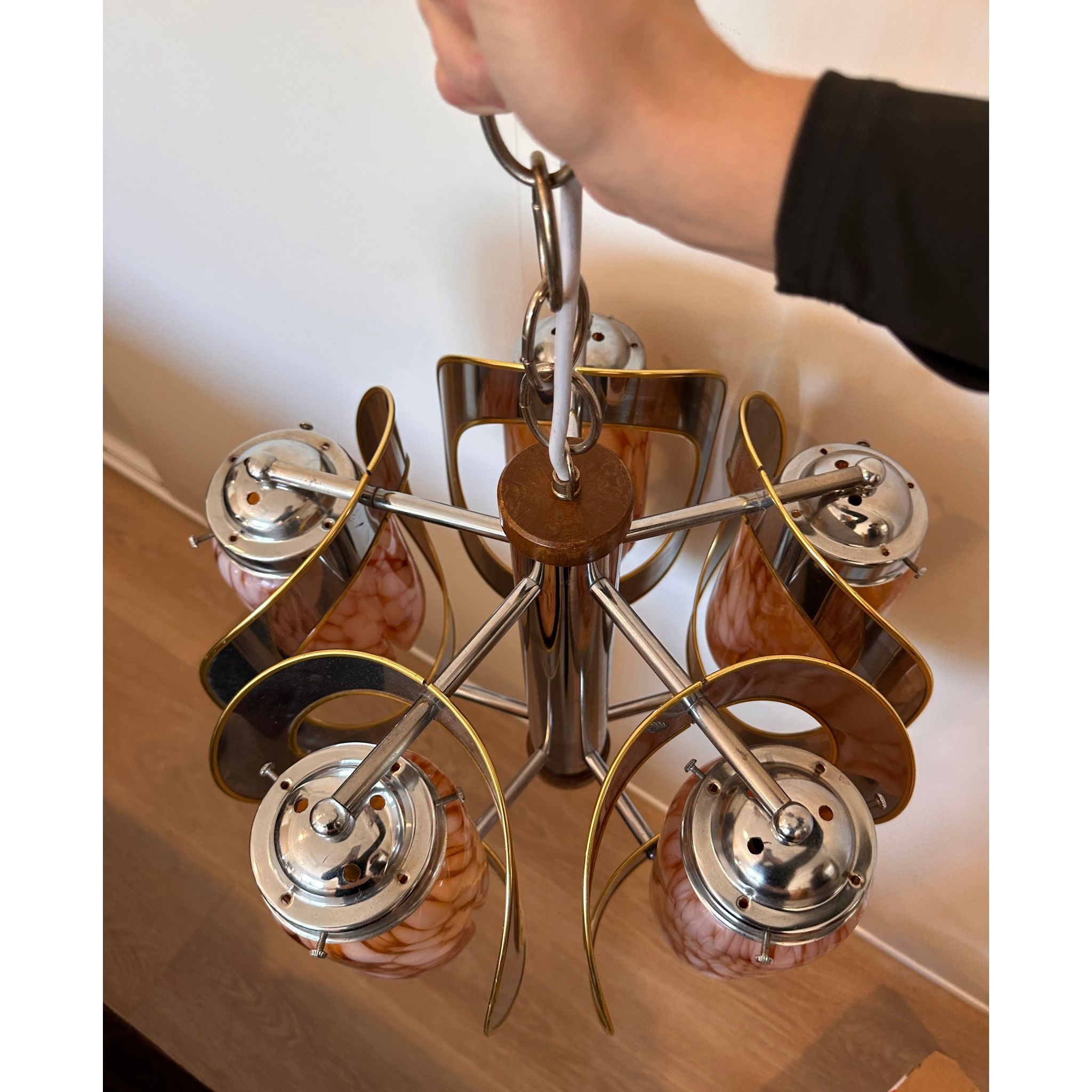 This style is very rare.  I have only ever encountered one like it with three arms, for sale in Slovenia. Each of these chandeliers have five arms. Very space age.