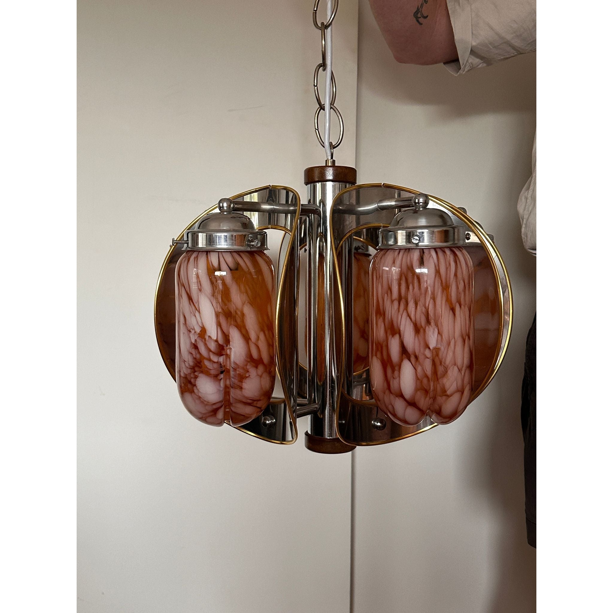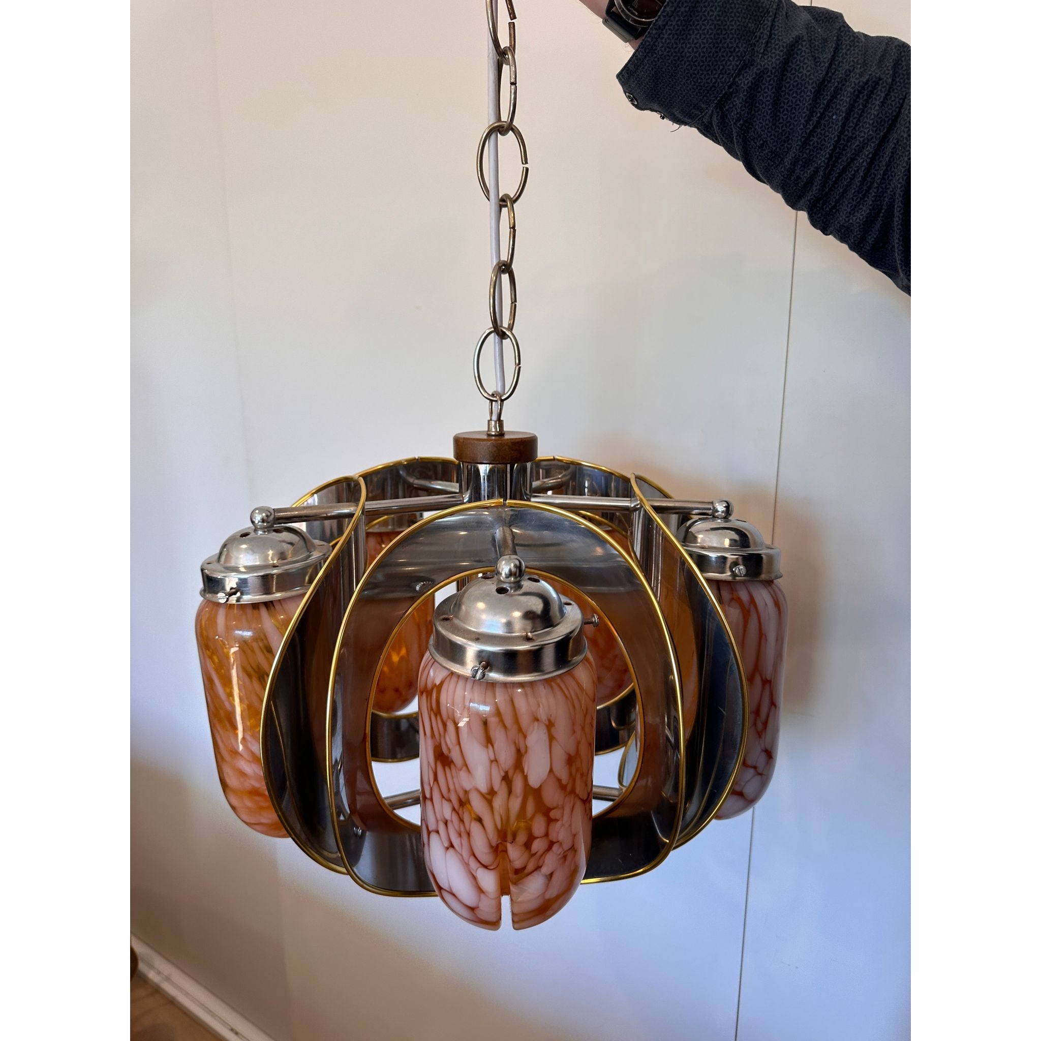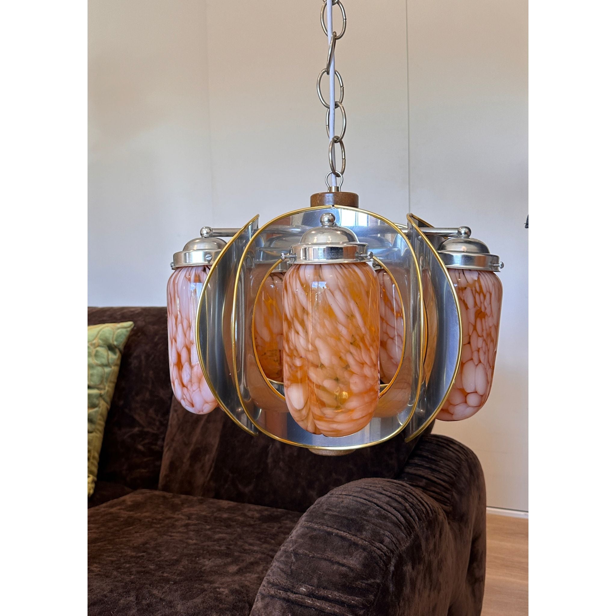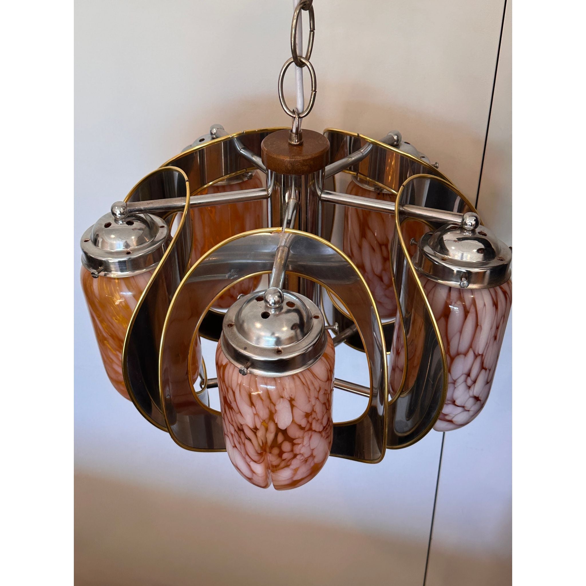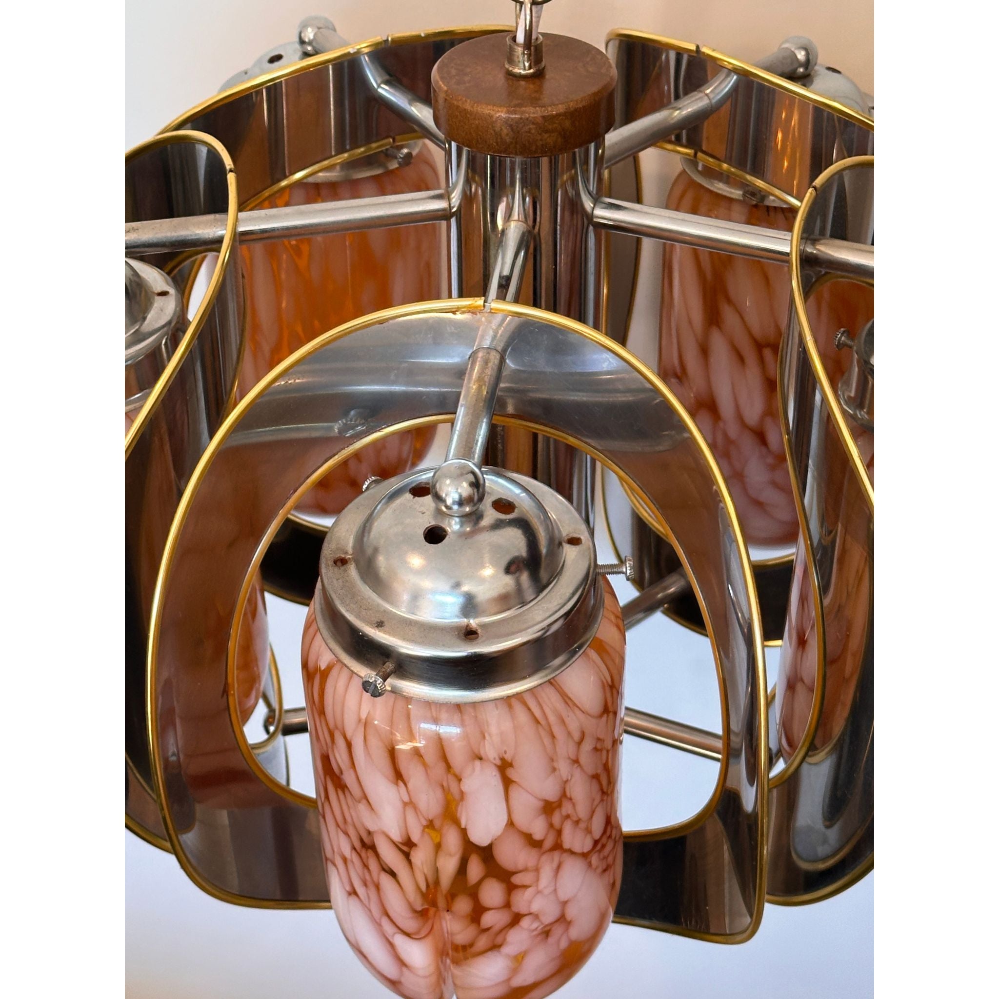 This style is very rare.  I have only ever encountered one like it with three arms, for sale in Slovenia. Each of these chandeliers have five arms. Very space age.