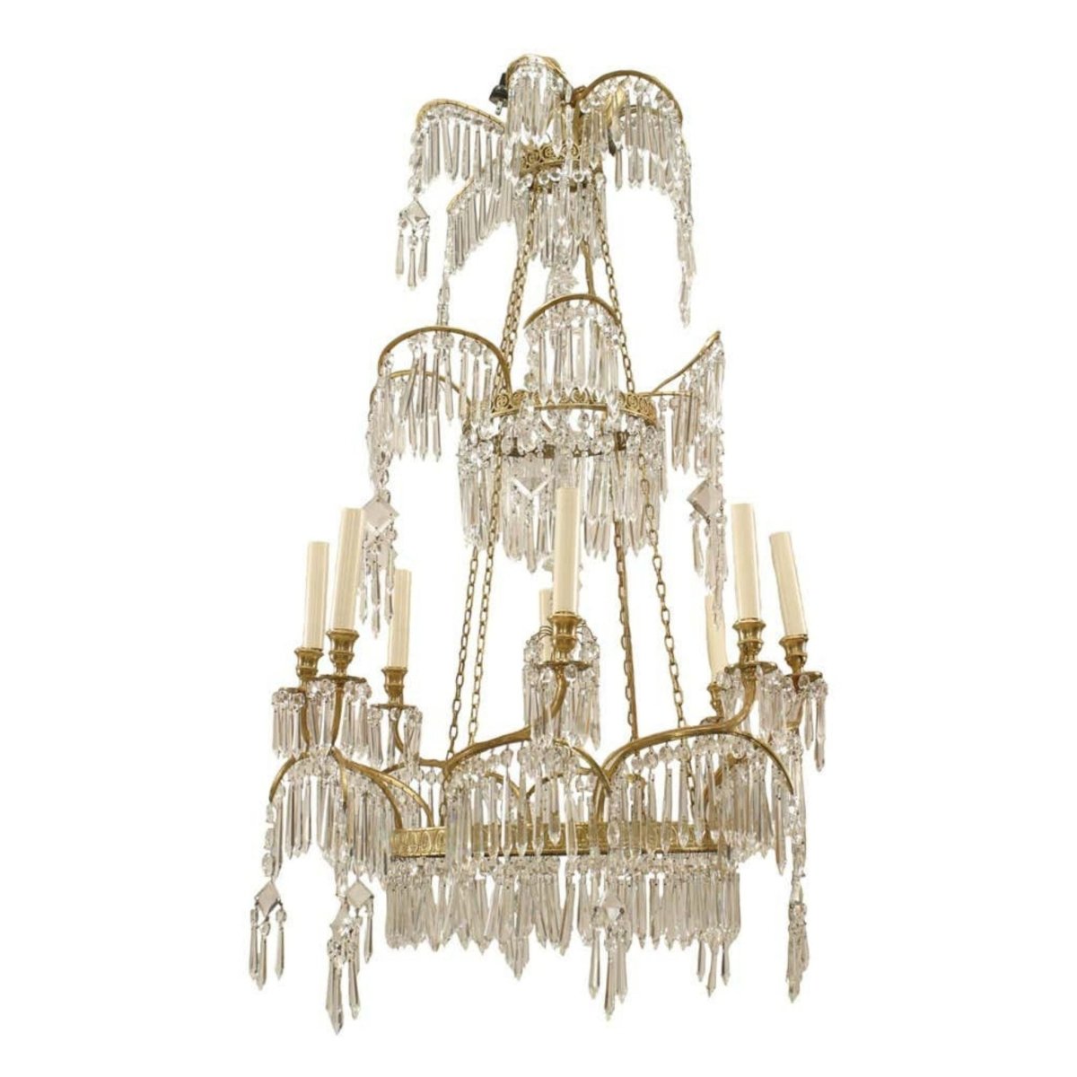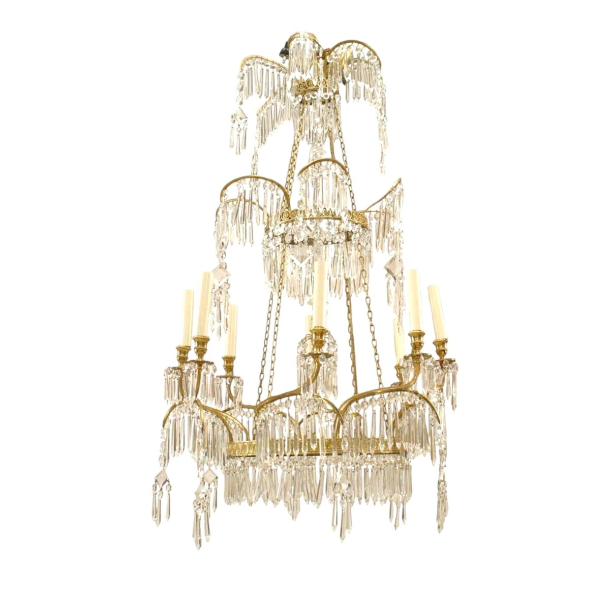 Russian crystal & gilt bronze chandelier with 8 swirl design arms with lights emanating from a ring base below 2 smaller rings with swirl extensions circa 1800s.