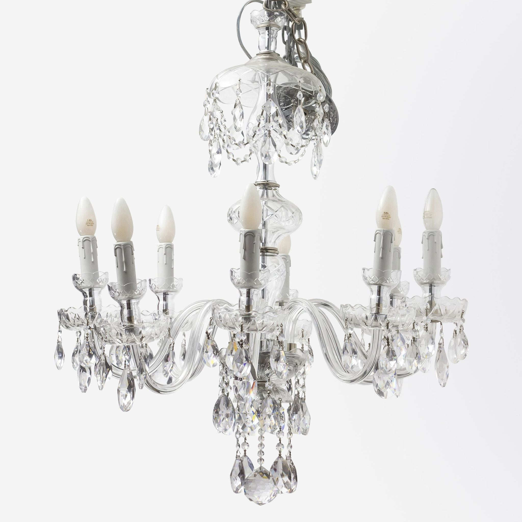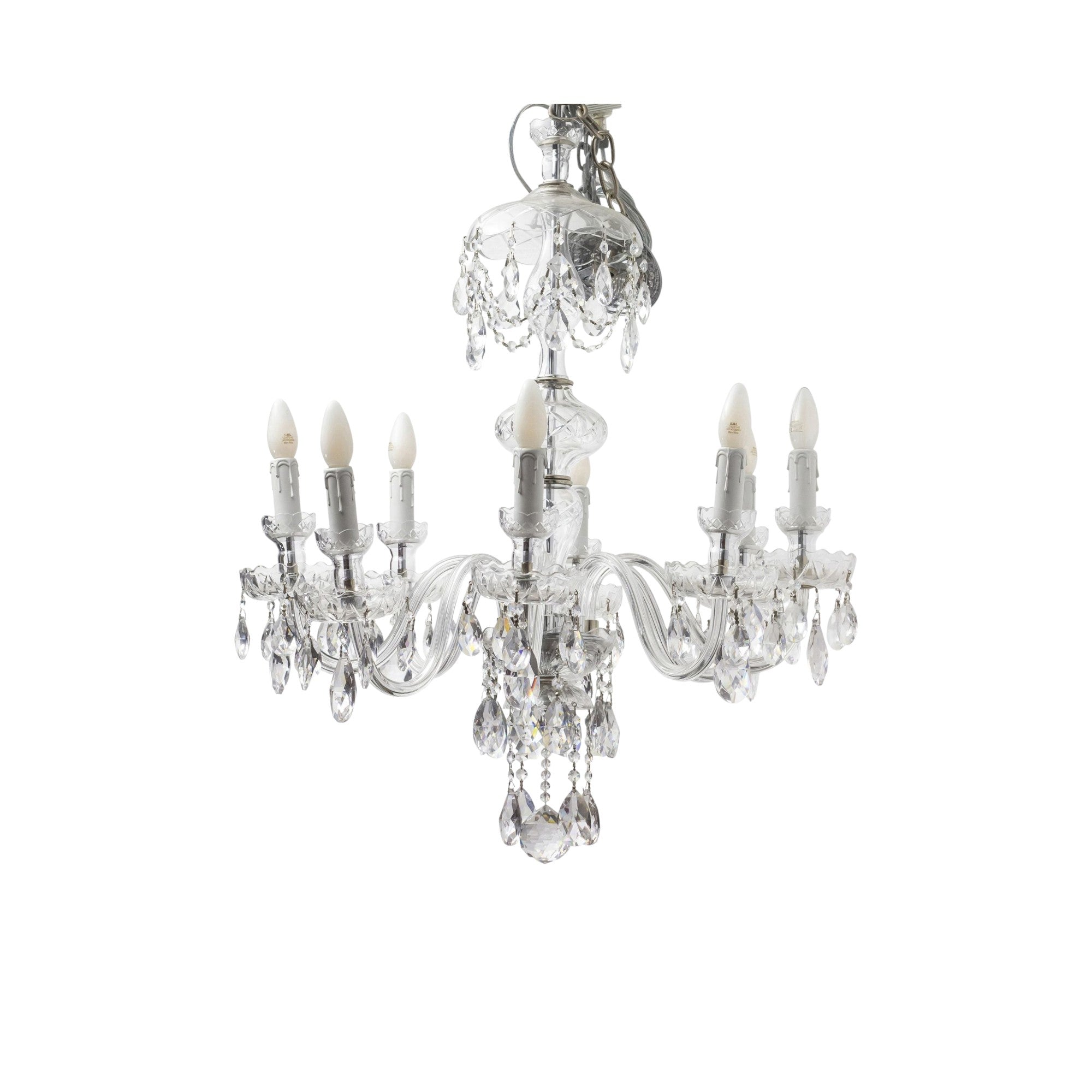A lovely eight-arm crystal chandelier with faceted teardrop and gem-shaped drops. Rewired for Australian standards and ready to hang.