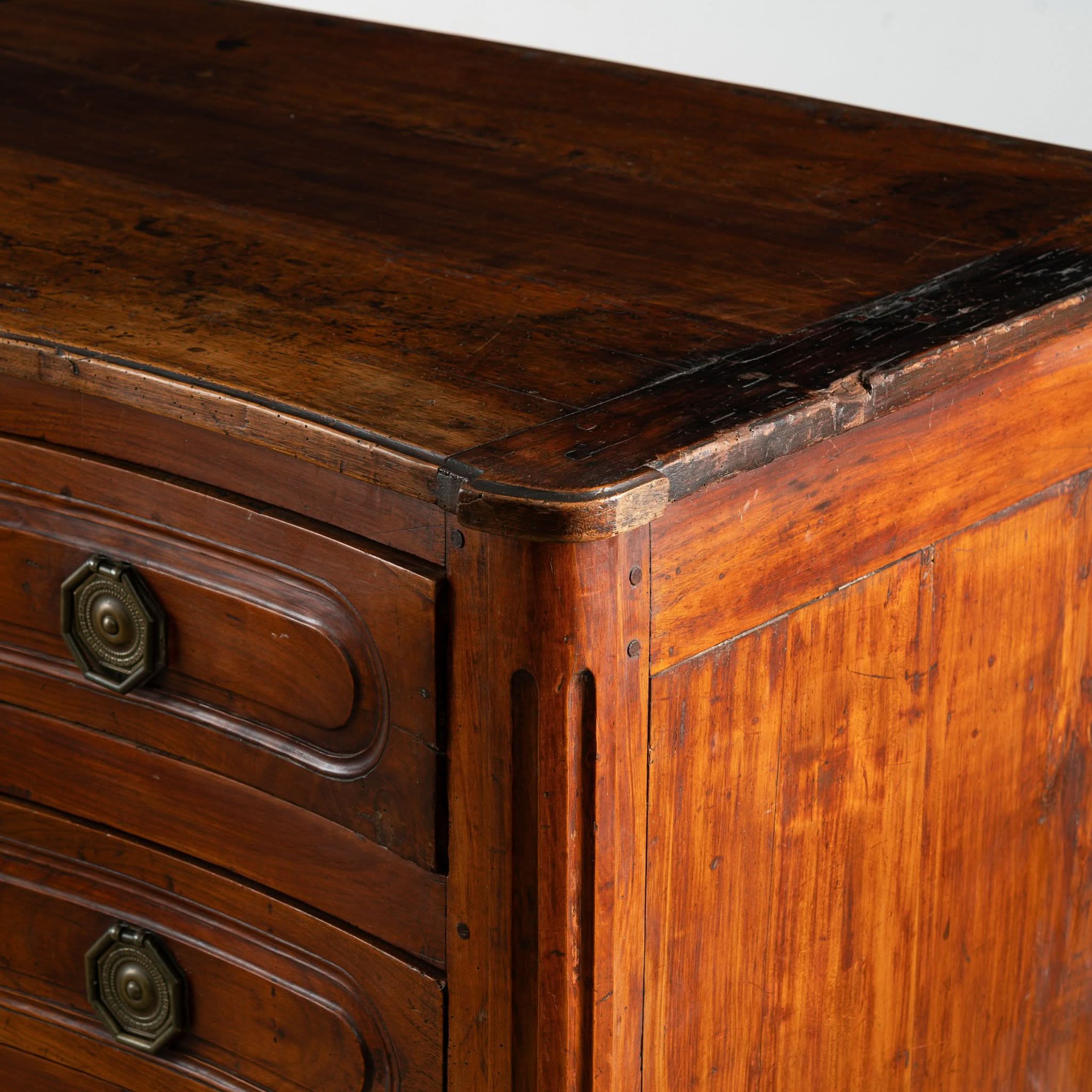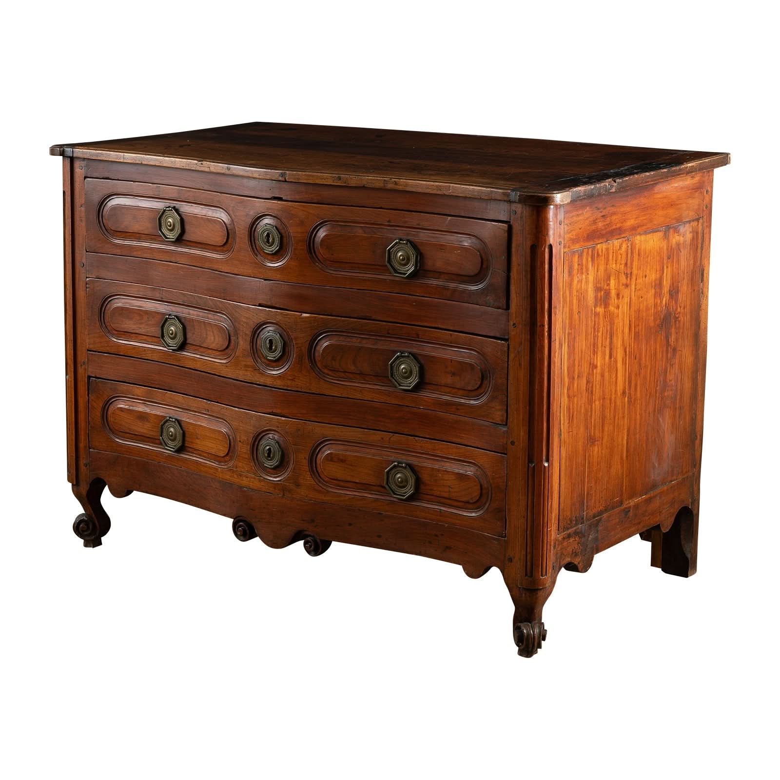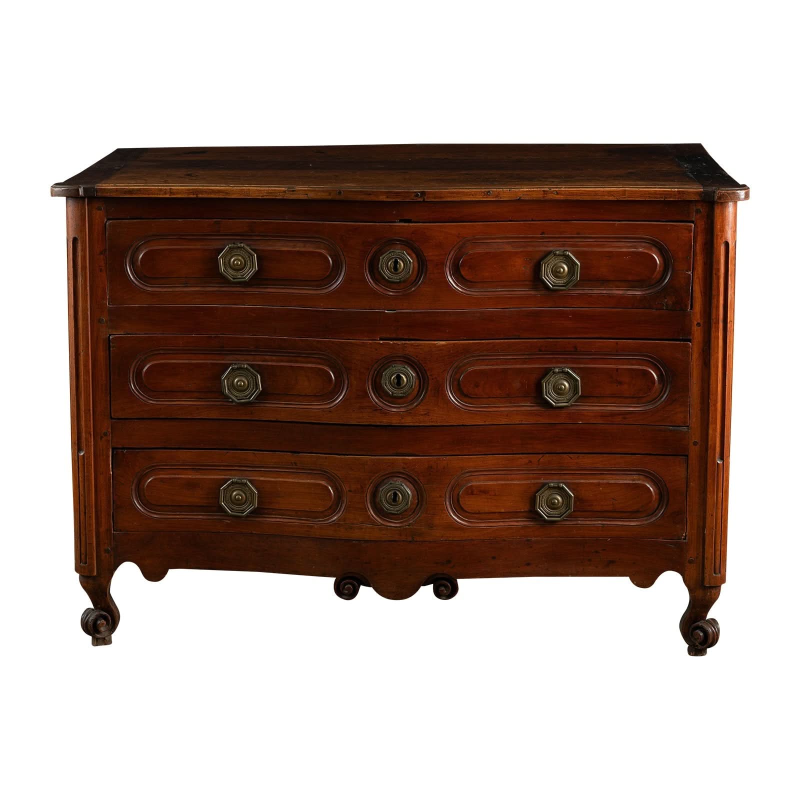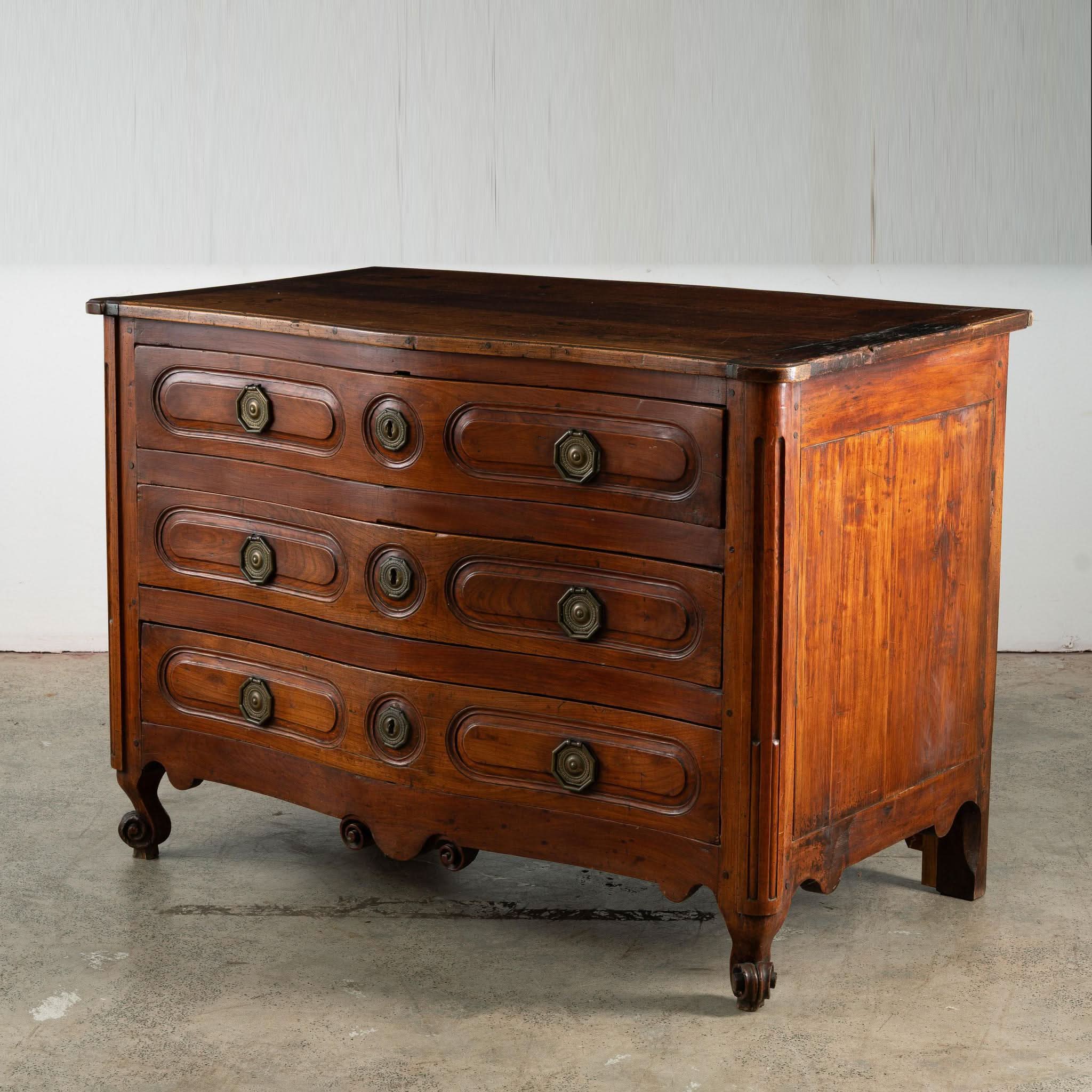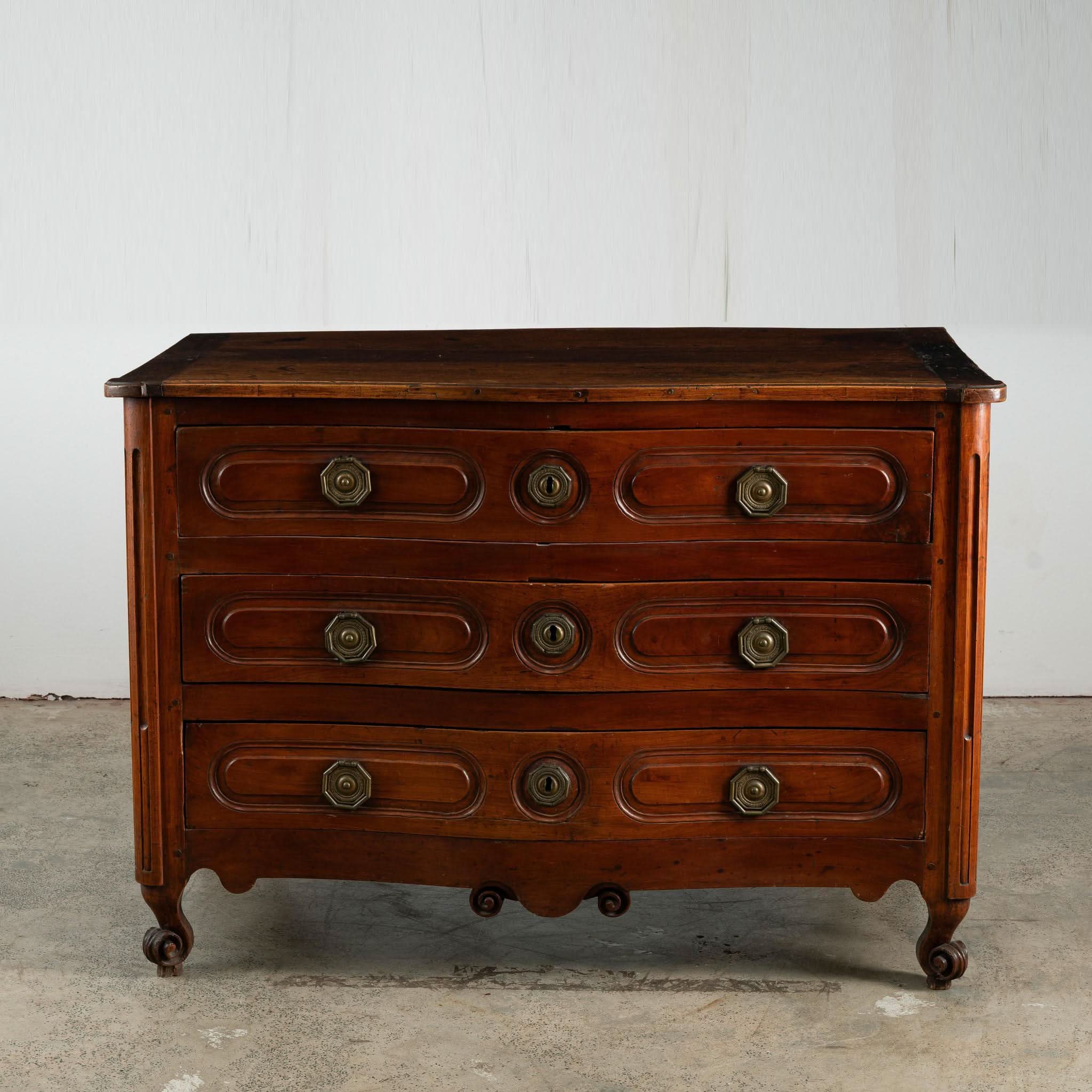 The bowfront top above three panelled drawers with brass pull handles and central escutcheon above a shaped apron and scroll foot