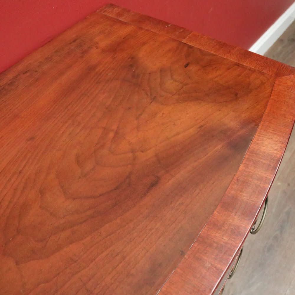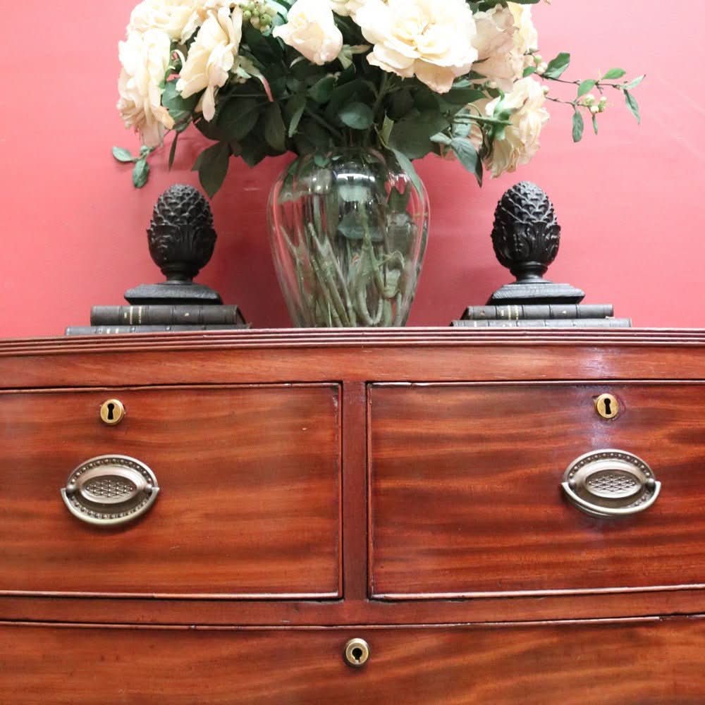 Description: Elegant and functional, this antique English Georgian-style bow front chest of drawers dates to the 1940s. Featuring four spacious drawers—three retaining their original locks and one sympathetically replaced during its life. Beautiful brass handles and escutcheons add to its classic charm.