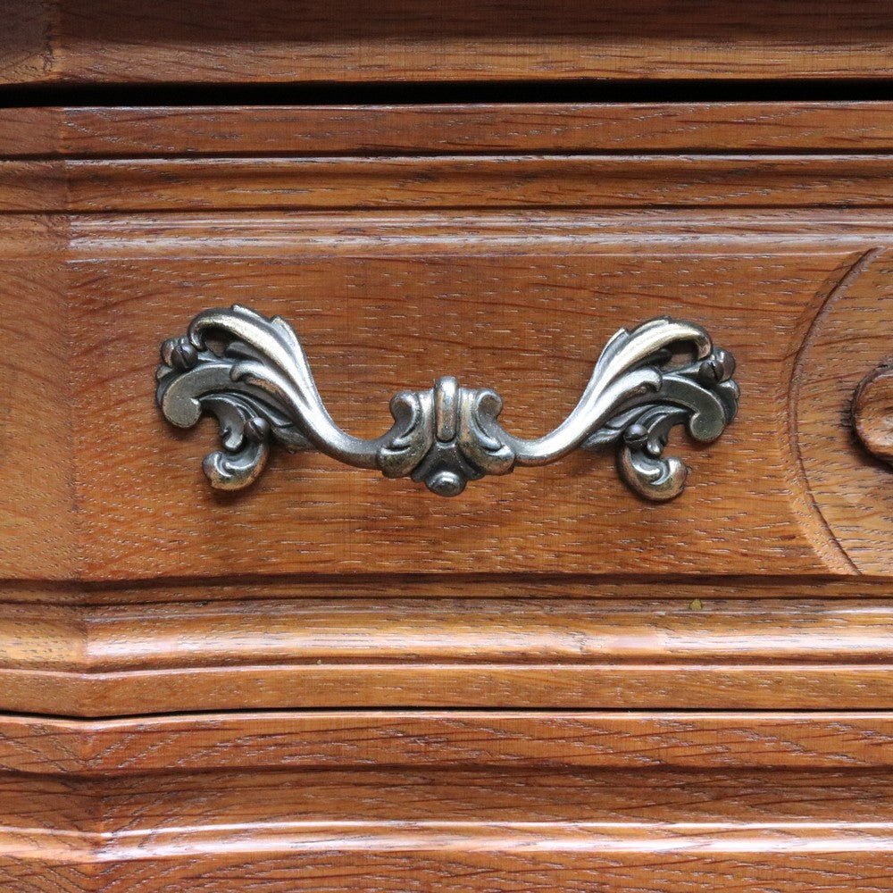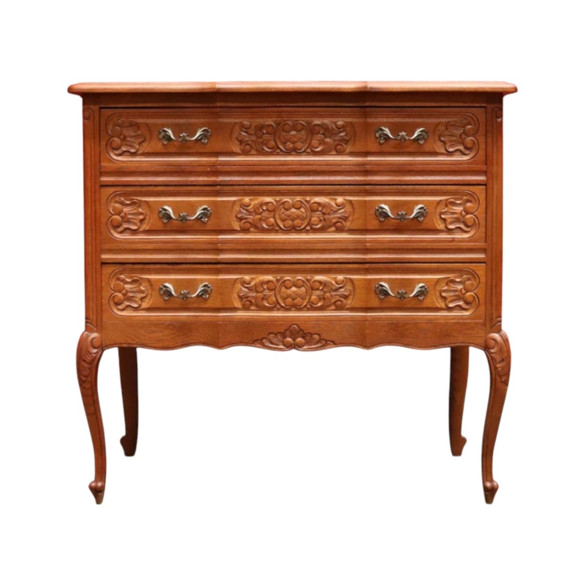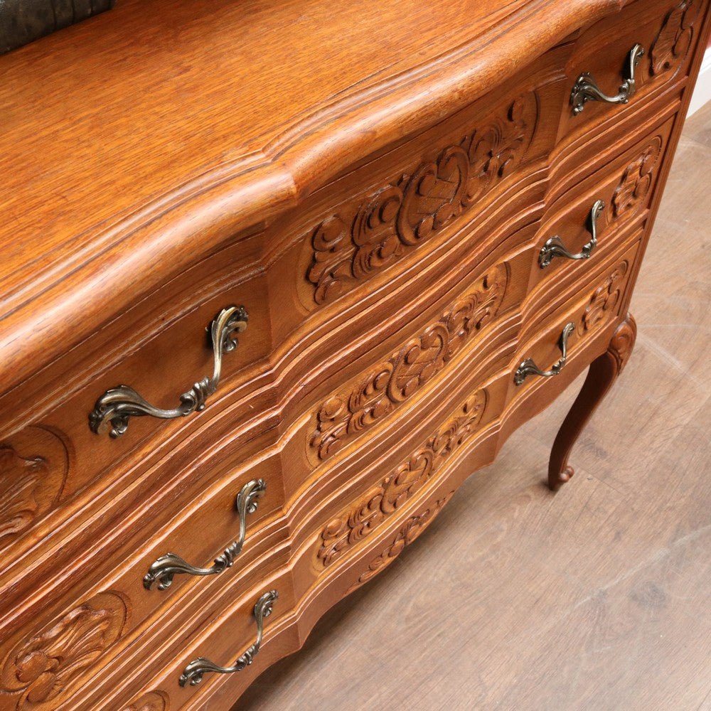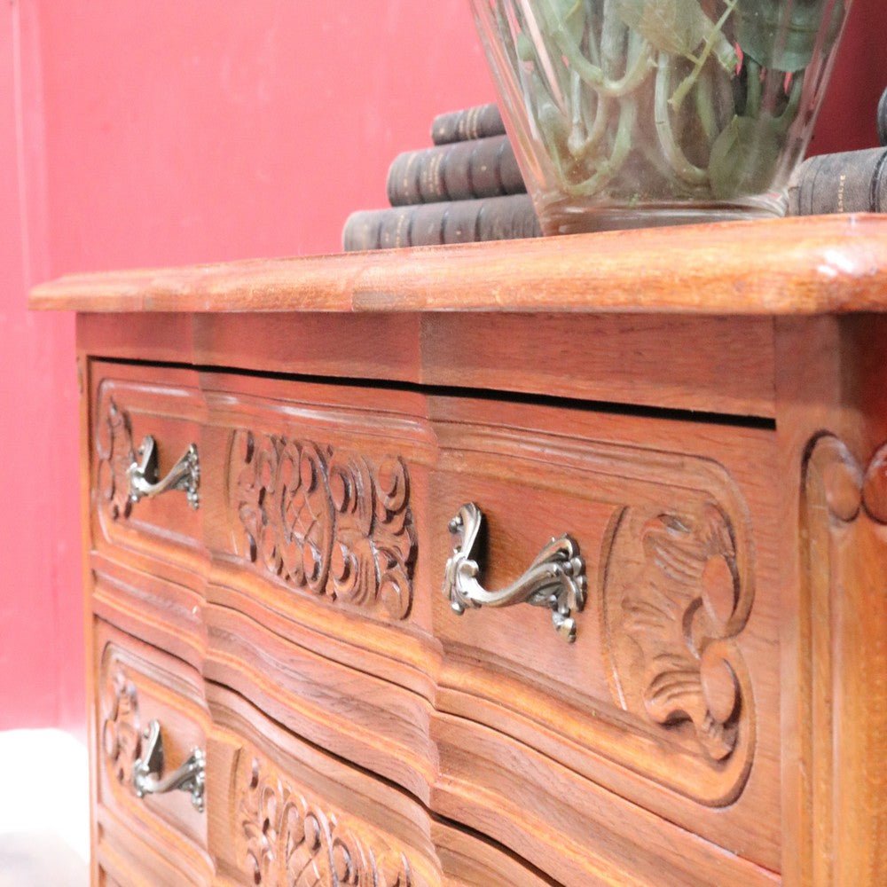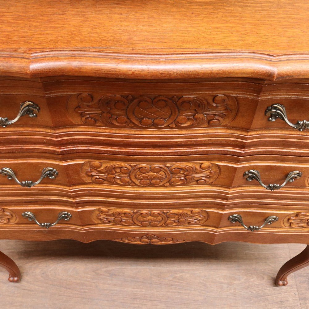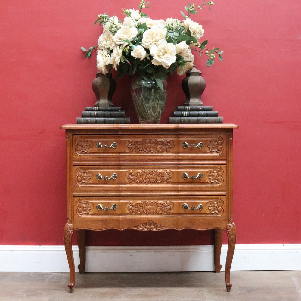 Description: A French oak chest of three drawers, vintage circa 1950s, featuring a shaped front and elegant proportions. The three drawers sit above elevated legs with classic French scroll feet, and are finished with brass handles. A versatile piece well suited for use as a hall cabinet or in the bedroom, offering practical storage with distinctive French character.