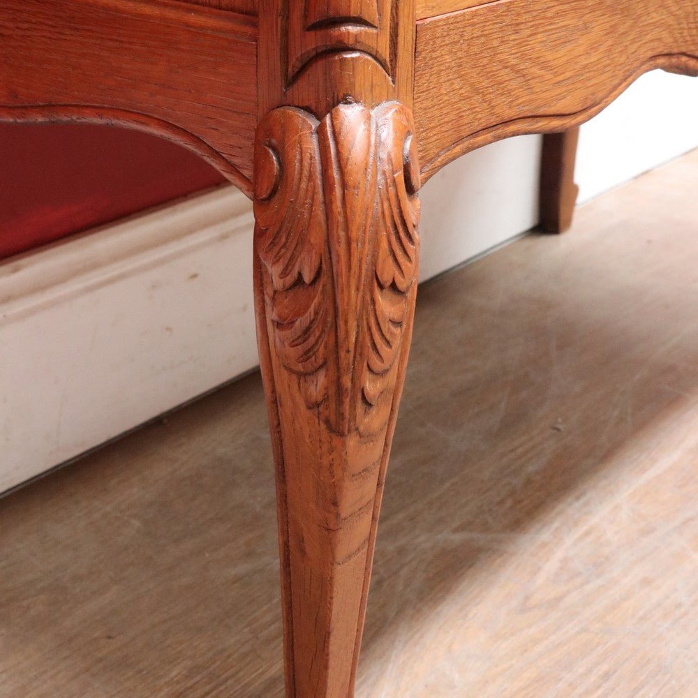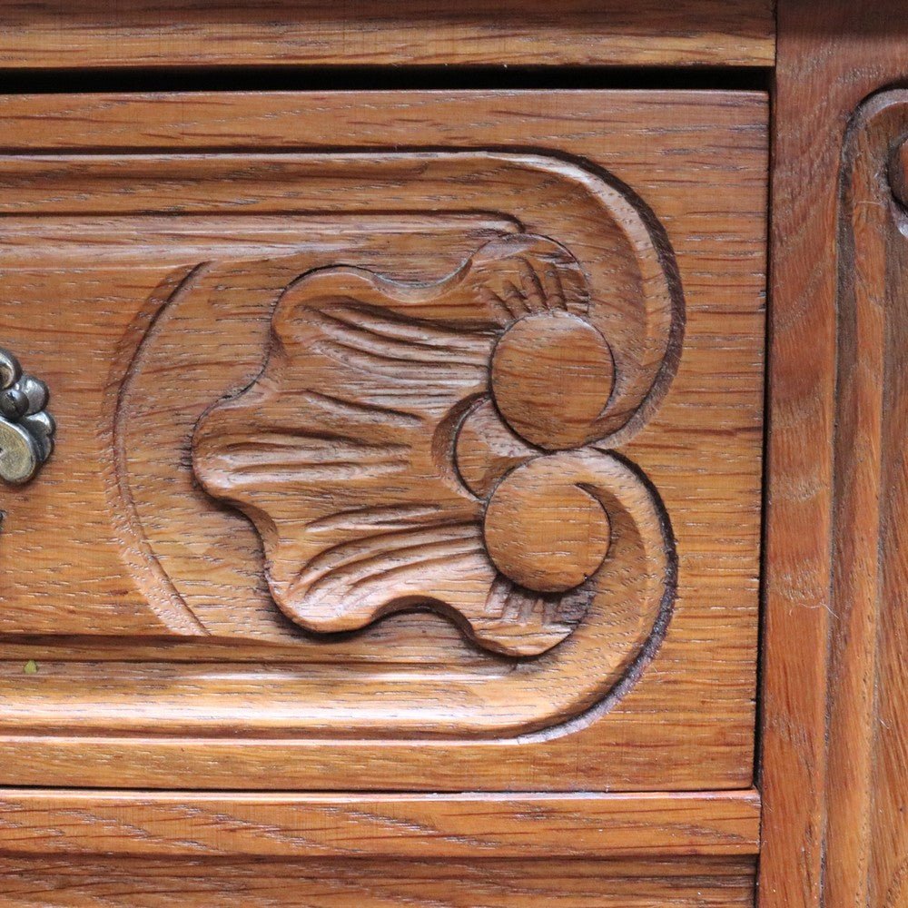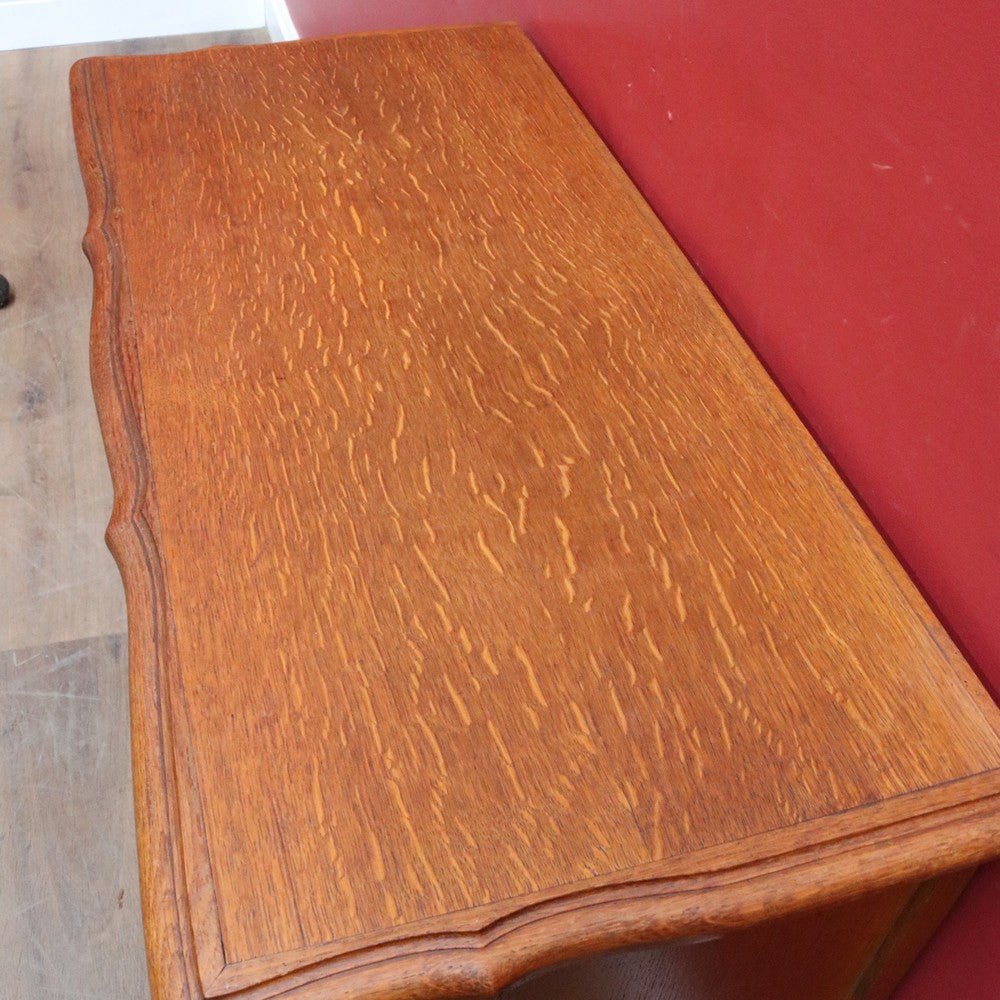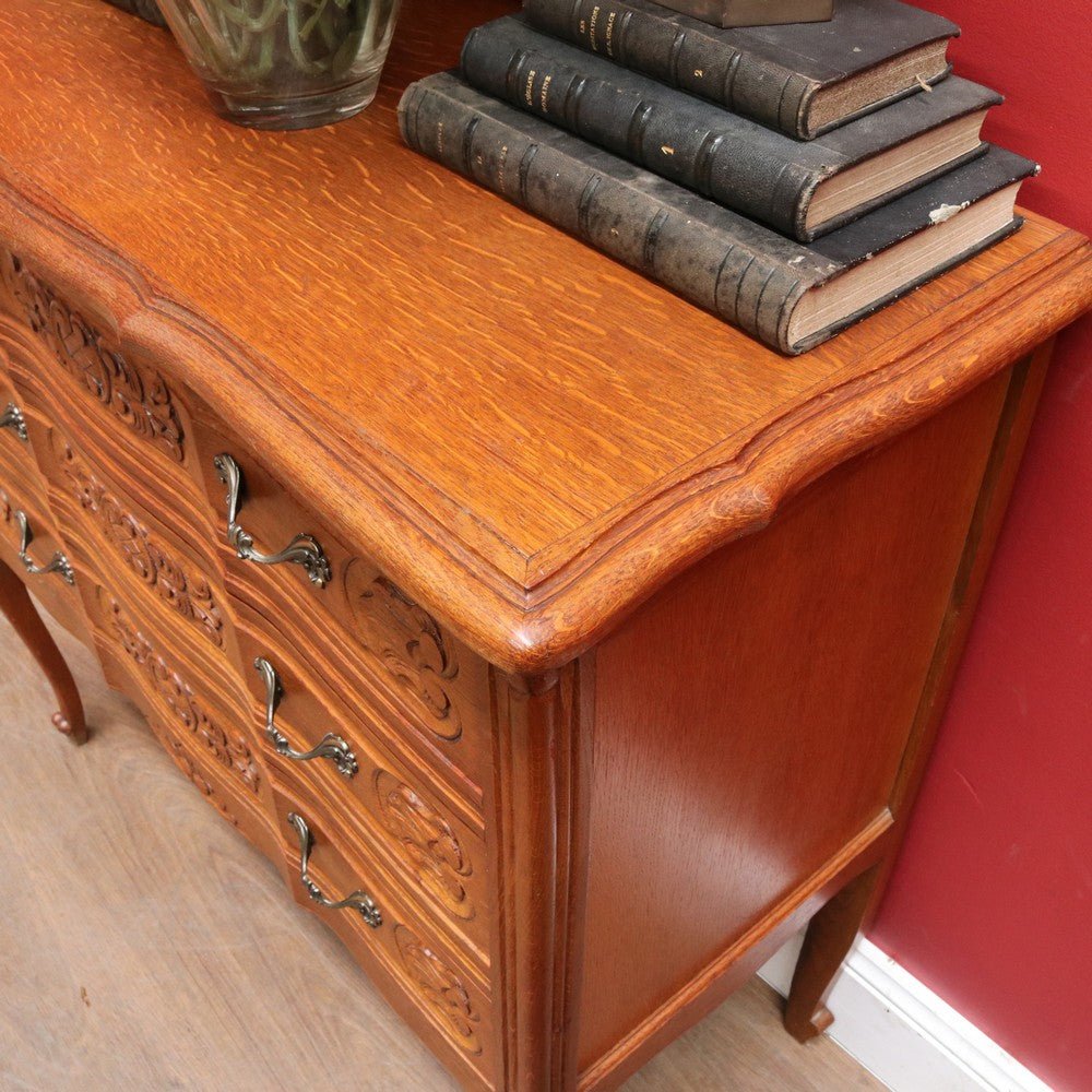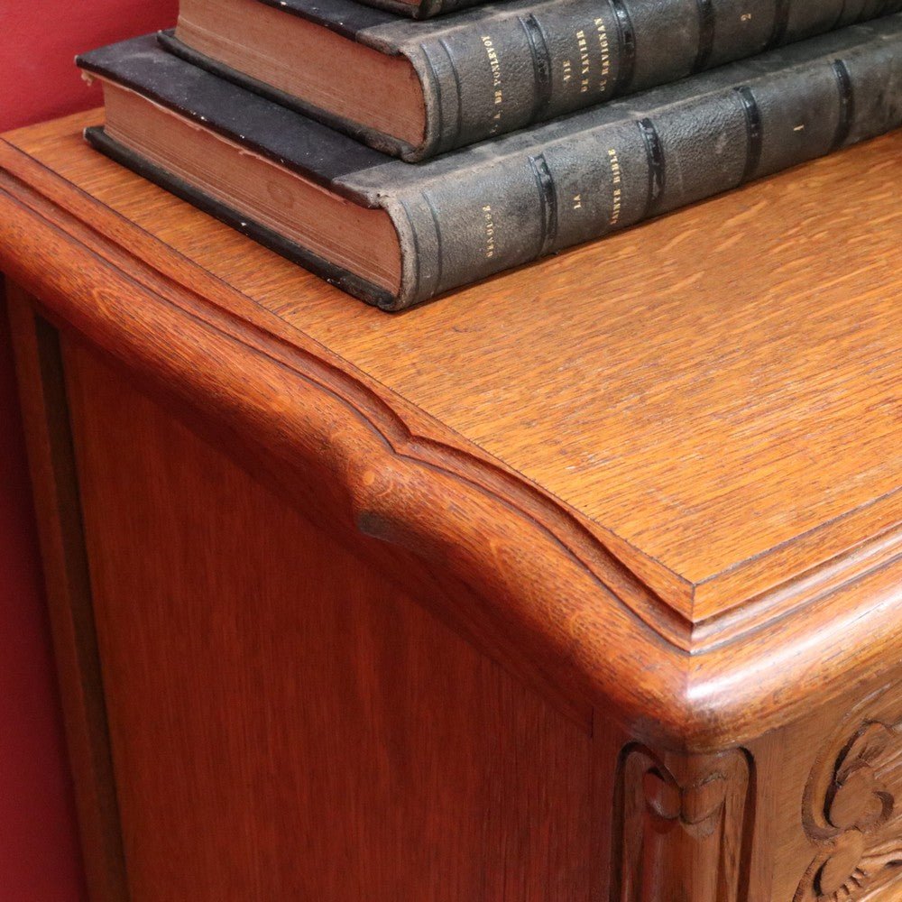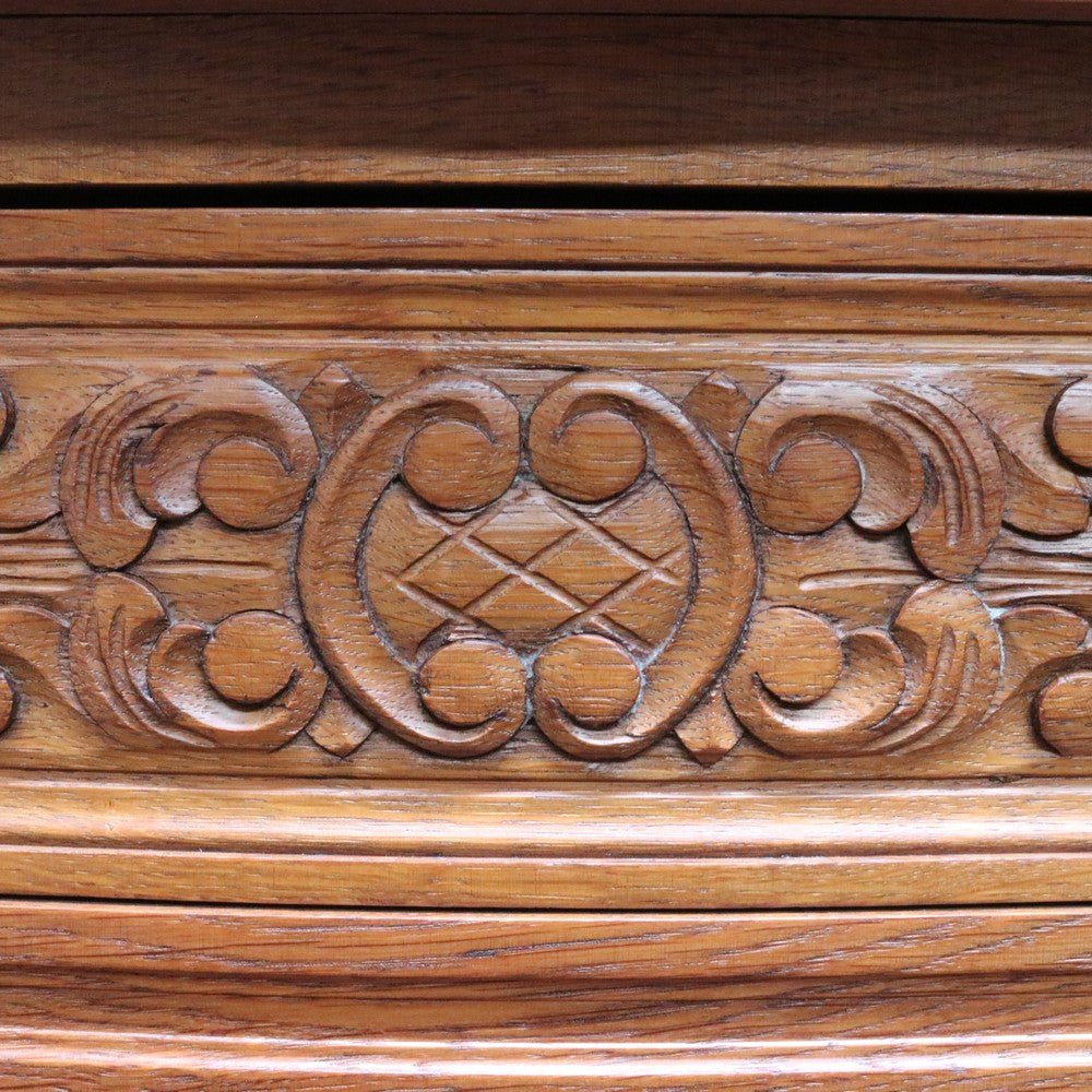 Description: A French oak chest of three drawers, vintage circa 1950s, featuring a shaped front and elegant proportions. The three drawers sit above elevated legs with classic French scroll feet, and are finished with brass handles. A versatile piece well suited for use as a hall cabinet or in the bedroom, offering practical storage with distinctive French character.