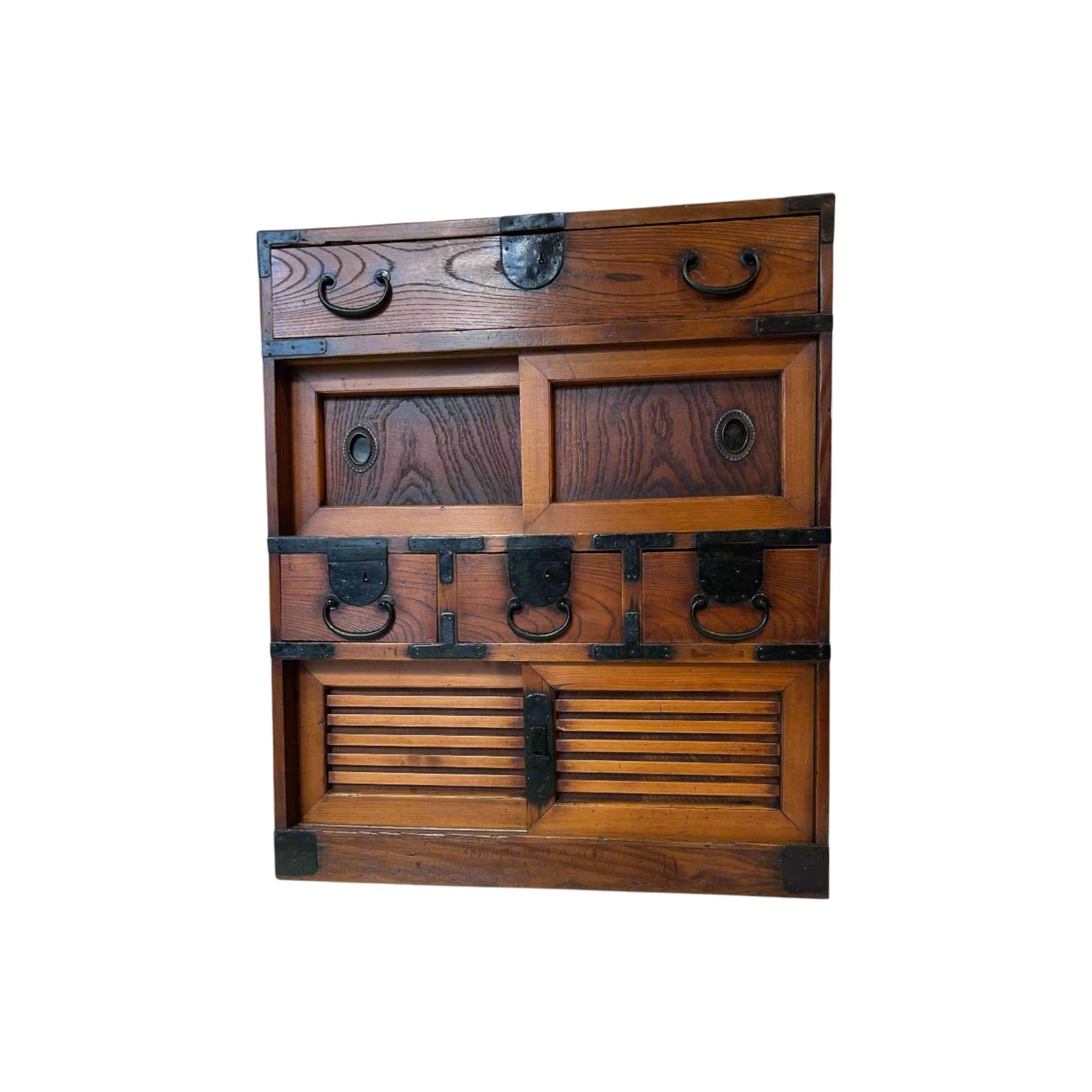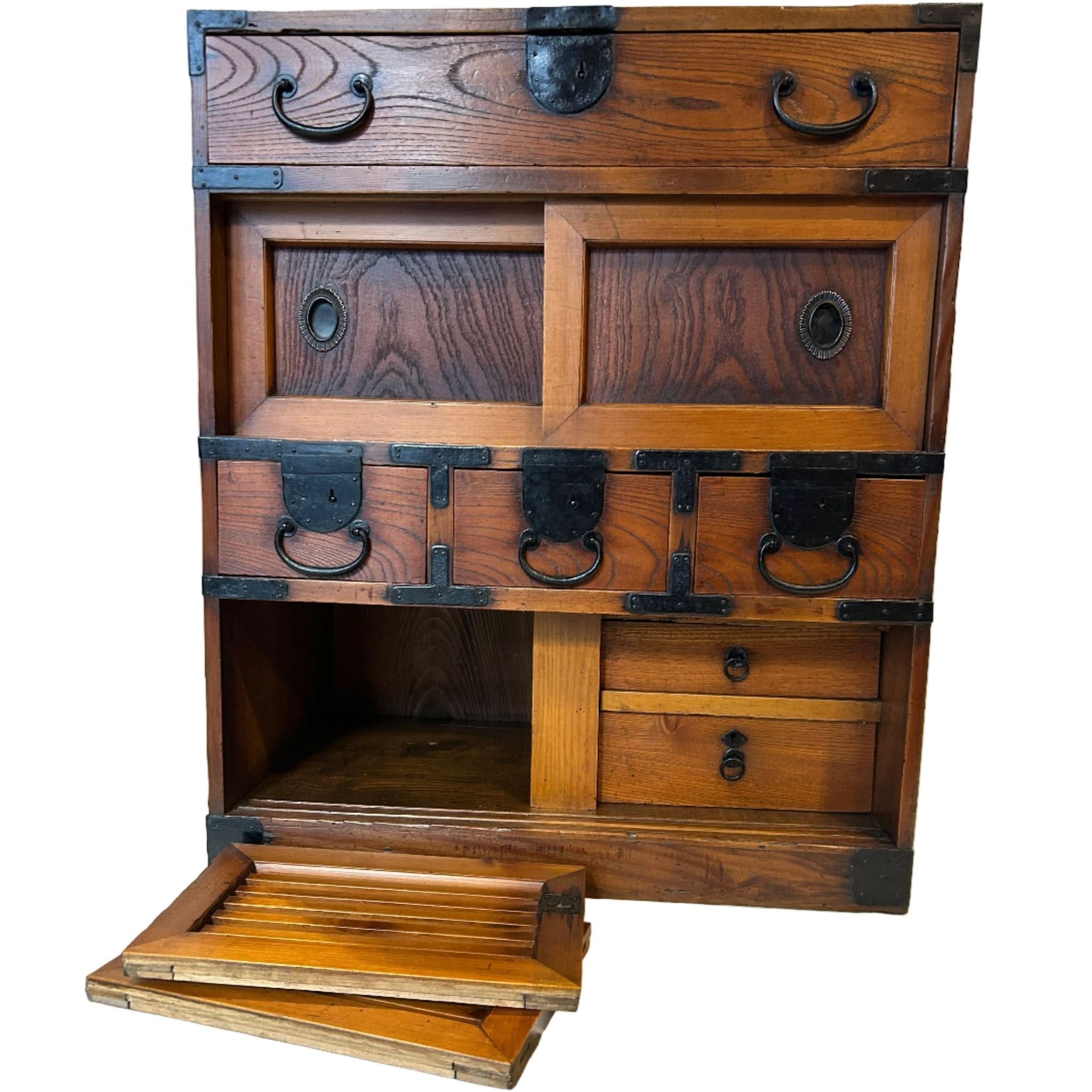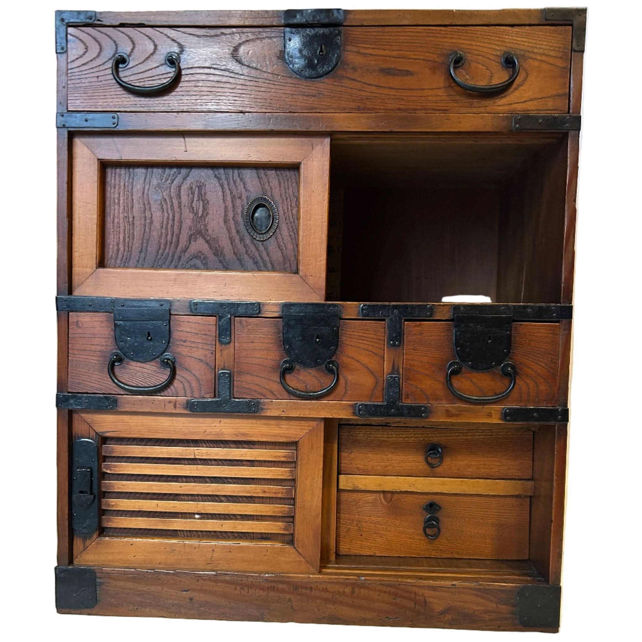 A Japanese shop storage chest (choba-dansu) with a hidden secret compartment (as shown in the photographs. Made cypress wood case with zelkova wood drawer fronts and paneling. Cedar interior with iron hardware. MEIJI period late 19thC.