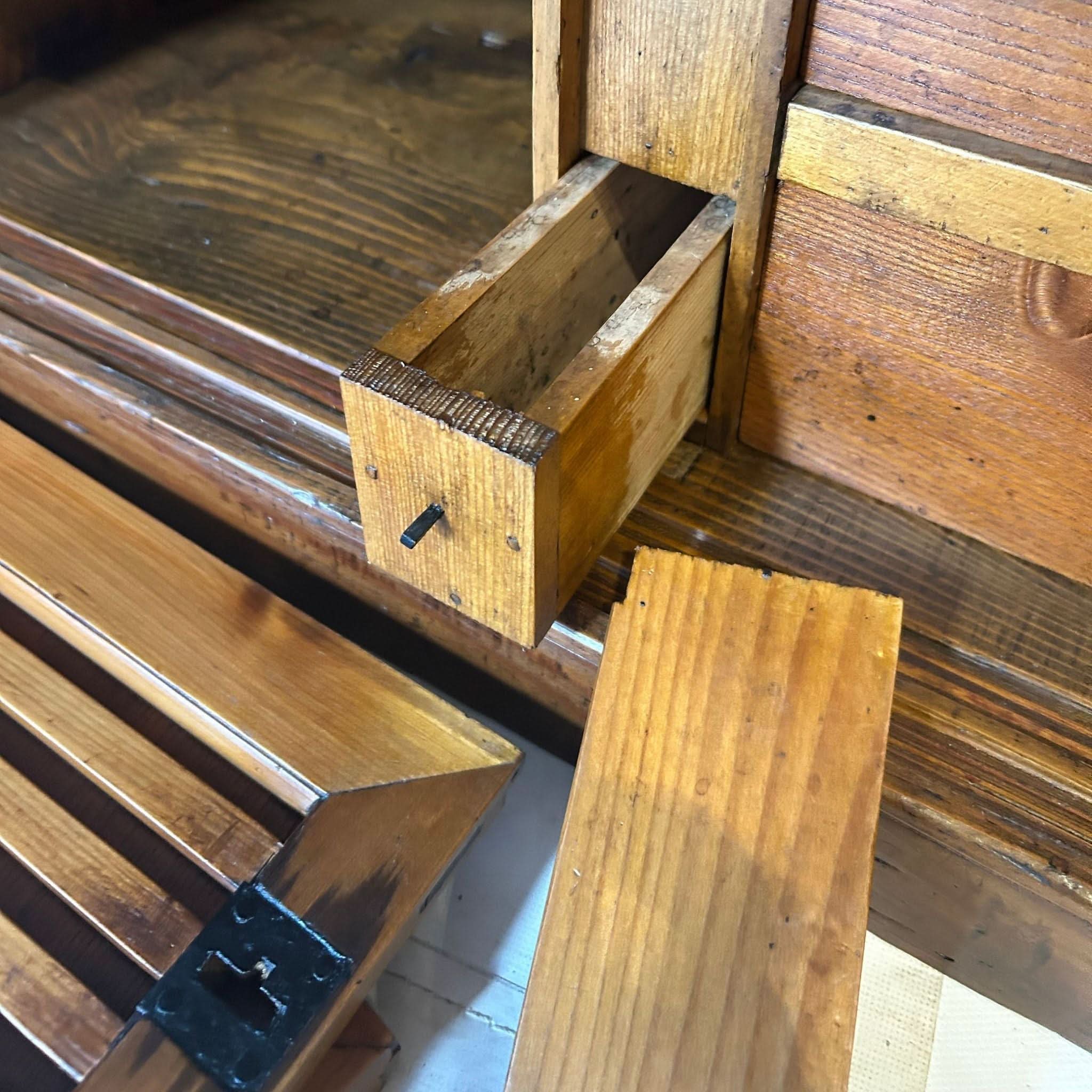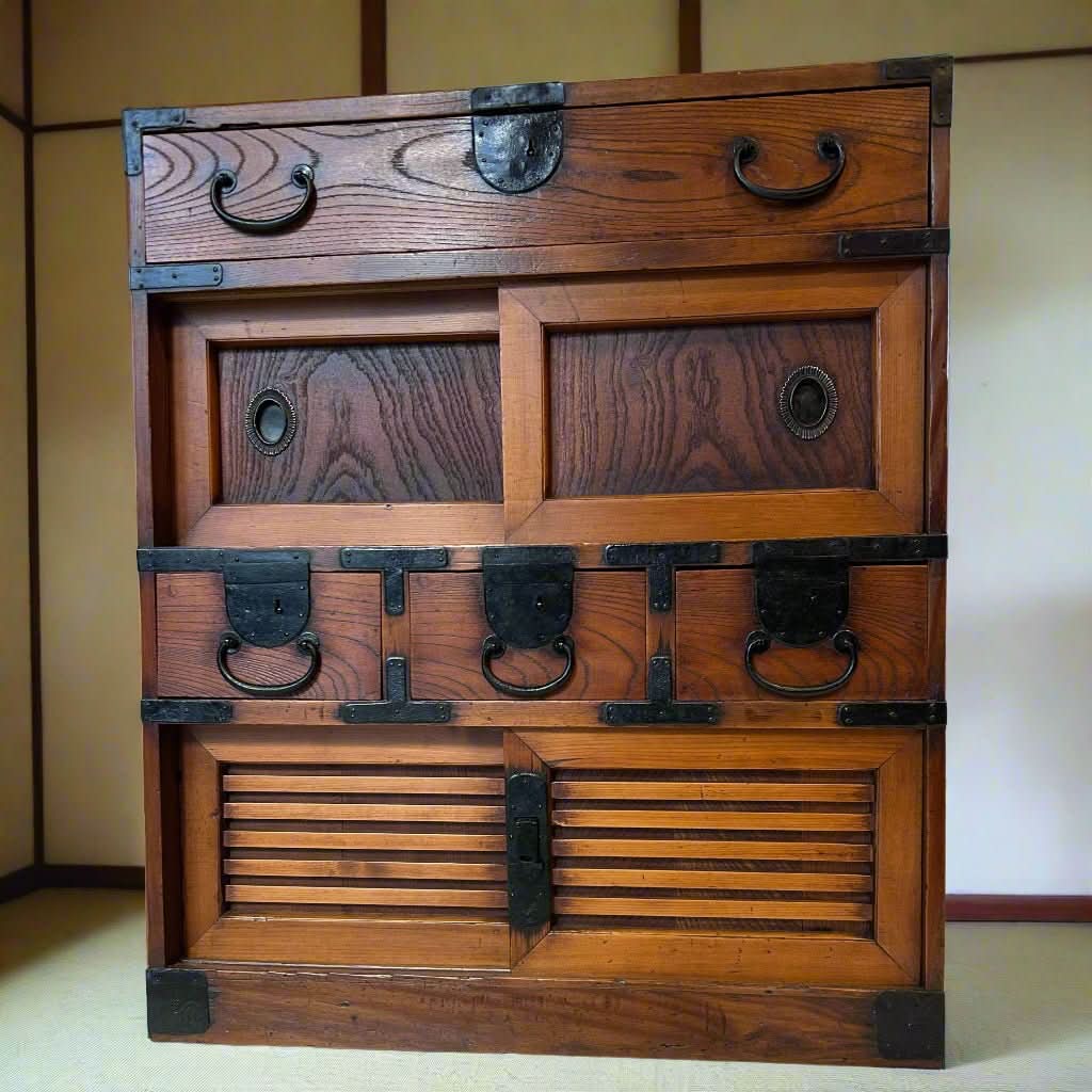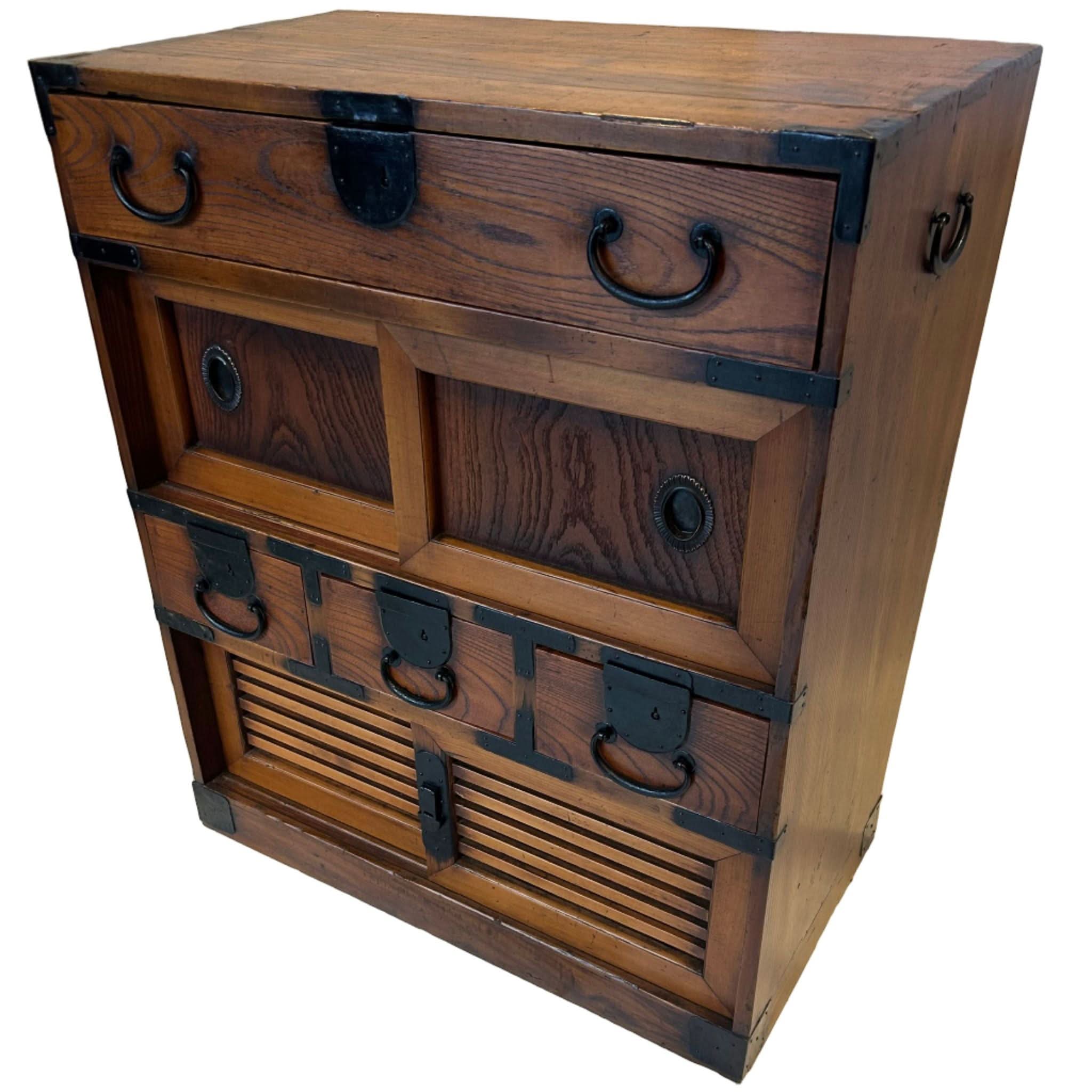 A Japanese shop storage chest (choba-dansu) with a hidden secret compartment (as shown in the photographs. Made cypress wood case with zelkova wood drawer fronts and paneling. Cedar interior with iron hardware. MEIJI period late 19thC.