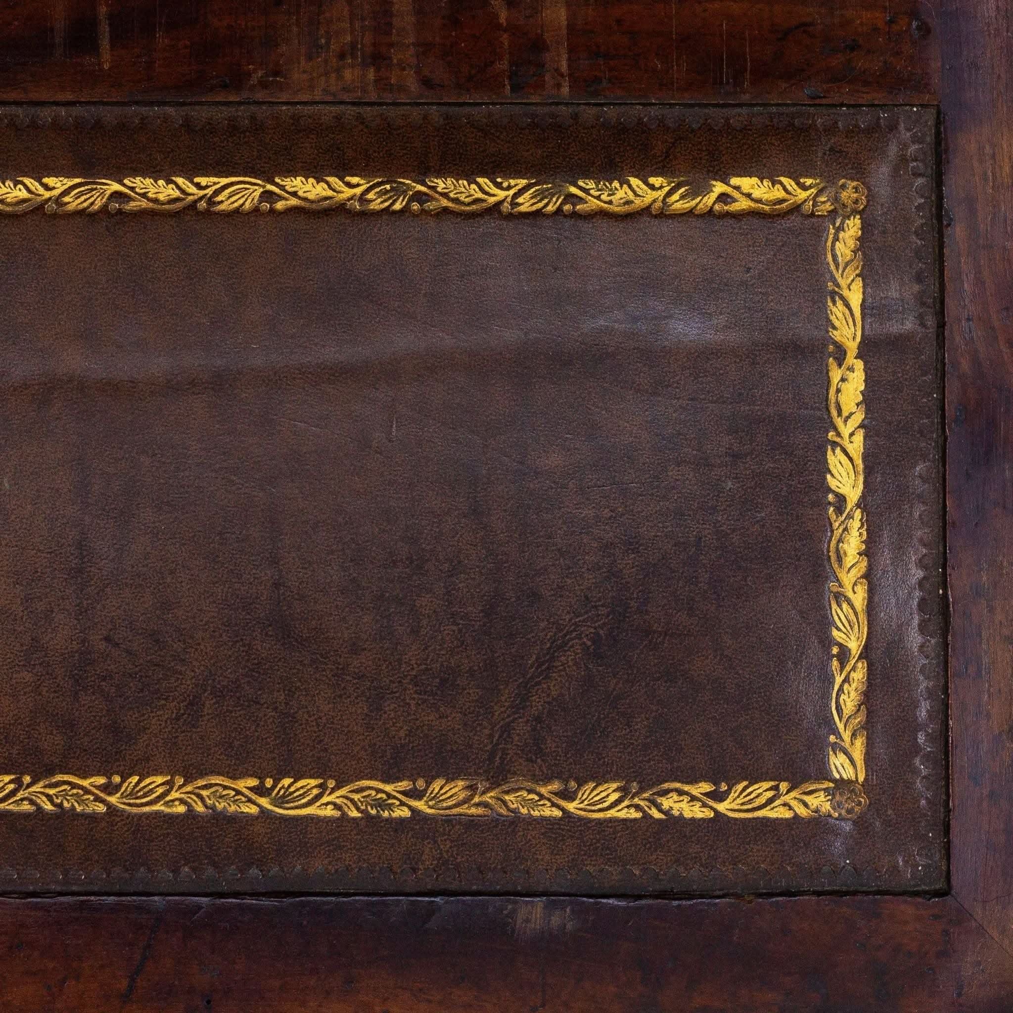 A mahogany veneered bed step with a storage cupboard and hidden commode, sans porcelain. The steps are inlaid with gilt-embossed brown leather. Although this piece may never be used for its original intent, it would make a charming addition to a library or as a plant stand.