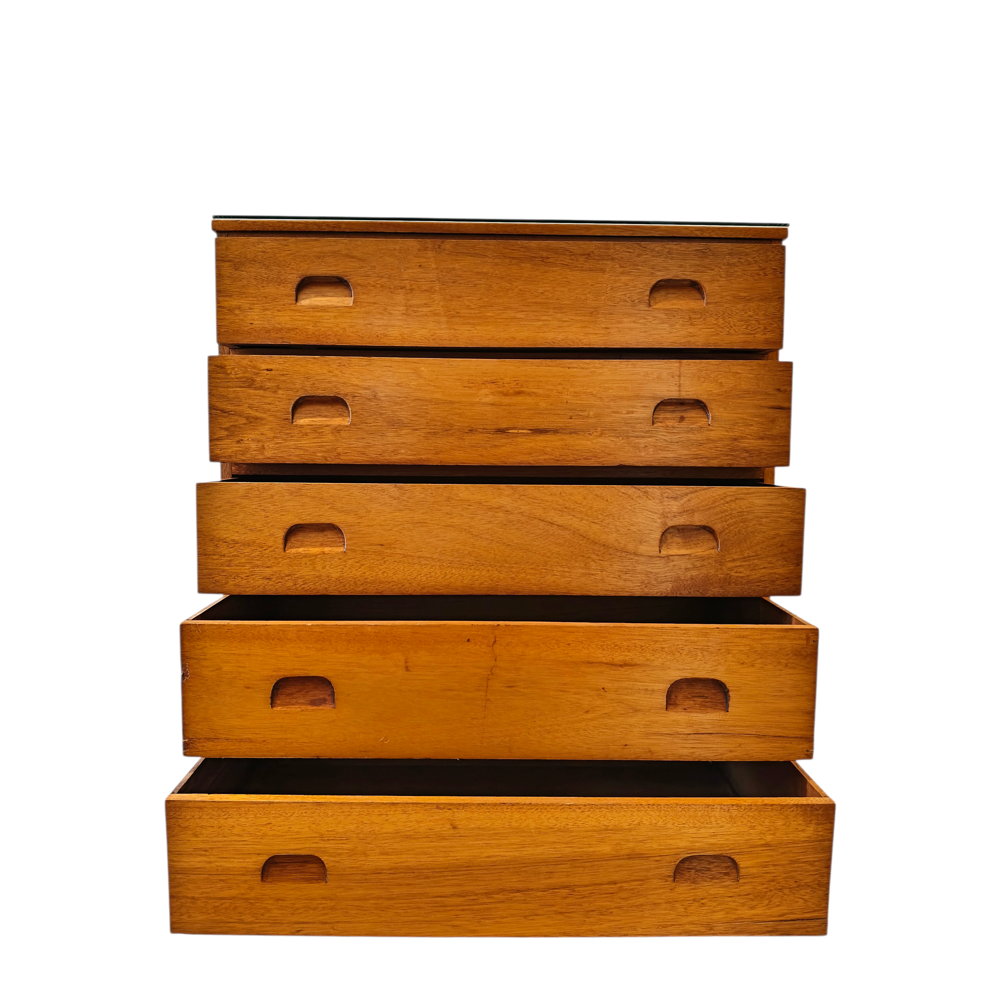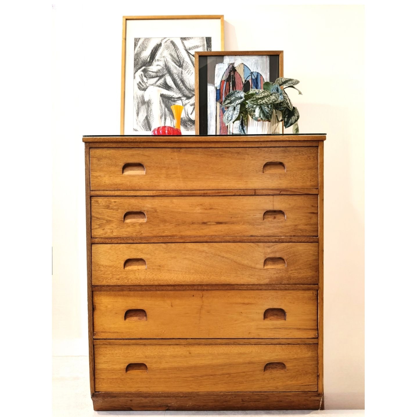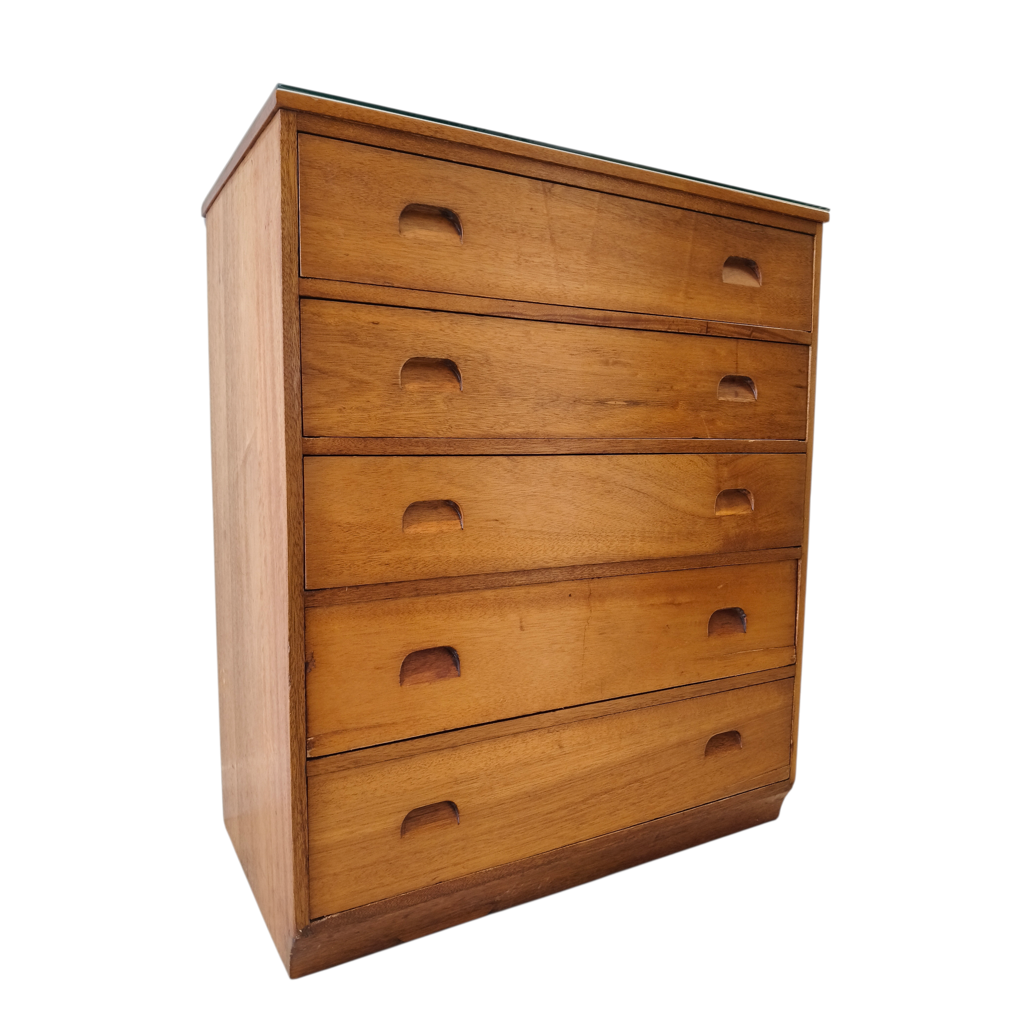Beautiful solid teak 5 drawer tallboy by Antony Hordern & Sons Ltd. Overall amazing condition bar a few knicks. Refer to photos. Comes with glass top in perfect condition. Solid and heavy.