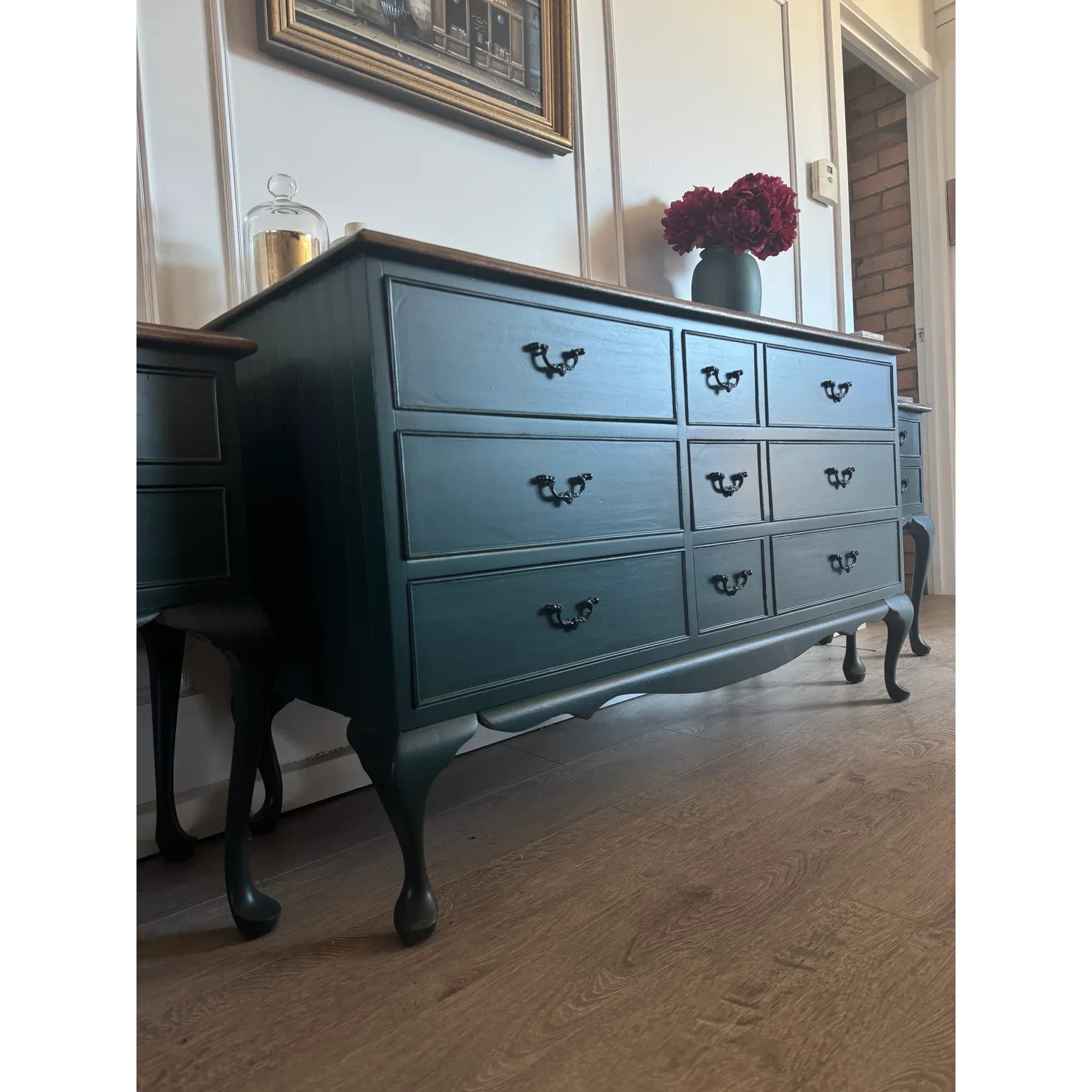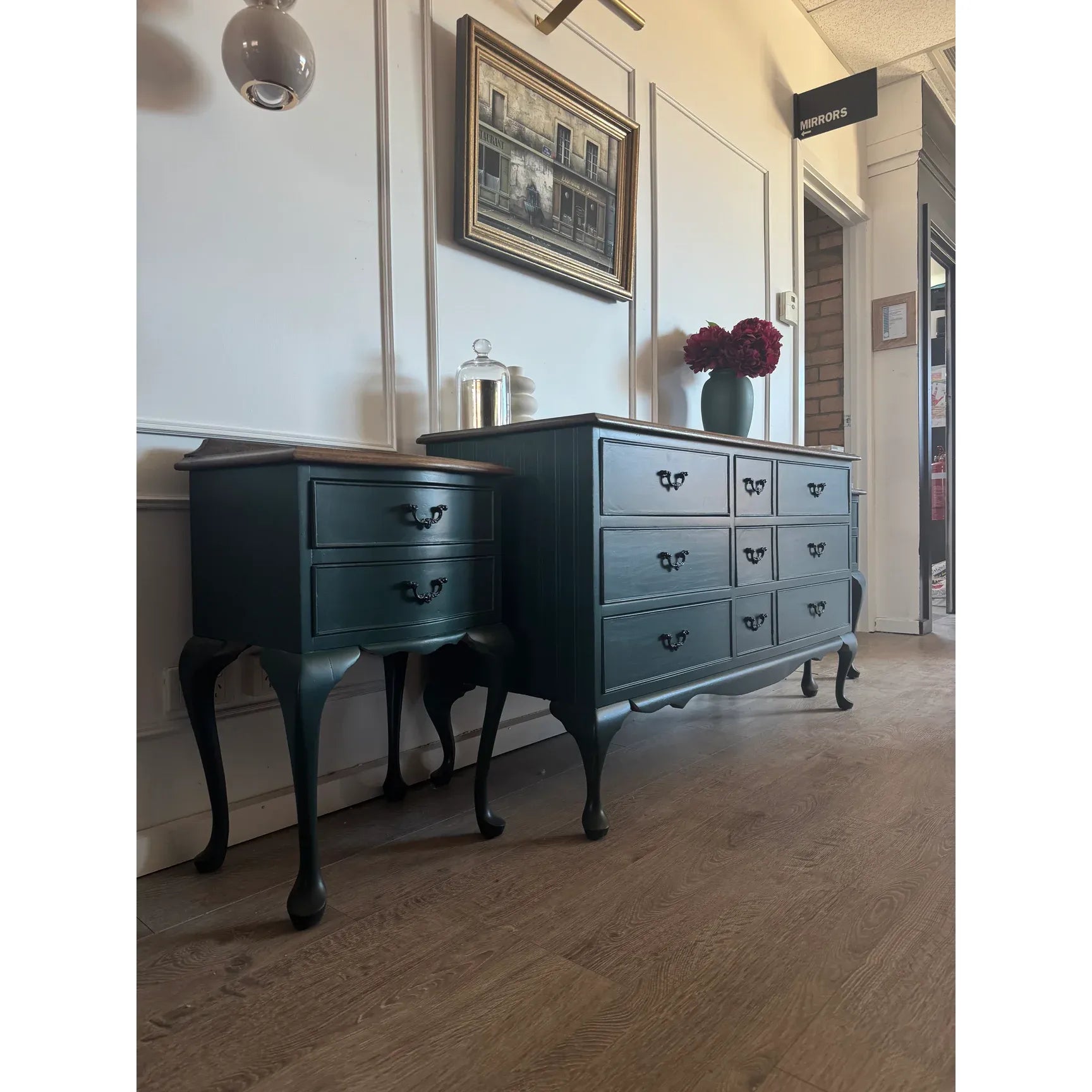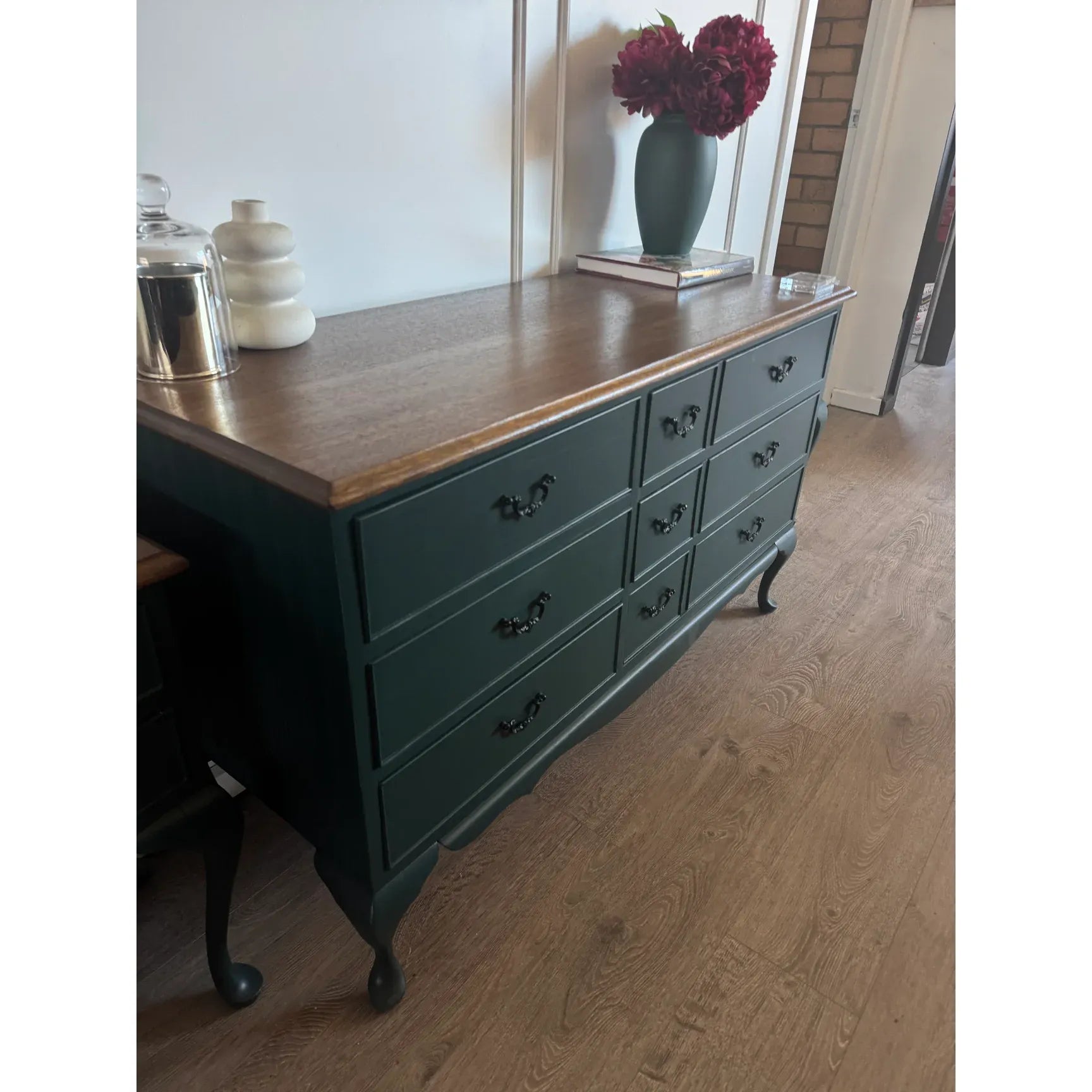 This gorgeous solid wood Queen Anne piece in a stunning green hue has 6 drawers with three being a double drawer.