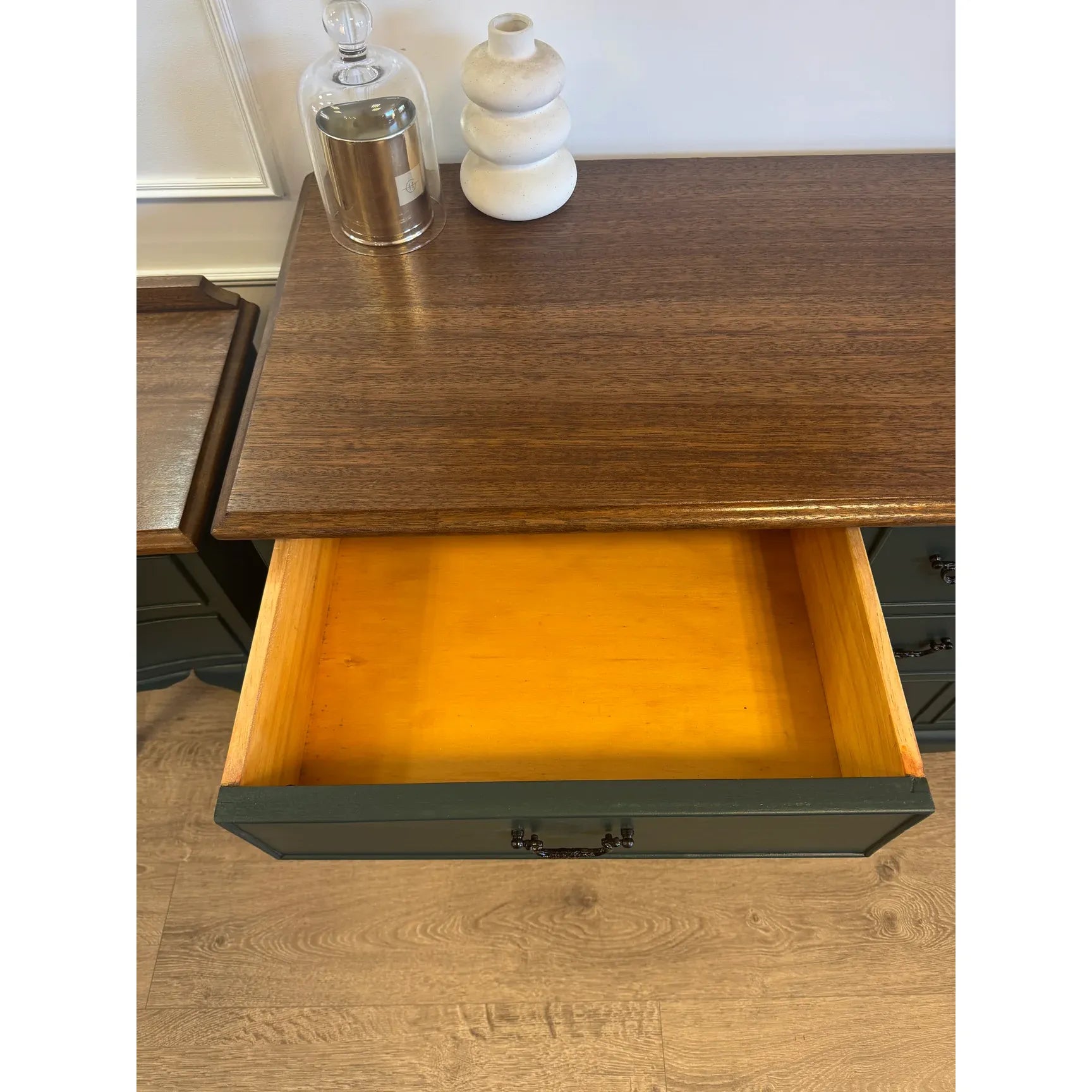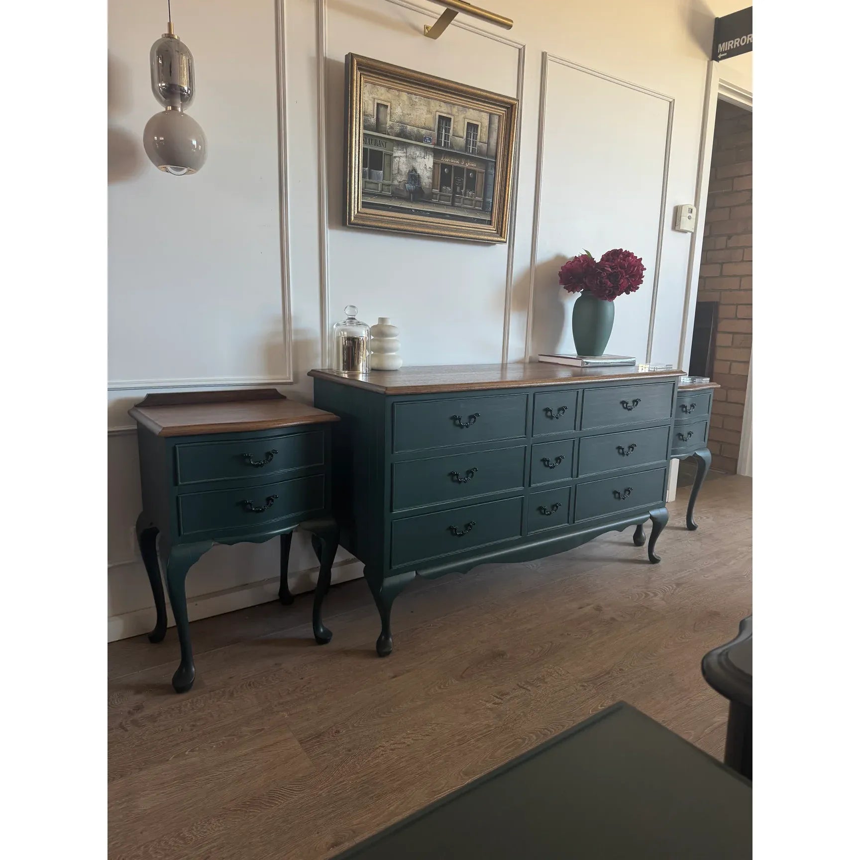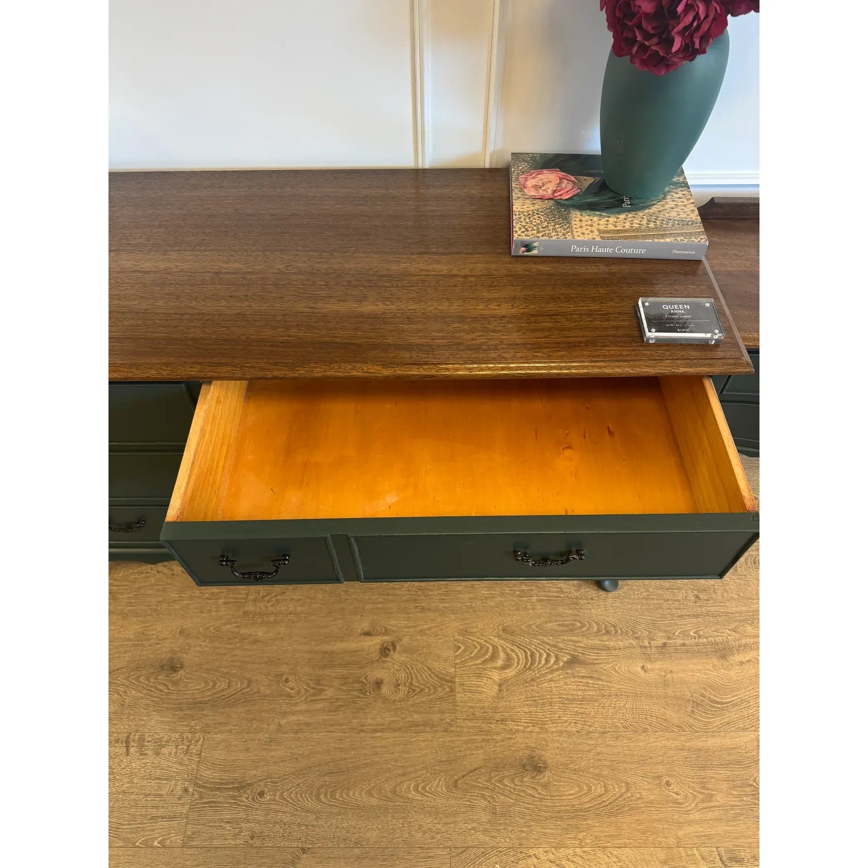 This gorgeous solid wood Queen Anne piece in a stunning green hue has 6 drawers with three being a double drawer.