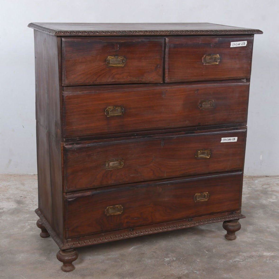 This lovely warmly patinated Indian chest of drawers is in a colonial European style but the carved detailing of the top and base reflects a typically Eastern love of ornament, restrained as it is.