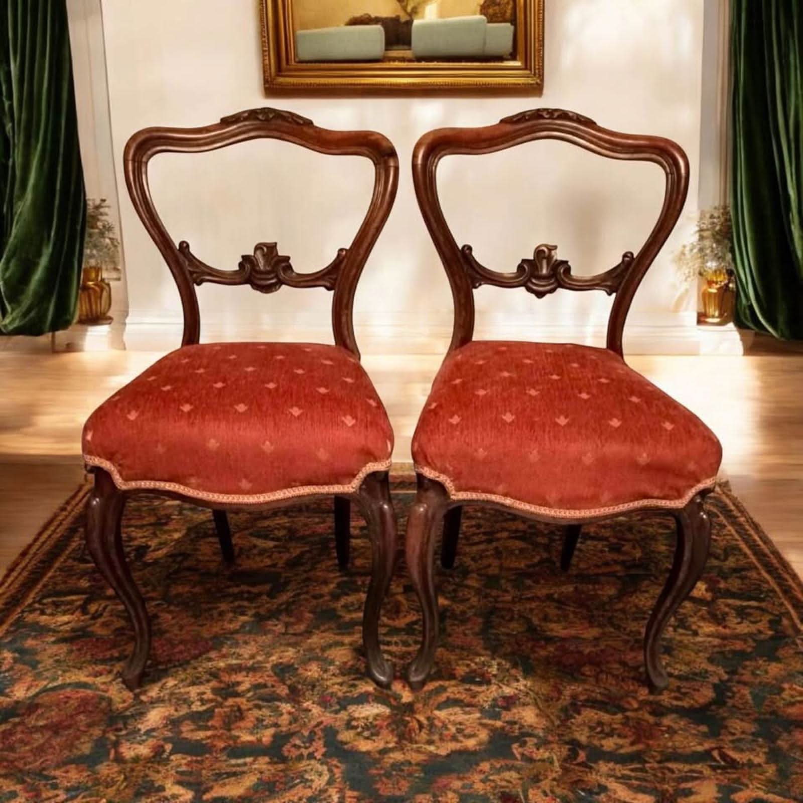 A pair of Vintage chairs red velvet reupholstered new condition. No Hold. First in first served. Pick up from Templestowe.