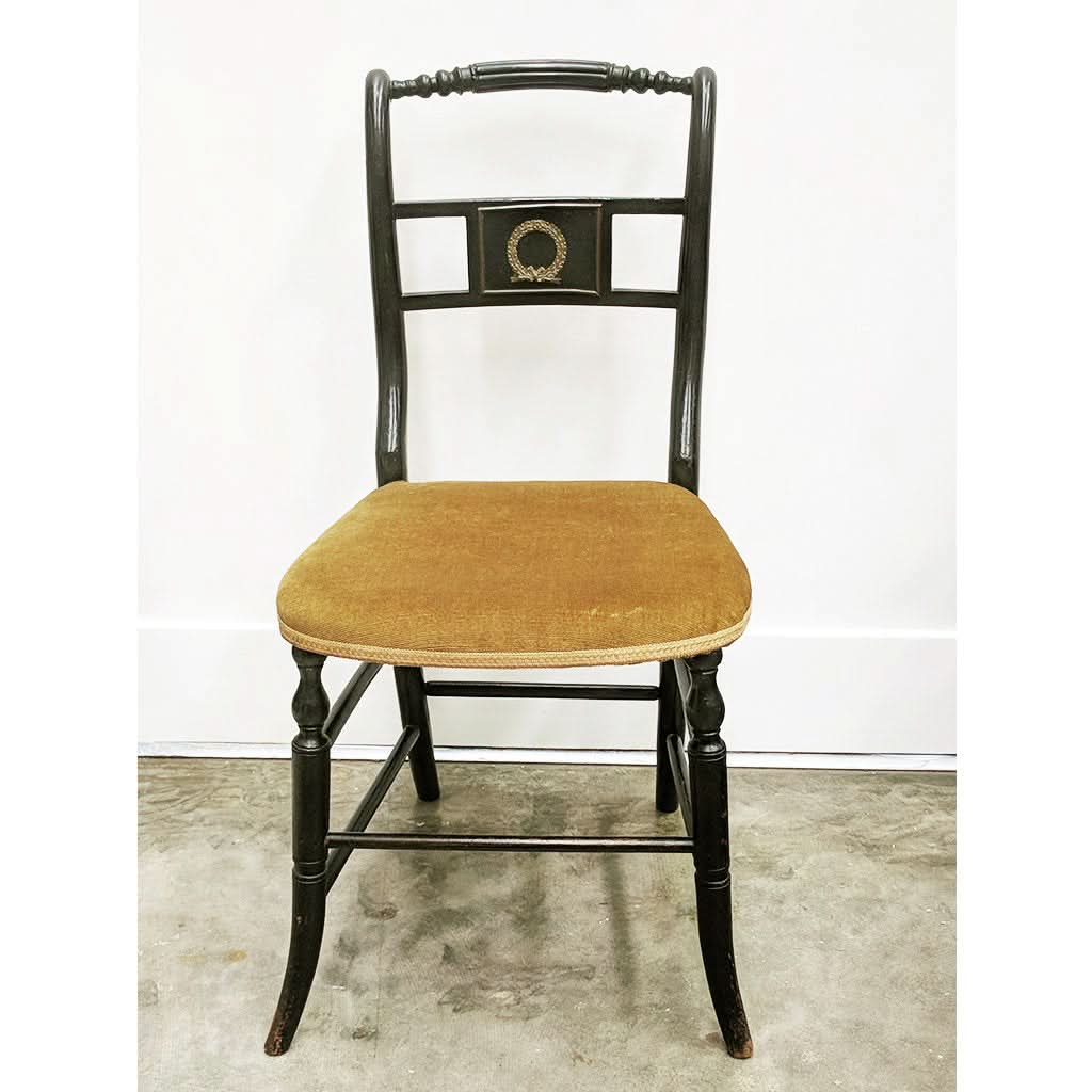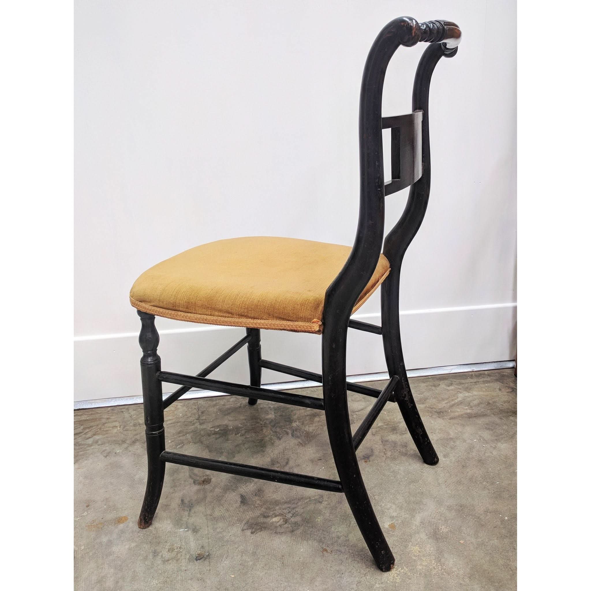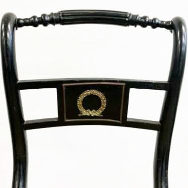 Gorgeous antique Regency chair c1820, with turned and carved detailed ebonised wooden frame, with mustard upholstery. Also featuring a decorative Ormolu wreath and border to the back rest. In very good antique condition with some signs of use commensurate with age.