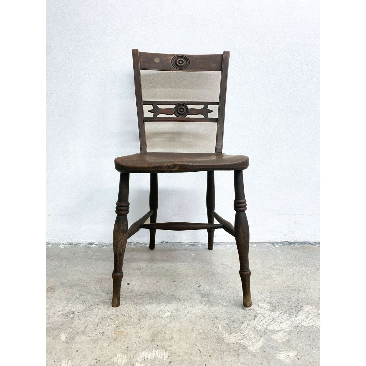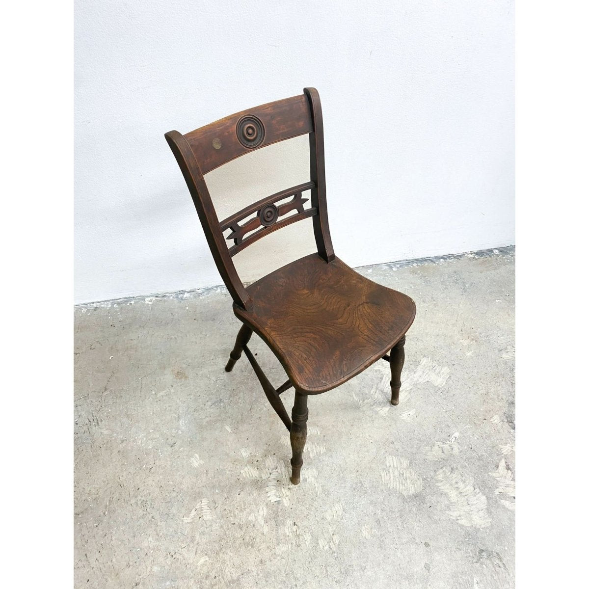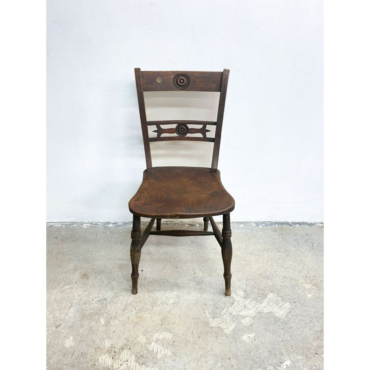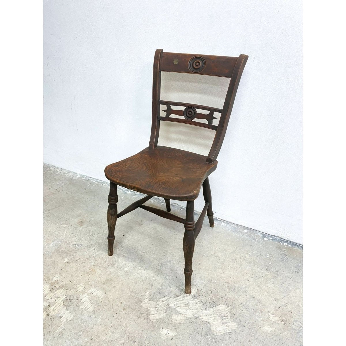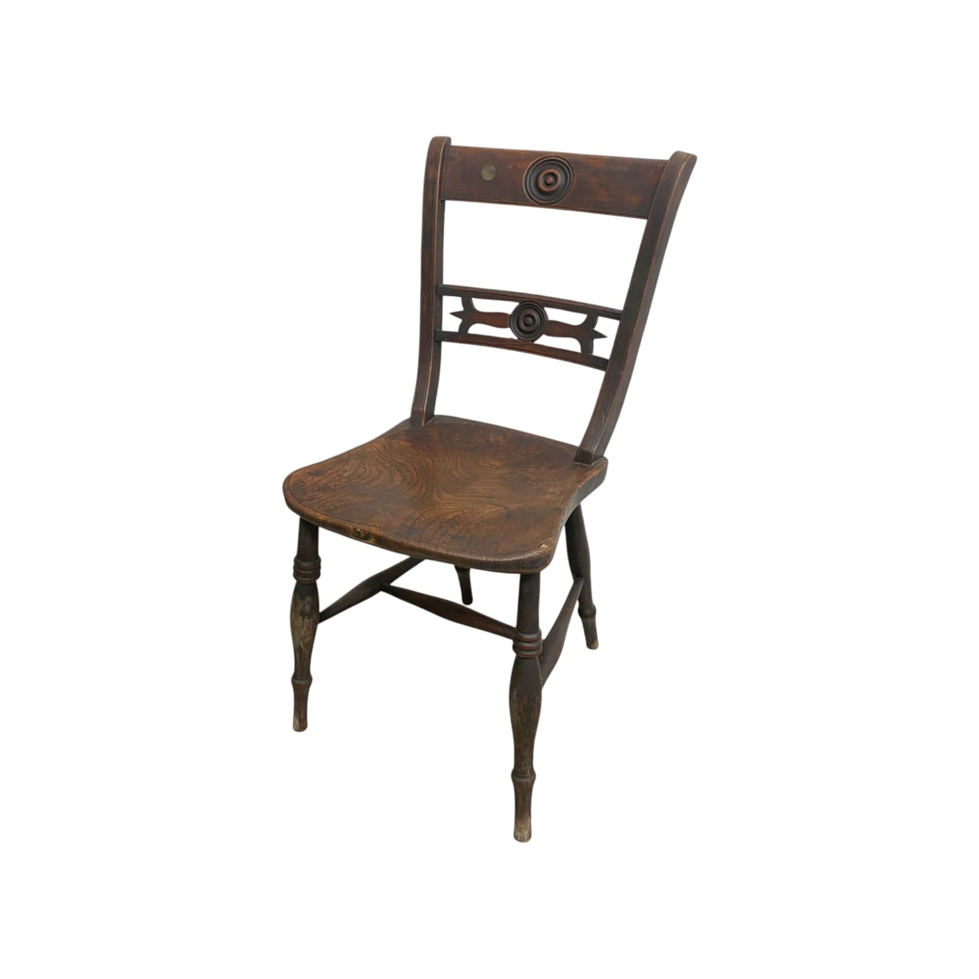 Featuring a gently curved backrest, turned spindle supports, and a sturdy seat, this chair is a perfect blend of form and function. The hand-carved details and traditional joinery make it an ideal addition to any antique or rustic-inspired setting.