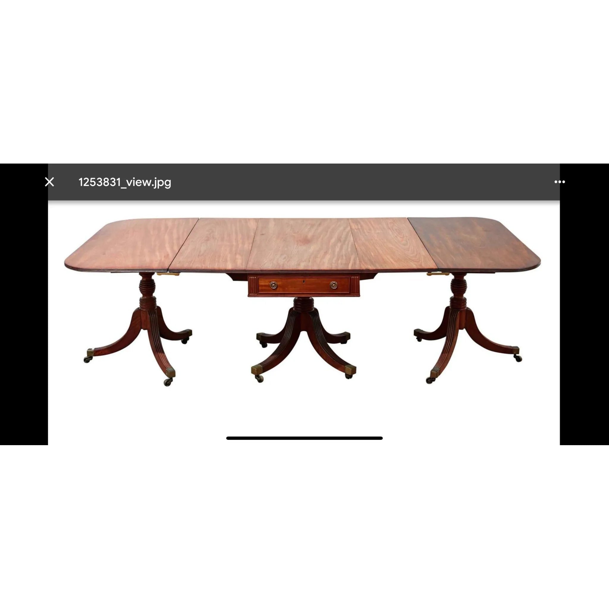 It is a genuine antique English George III circa 1800 Tri Sectional Dining Room Table and was made before the more traditional later tables that extended via a telescopic runner system.