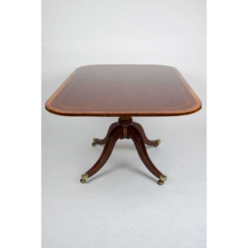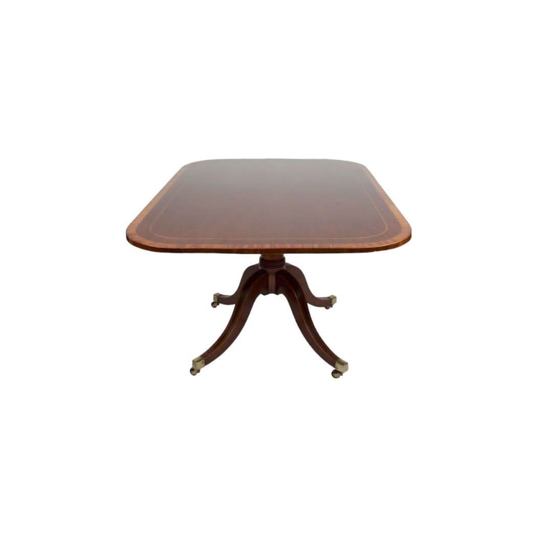 A superb example of a high quality genuine Antique English Georgian Mahogany tilt top Dning Table / Breakfast and Supper Table of rectangular form with a one piece very well figured top which has a Satinwood line inlaid and crossbanded border. The Table is supported on a central turned ‘gun barrel’ column and has four elegant down ward and outswept tapered legs which terminate in all ‘squared’ Brass toe cap and castor assemblies.