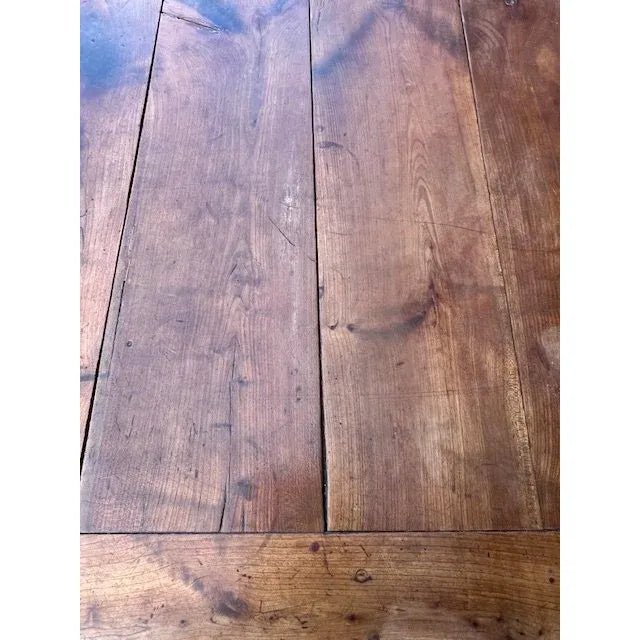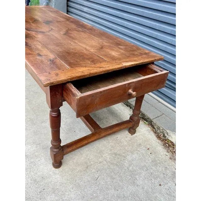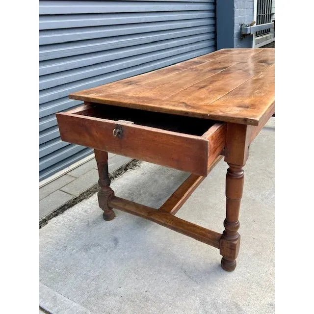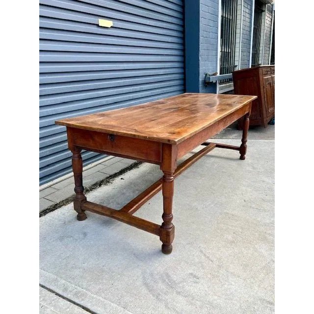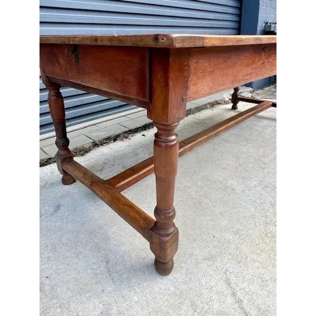 This is a good quality genuine antique French 19th century ‘Farm House’ Table. The top is of rectangular form and is comprised desirably from only four wide planks / boards of solid Cherry Wood of lovely light ‘honey’ colour and at either end of the table are ‘bread board’ ends at right angles to the main boards. Beneath the top is a full apron which has a drawer at either end with iron drawer pull knobs. The table is supported on four nicely turned legs which are all structurally connected by an ‘H’ shaped stretcher.