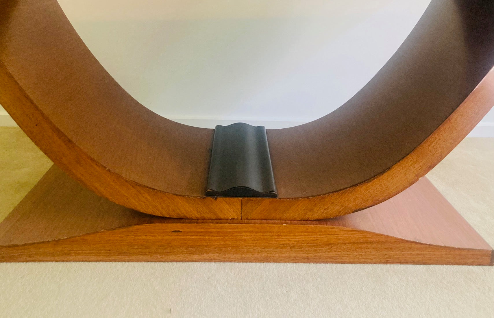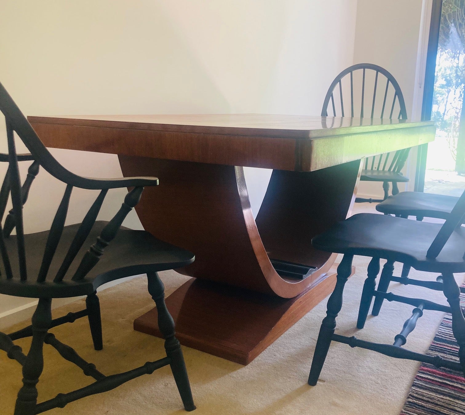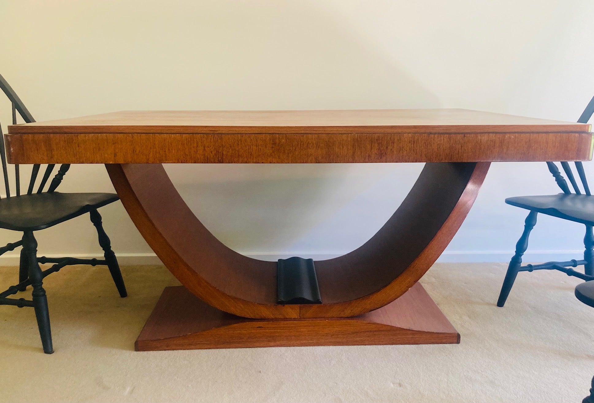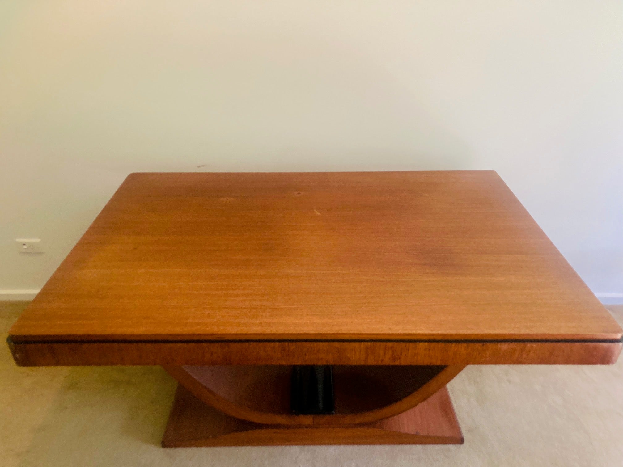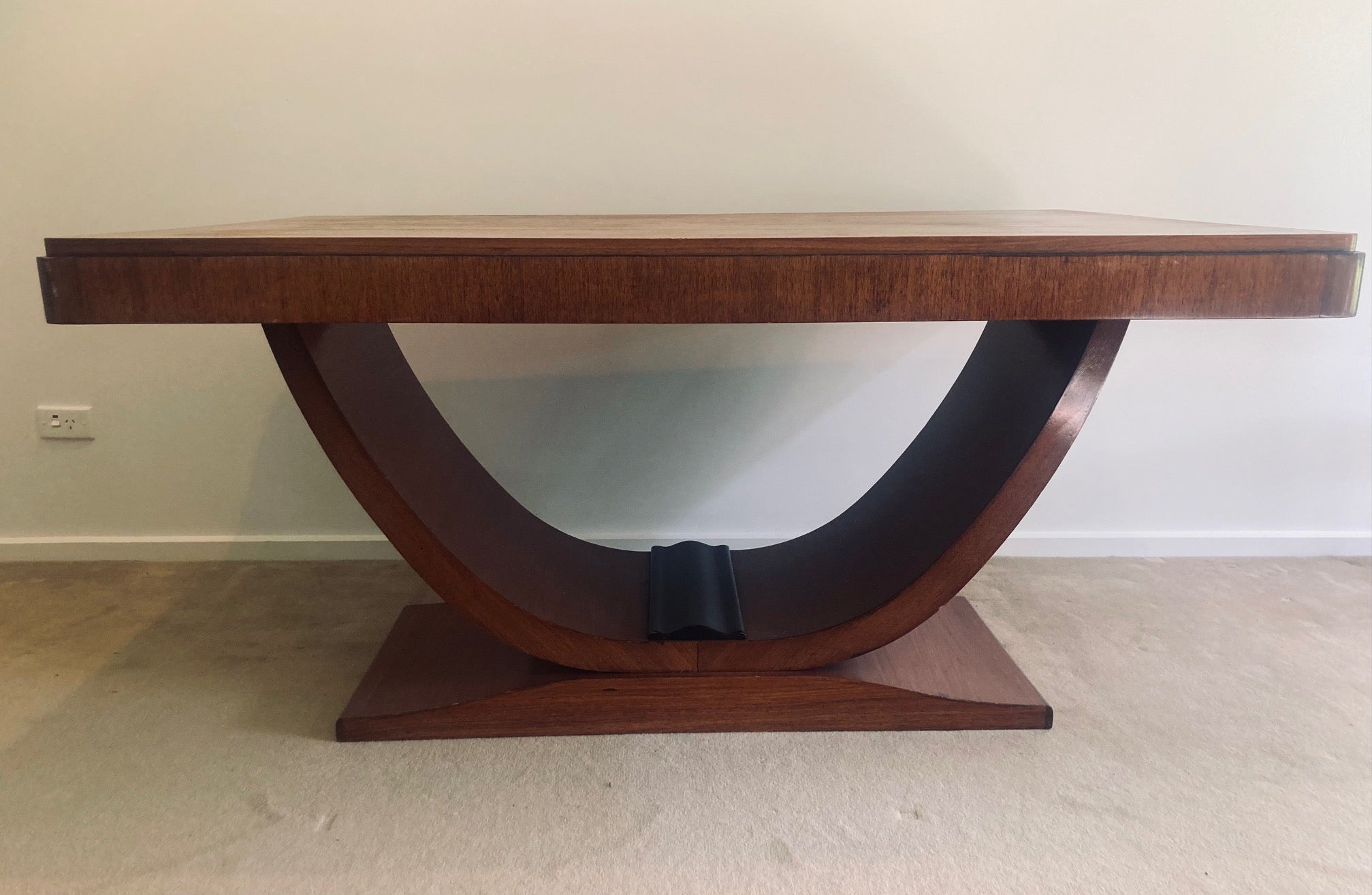 Genuine Art Deco 1920's dining table (or centre-of-room table) in walnut veneer with black detailing. I purchased to restore, but have not had the time. It is in good condition, but the top needs a light sand and revarnish. Selling at cost, as I do not have room for it - but it's a really beautiful piece.