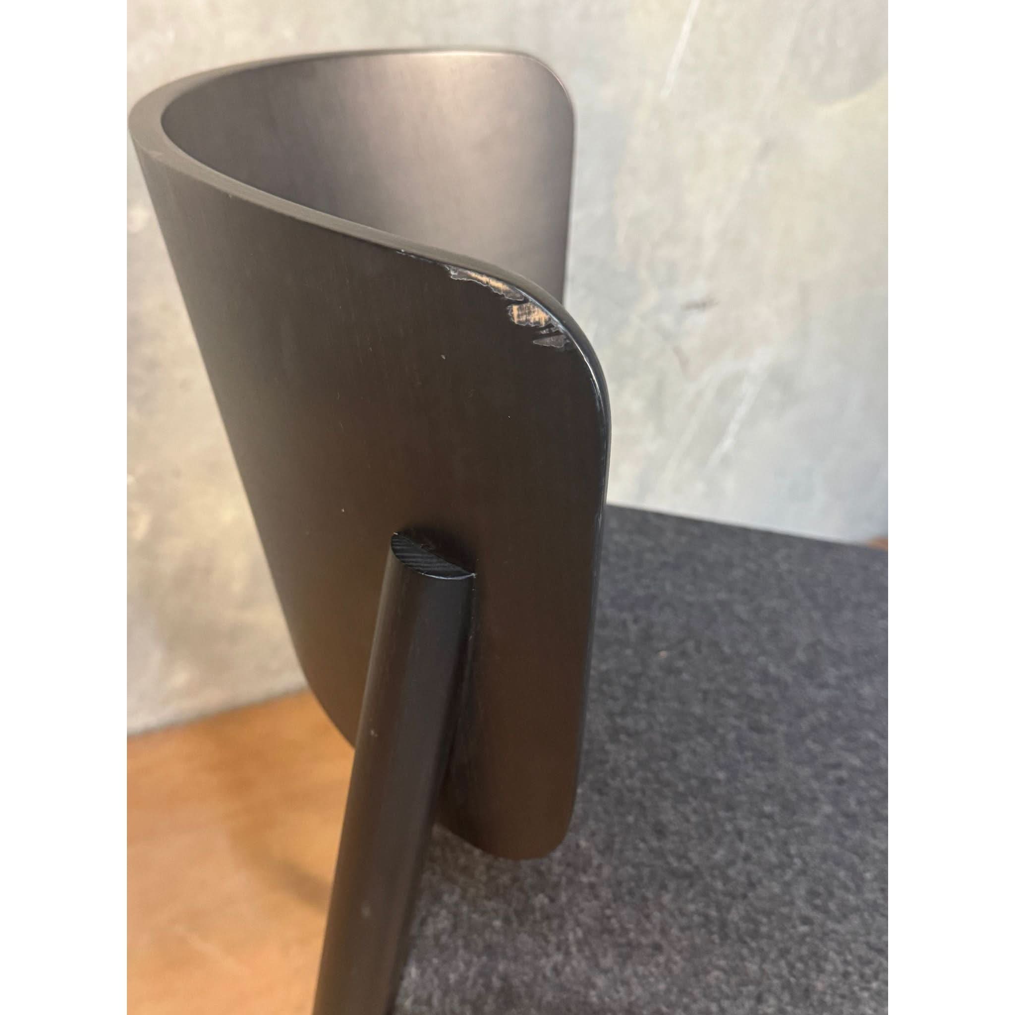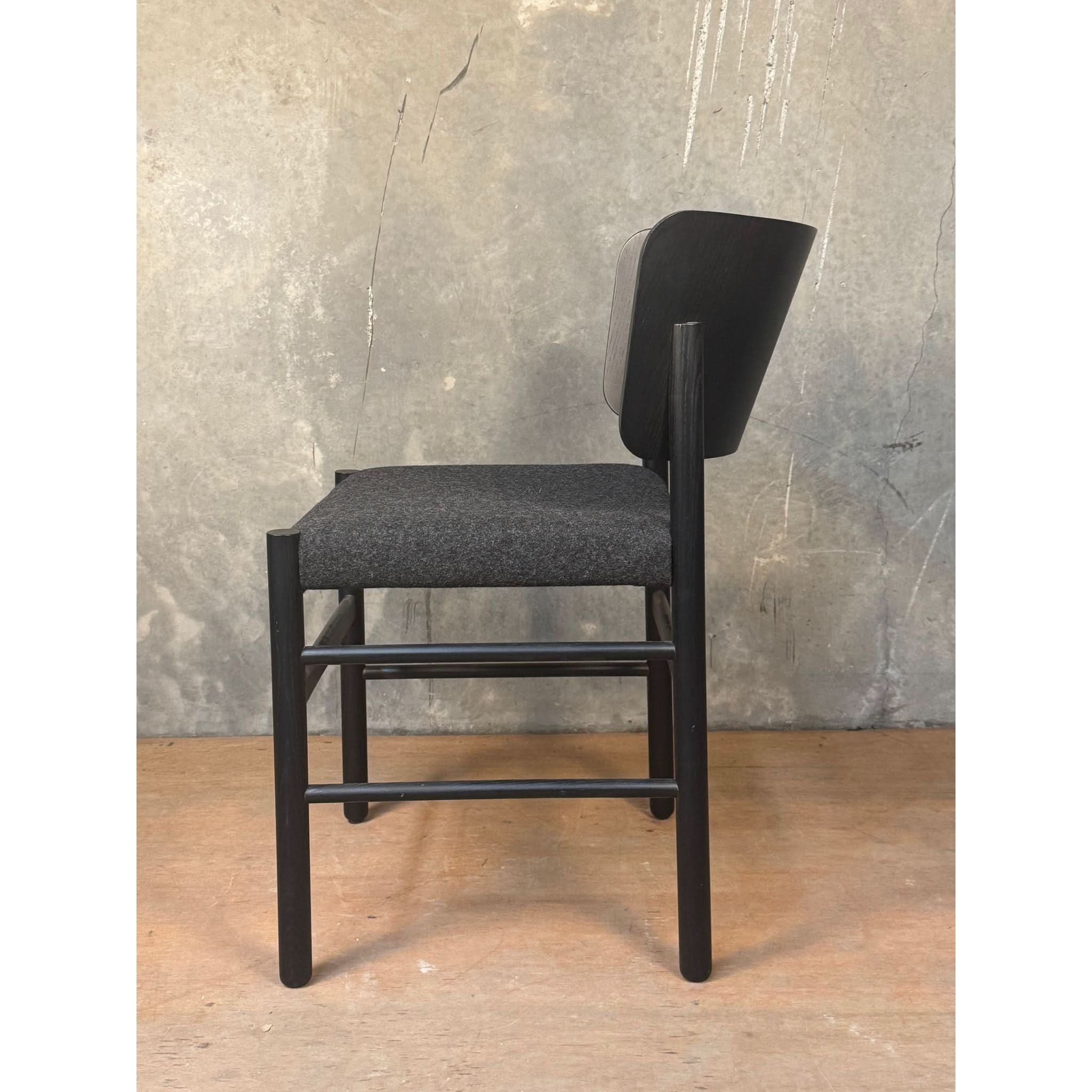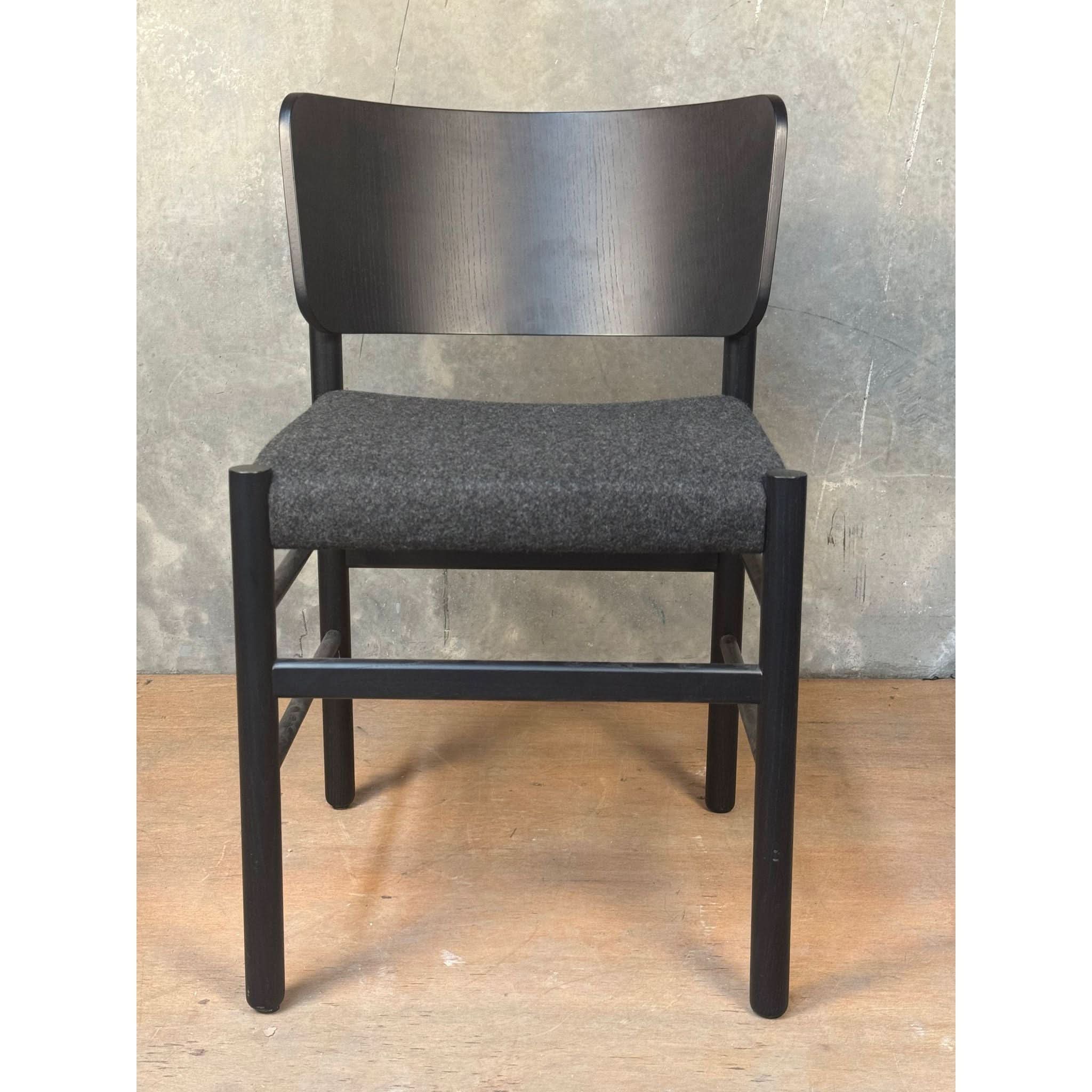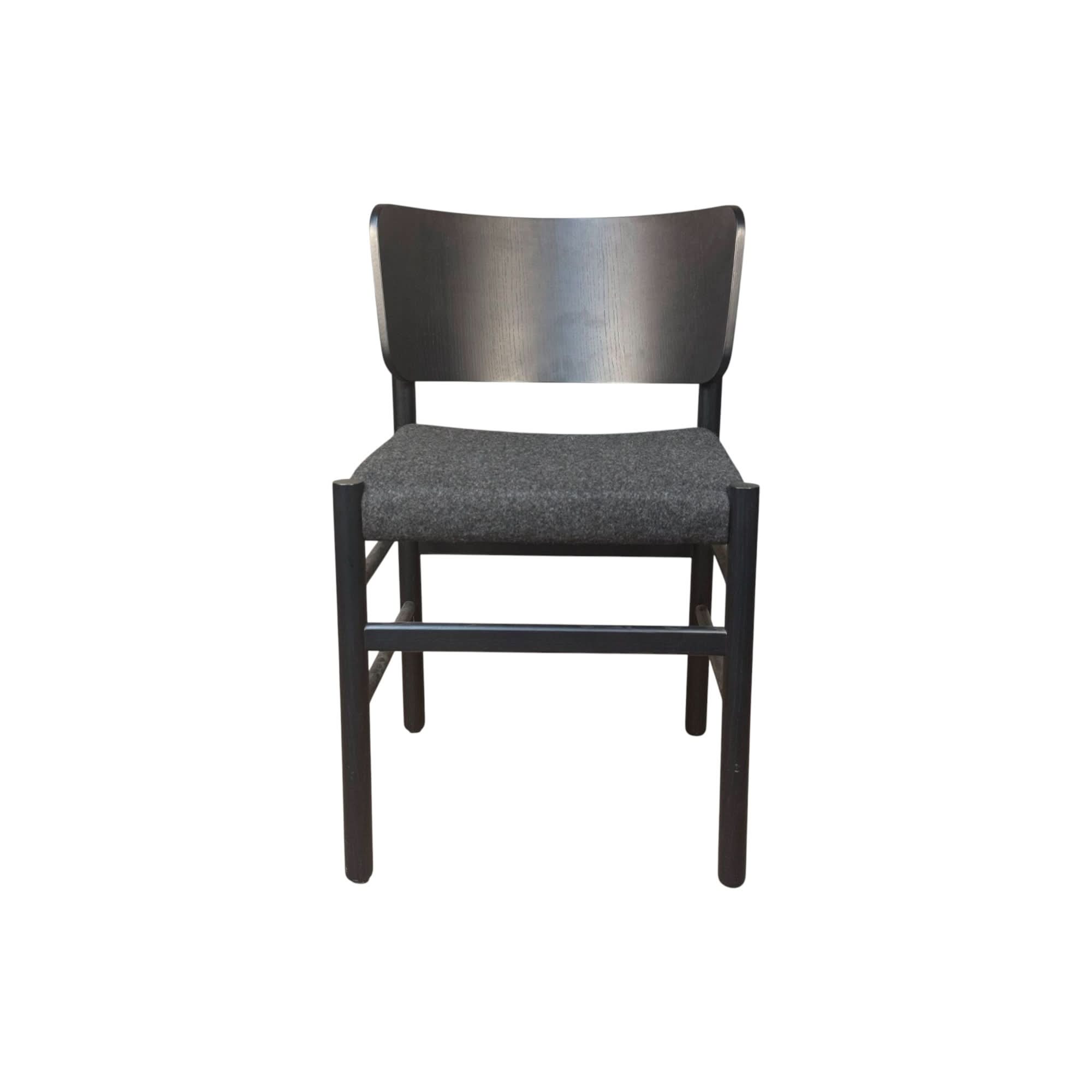The Fratina chair from the esteemed Billiani collection blends classic design with a modern twist. Designed in Italy, it features sleek round legs and a distinctive semi-circular backrest, embodying refined elegance and contemporary style. Constructed from black stained wood, the chair presents a clean, sophisticated look adaptable to many settings. Its dark grey upholstered felt seat cushion enhances both comfort and visual appeal, making it ideal for dining rooms, offices, or as an accent chair. This preloved piece, donated to ReLove, shows minor signs of wear but remains in good condition.