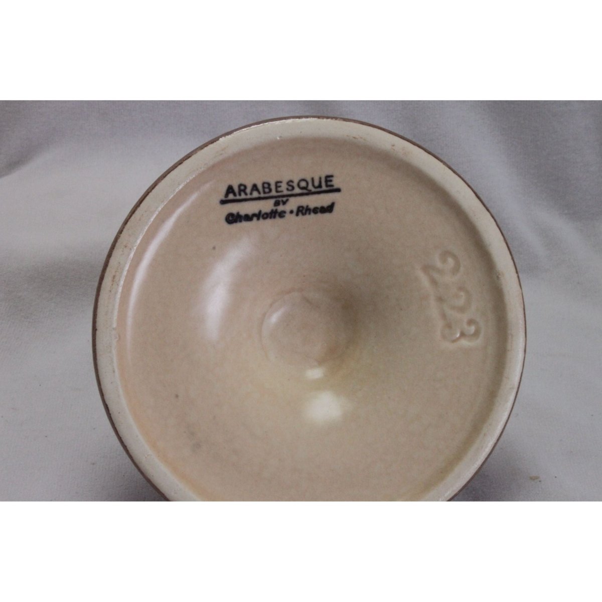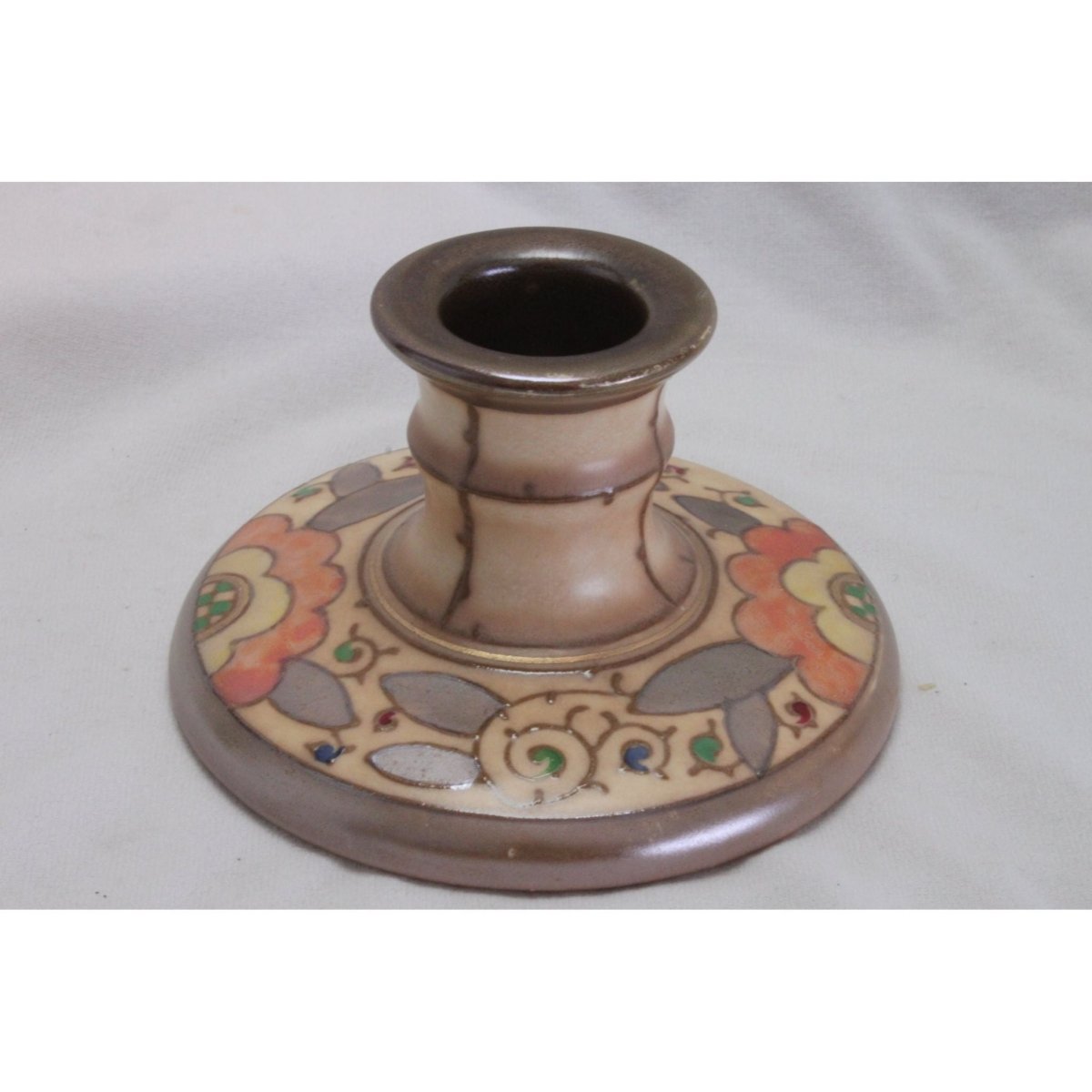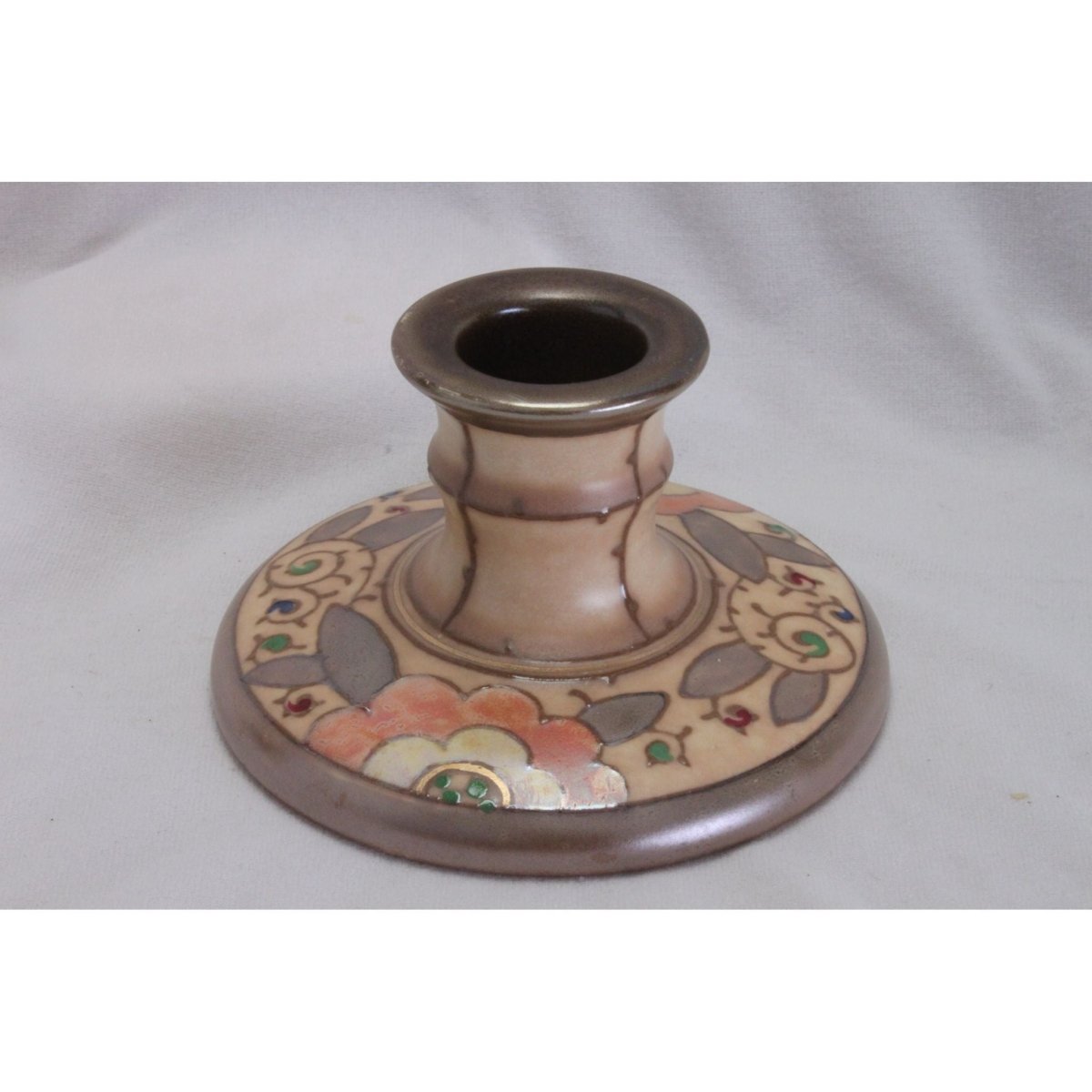 This candle holder was designed by Charlotte Rhead is decorated with the lustred Trellis pattern (pattern TL 3) on the H J Wood shape number 223. The pattern was first issued in 1954. It stands 60 (2.5 inches) mm high and the diameter of the base is 110 mm (4.25 inches). It is in very good condition
