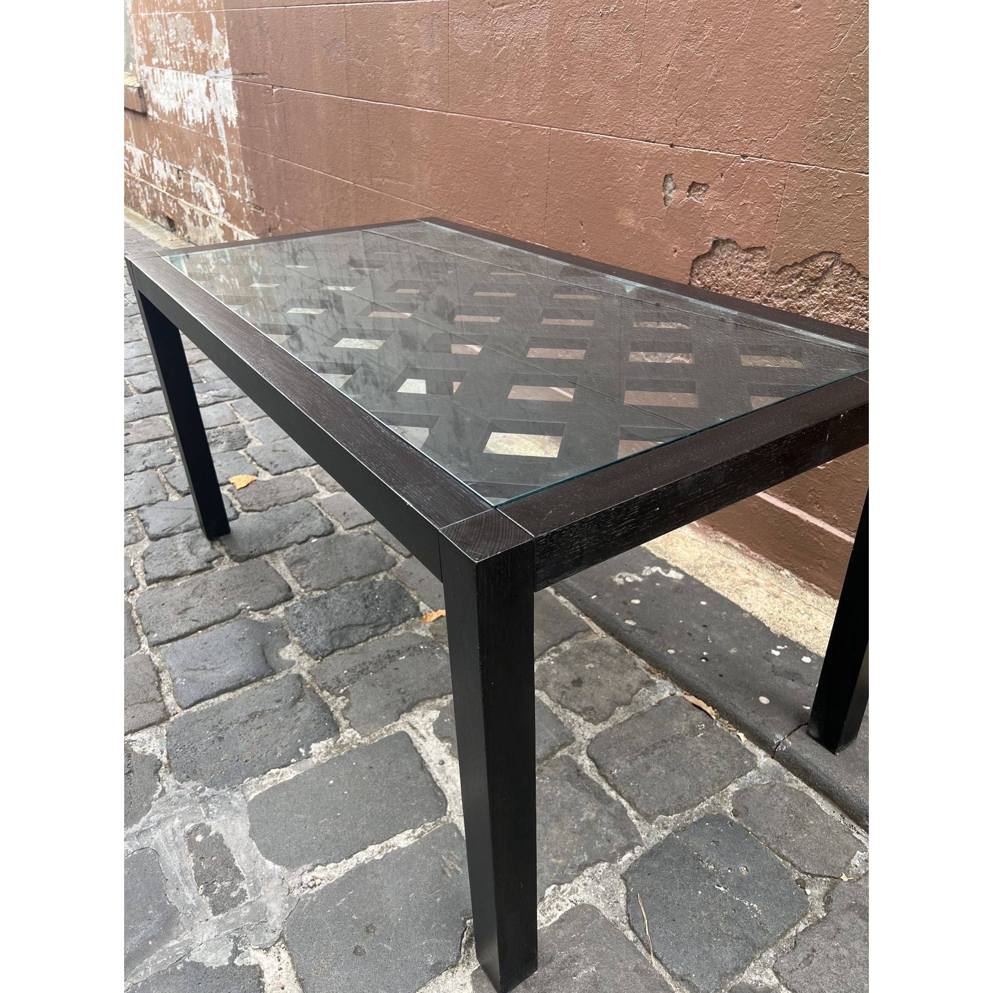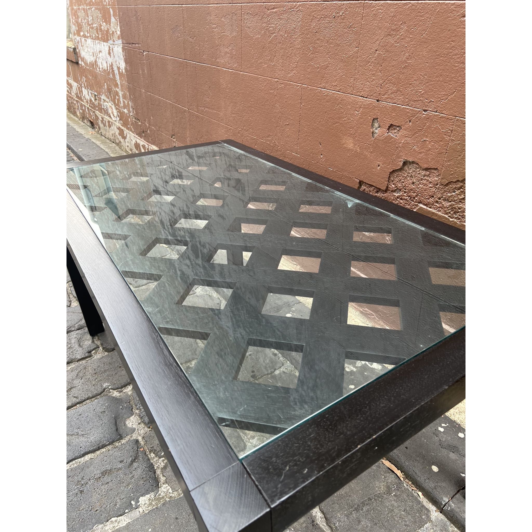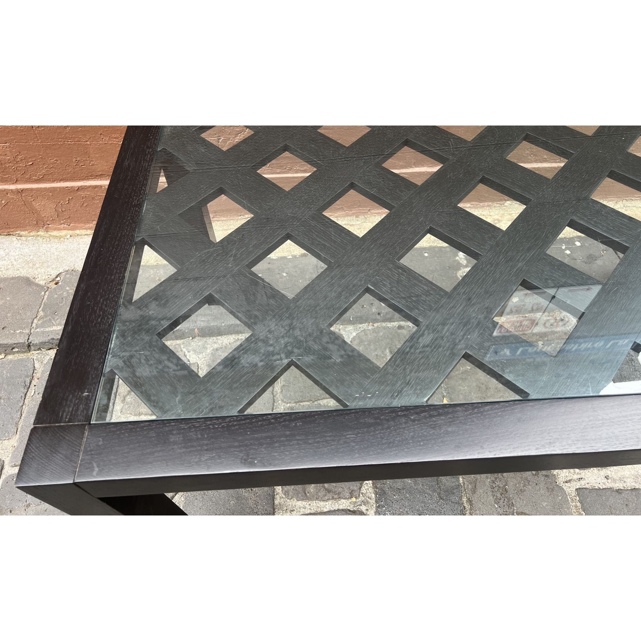 Featuring a glass top with intricate lattice detail in brilliant gloss black.