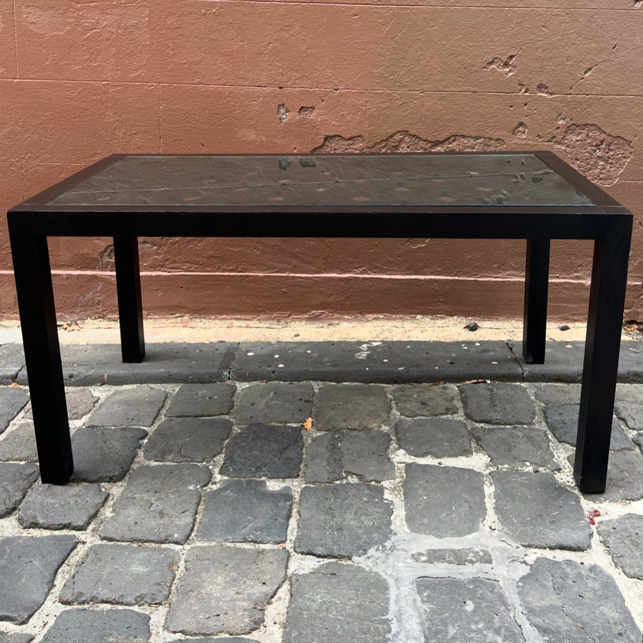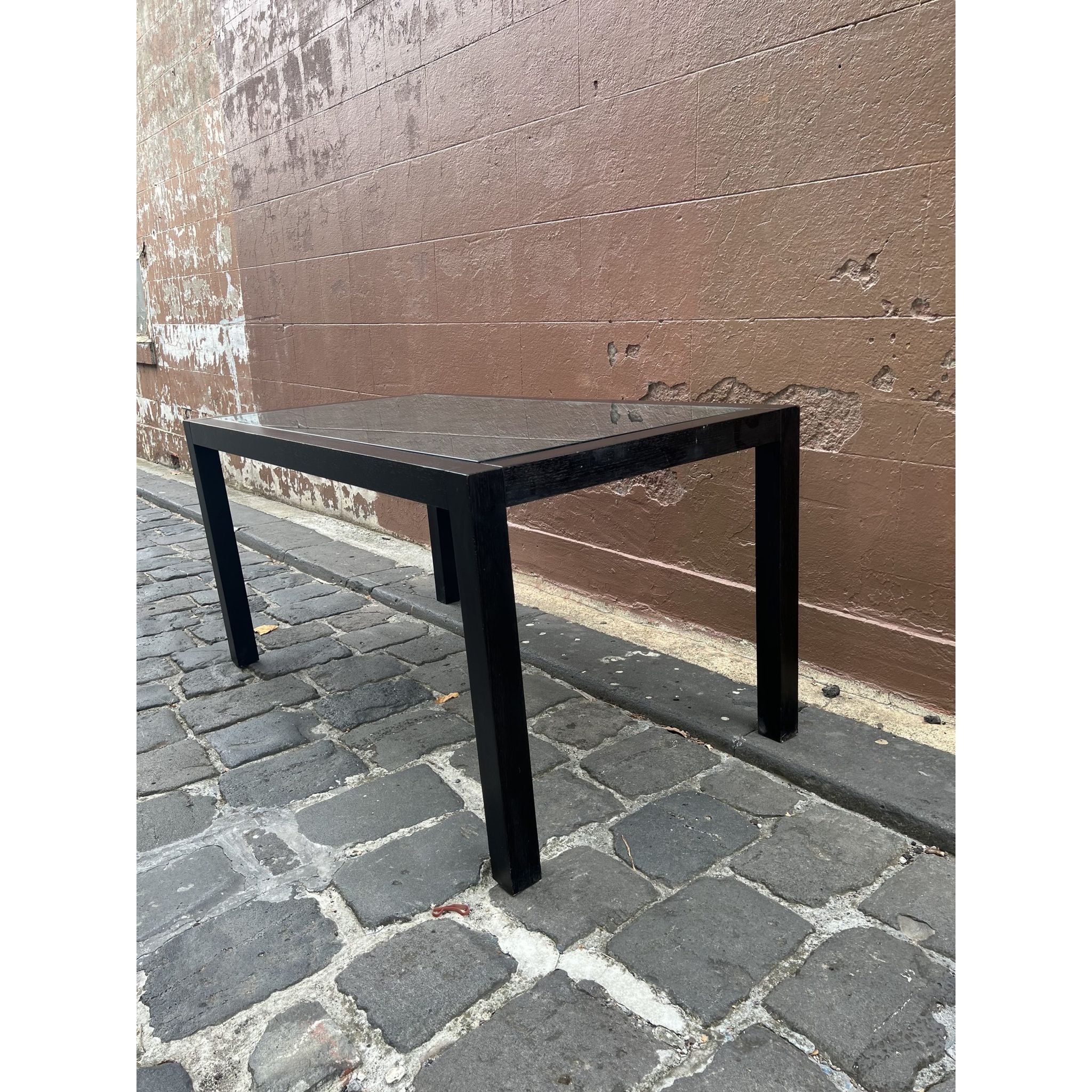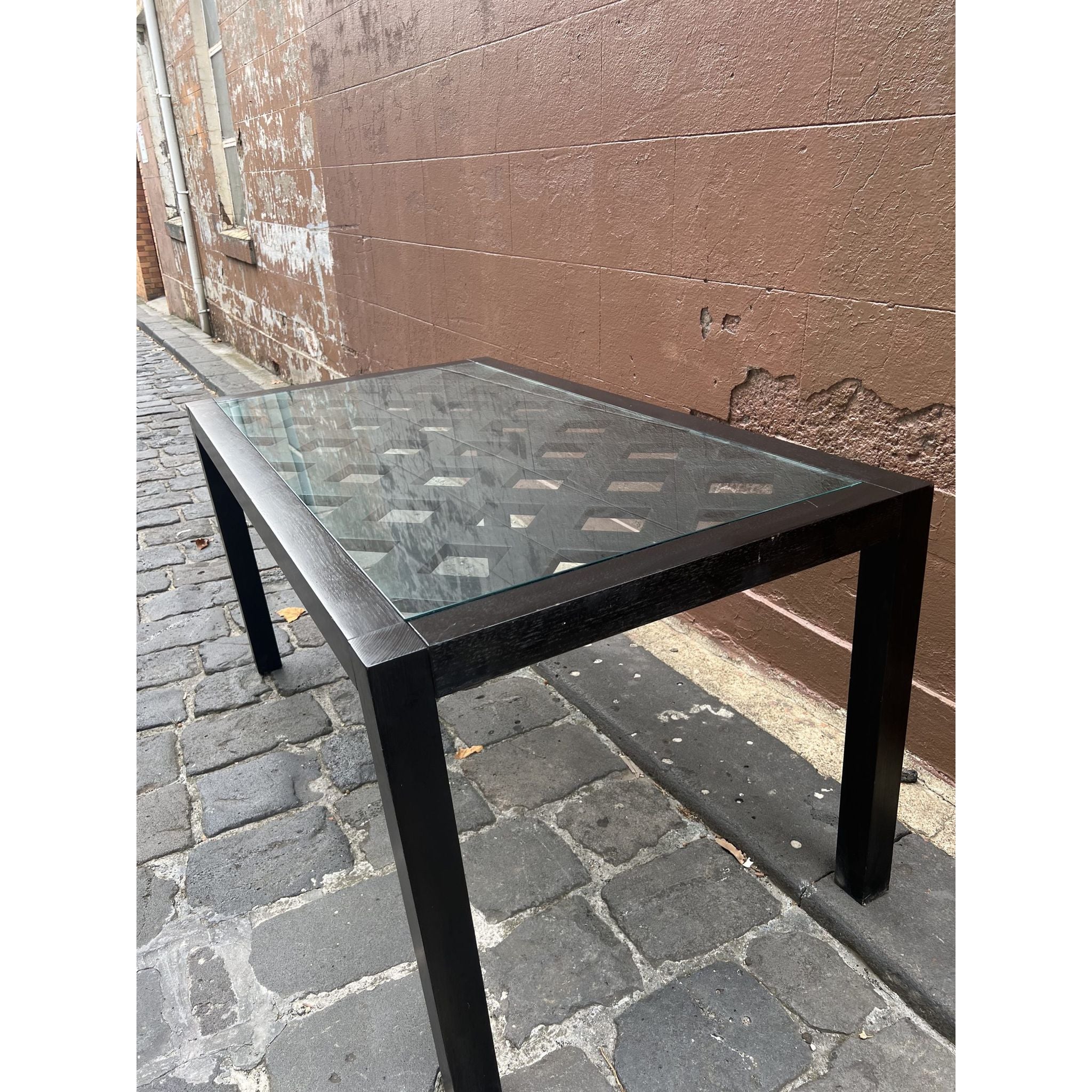 Featuring a glass top with intricate lattice detail in brilliant gloss black.
