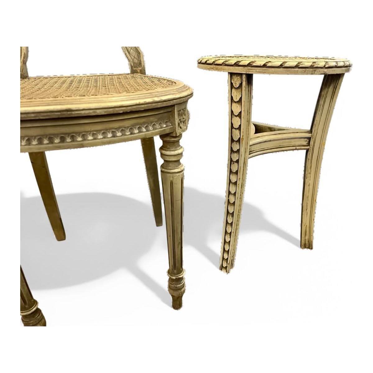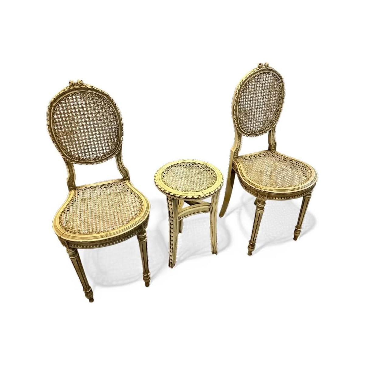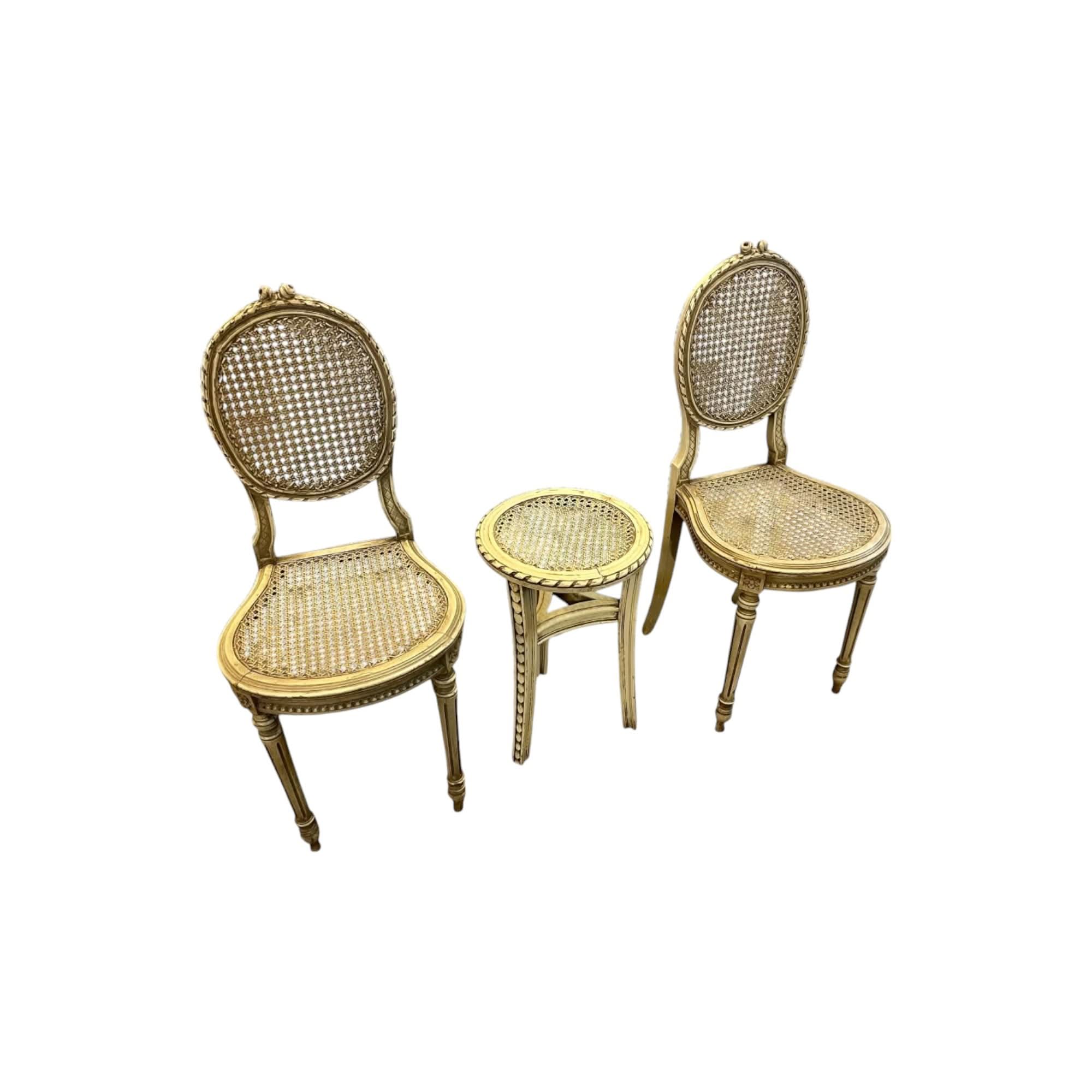A French Louis XVI style painted carved wood salon suite consisting of two chairs and a matching occasional table.