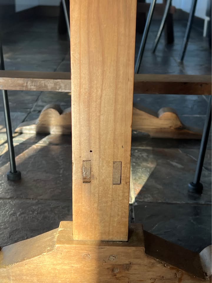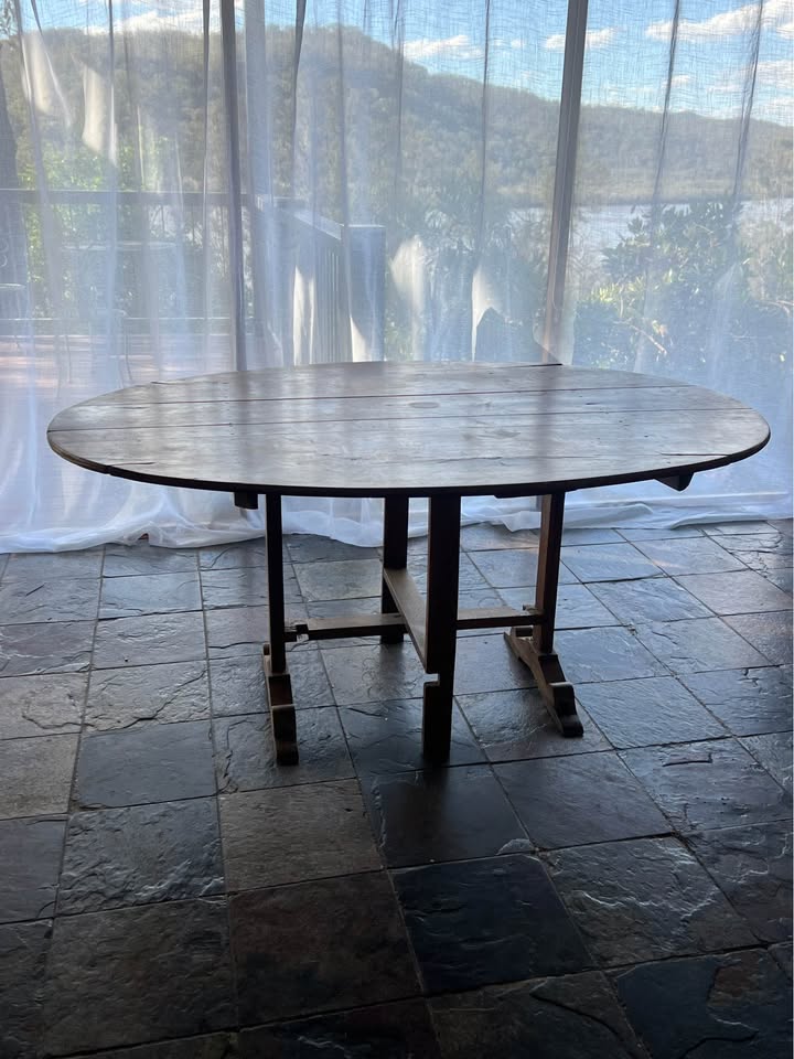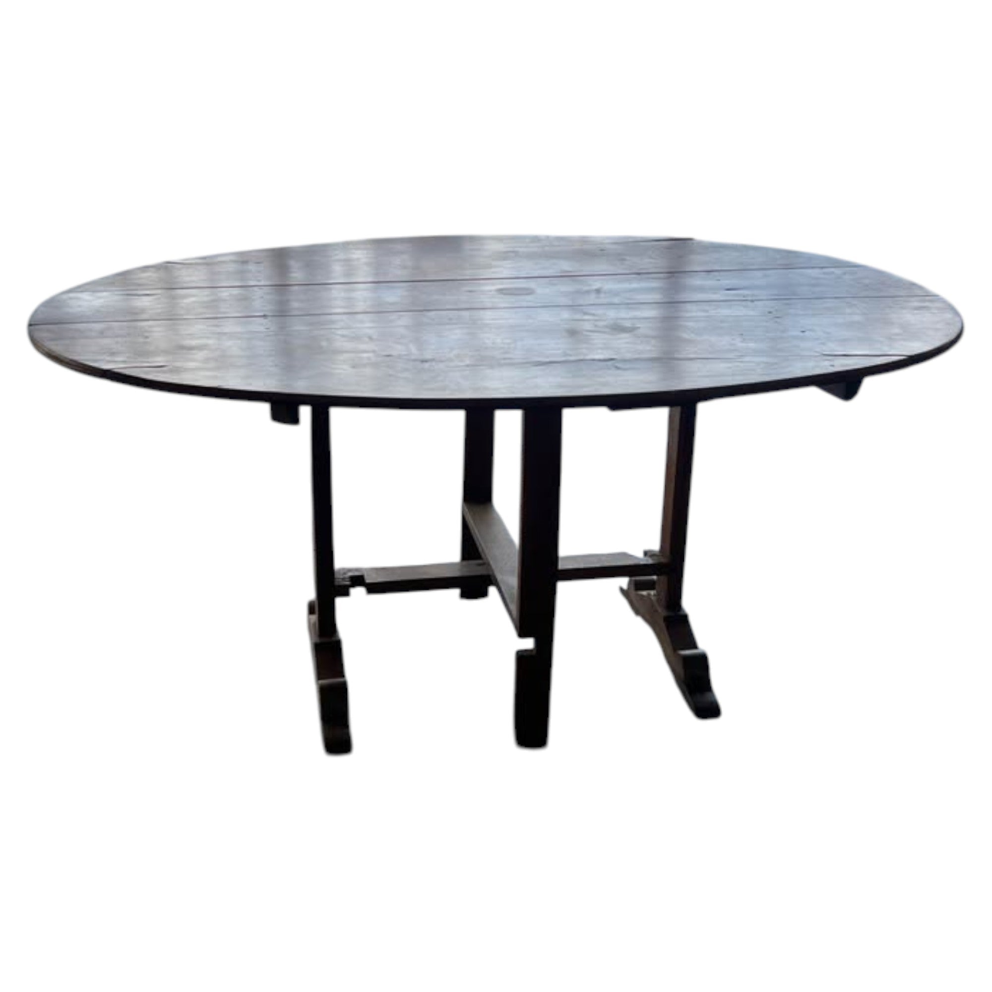 Genuine French wine table, over 100 years old, made in solid natural oak. These were originally built as vineyard tasting tables and are known for their practical tilt, which lets the top fold upright for easy storage. The base is constructed using traditional wooden joinery with no screws. Stable and ready for every day use. Perfect for apartment living or small kitchens, could fit up to 6 around it or fold away when not using. Farmhouse style, beautiful patina