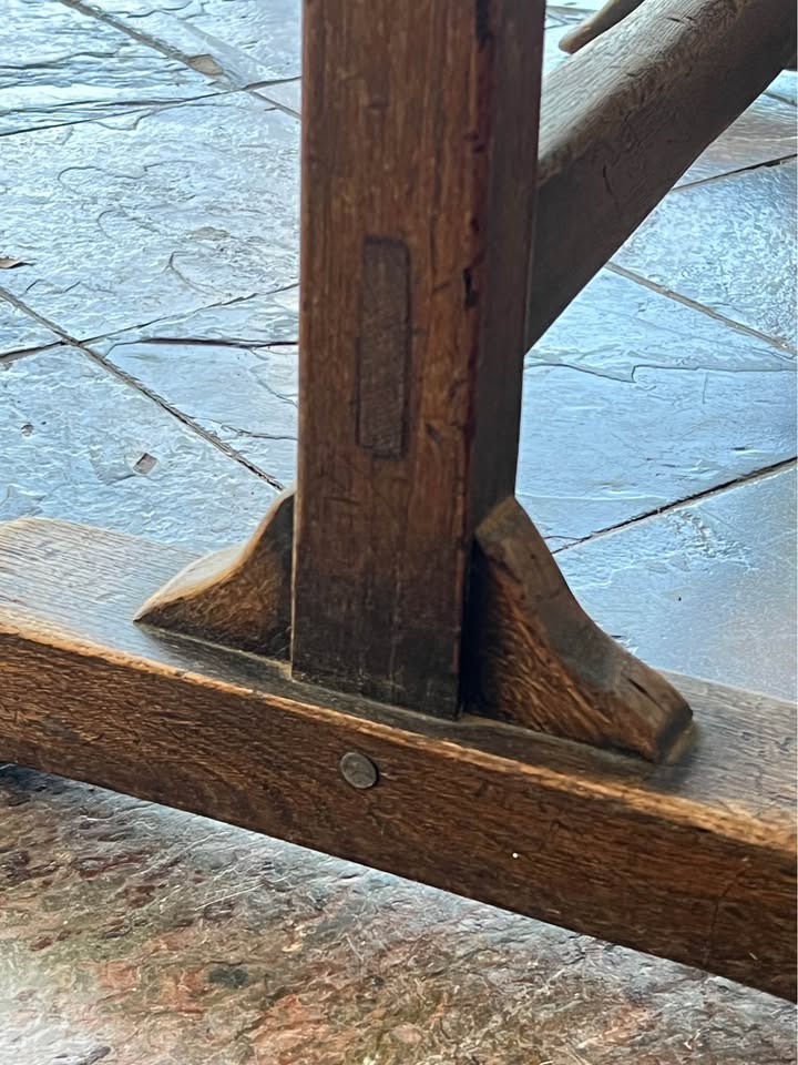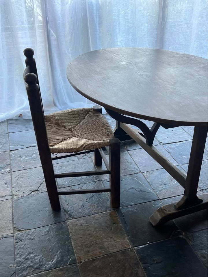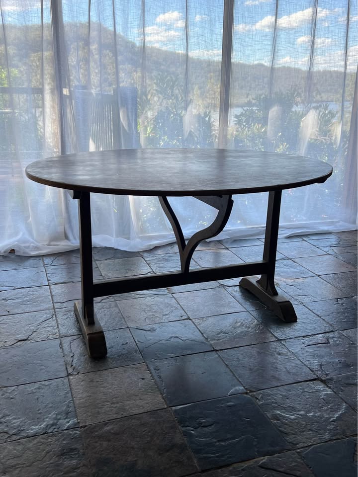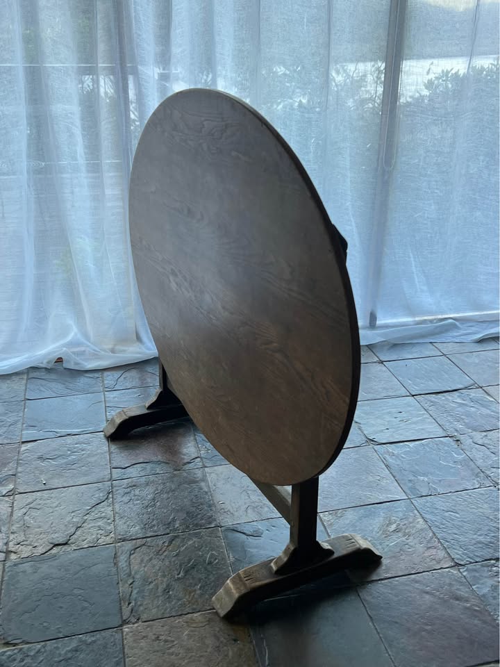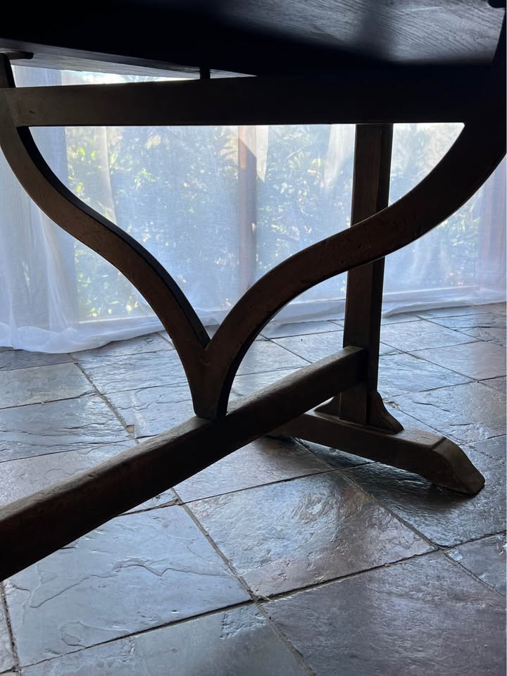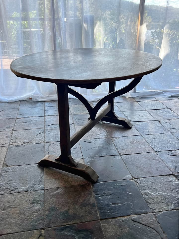 Solid French tilt table in a walnut finish. Built with traditional timber fixings and no screws, which is why these old tables stay tight and stable even after a century. The under-frame has a clean cross-brace design that keeps it sturdy without adding bulk. The top tilts upright in the classic style, making it easy to move or store.