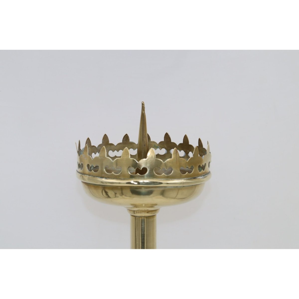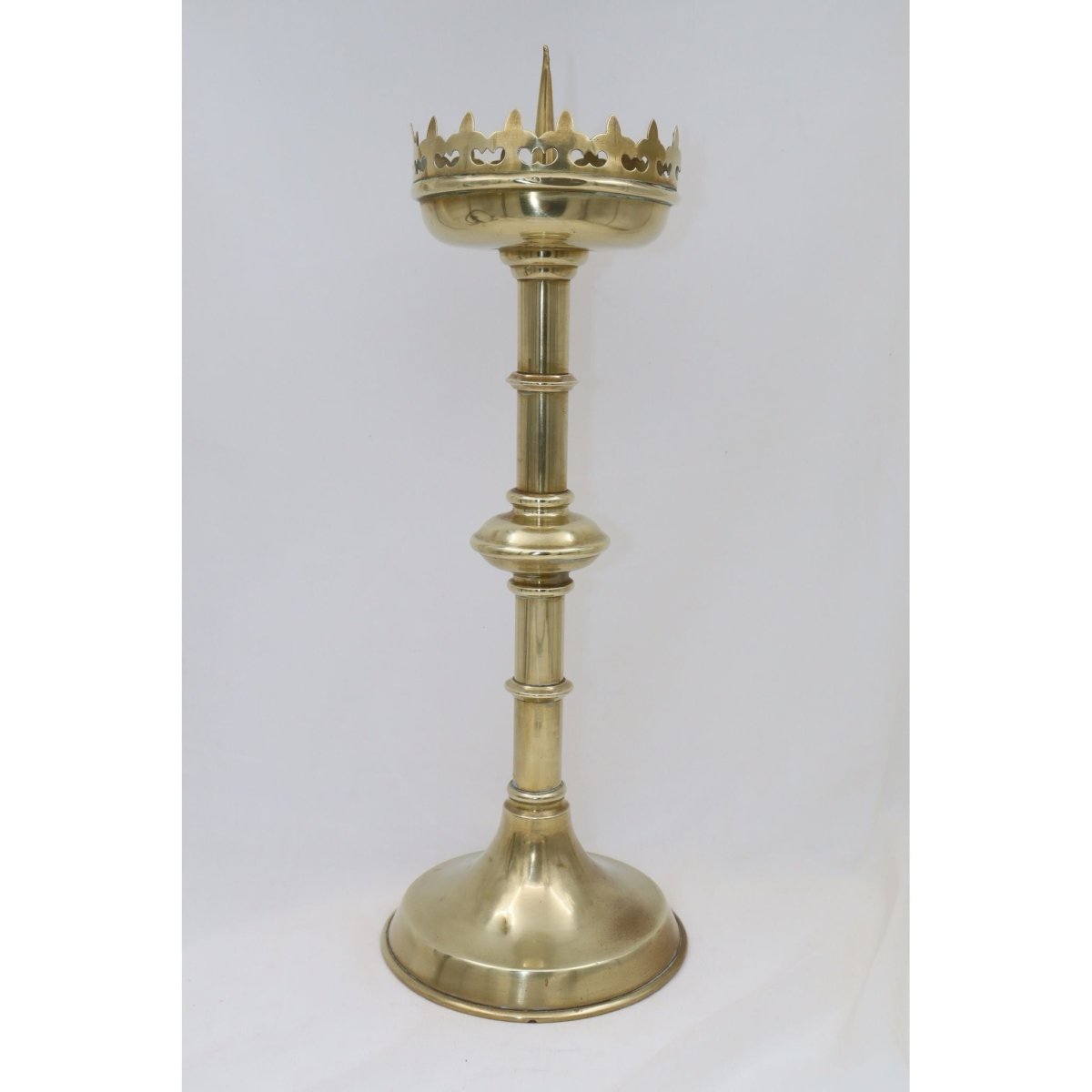 This imposing Gothic brass candlestick stands 520 mm (20.5 inches) high with a base diameter of 185 mm (7.25 inches). Surrounding the bowl at the top is a frieze of fleur-de-lys. It is in good used condition and would date from the late 1800's.