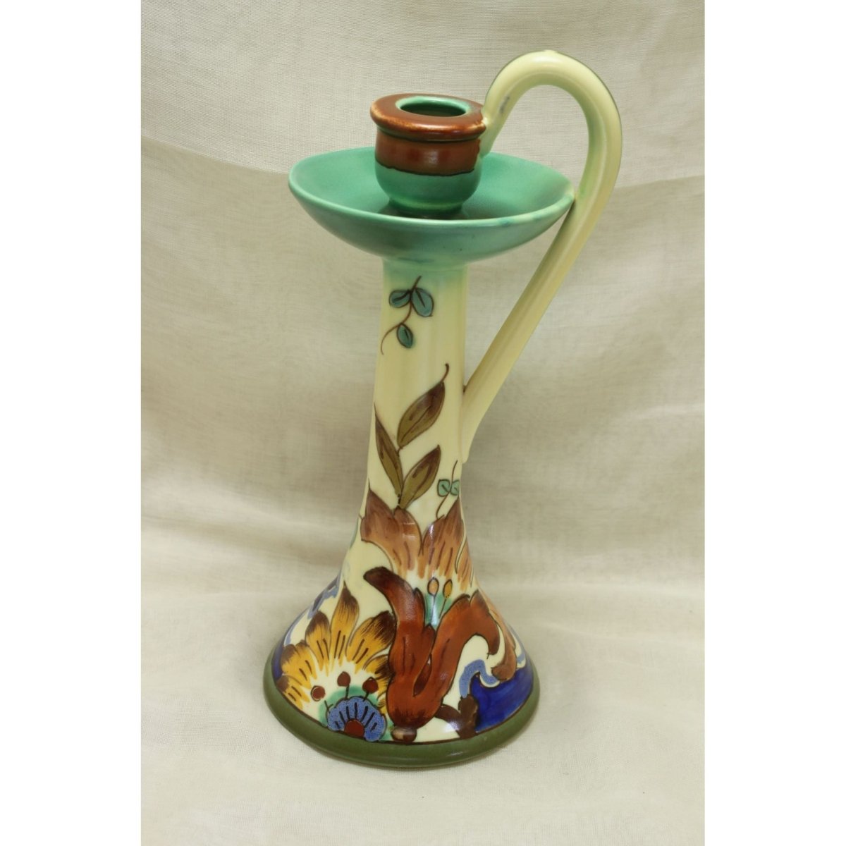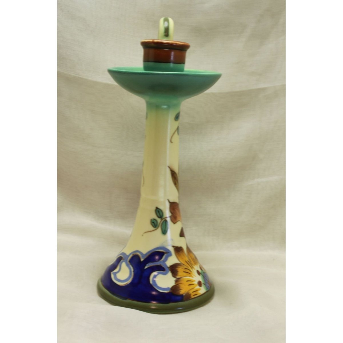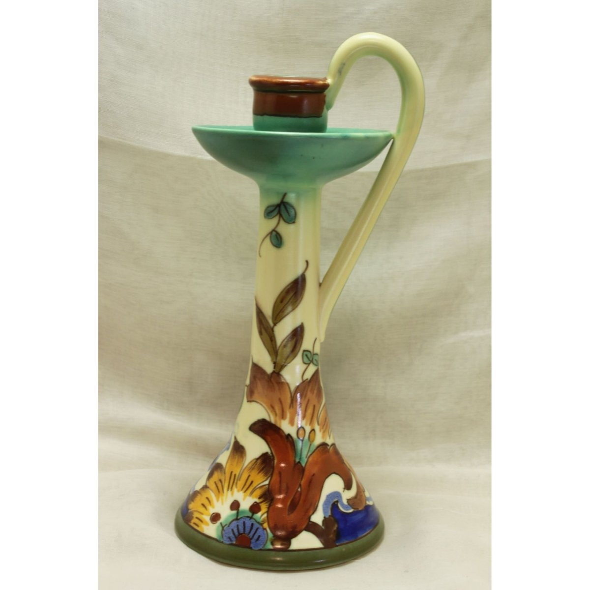 This hand painted Gouda candlestick is decorated with the Kabor pattern which consists of a colourful array of flowers emerging from a deep blue base, all on a rich, creamy ground. It stands 220 mm (8.75 inches) high and has a diameter at the base of 96 mm (3 3/8ths inches). It does have some very minor crazing, otherwise it is in very good condition. It would date from the late 1940's or the very early 1950's.