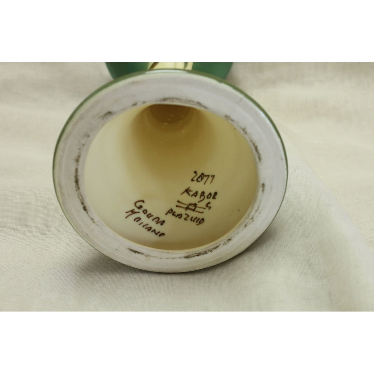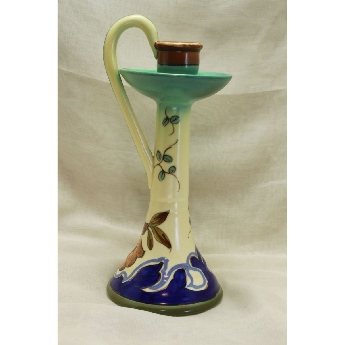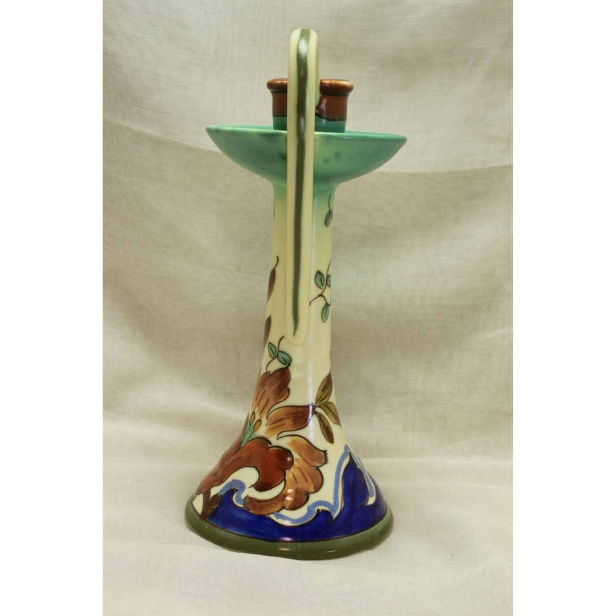 This hand painted Gouda candlestick is decorated with the Kabor pattern which consists of a colourful array of flowers emerging from a deep blue base, all on a rich, creamy ground. It stands 220 mm (8.75 inches) high and has a diameter at the base of 96 mm (3 3/8ths inches). It does have some very minor crazing, otherwise it is in very good condition. It would date from the late 1940's or the very early 1950's.