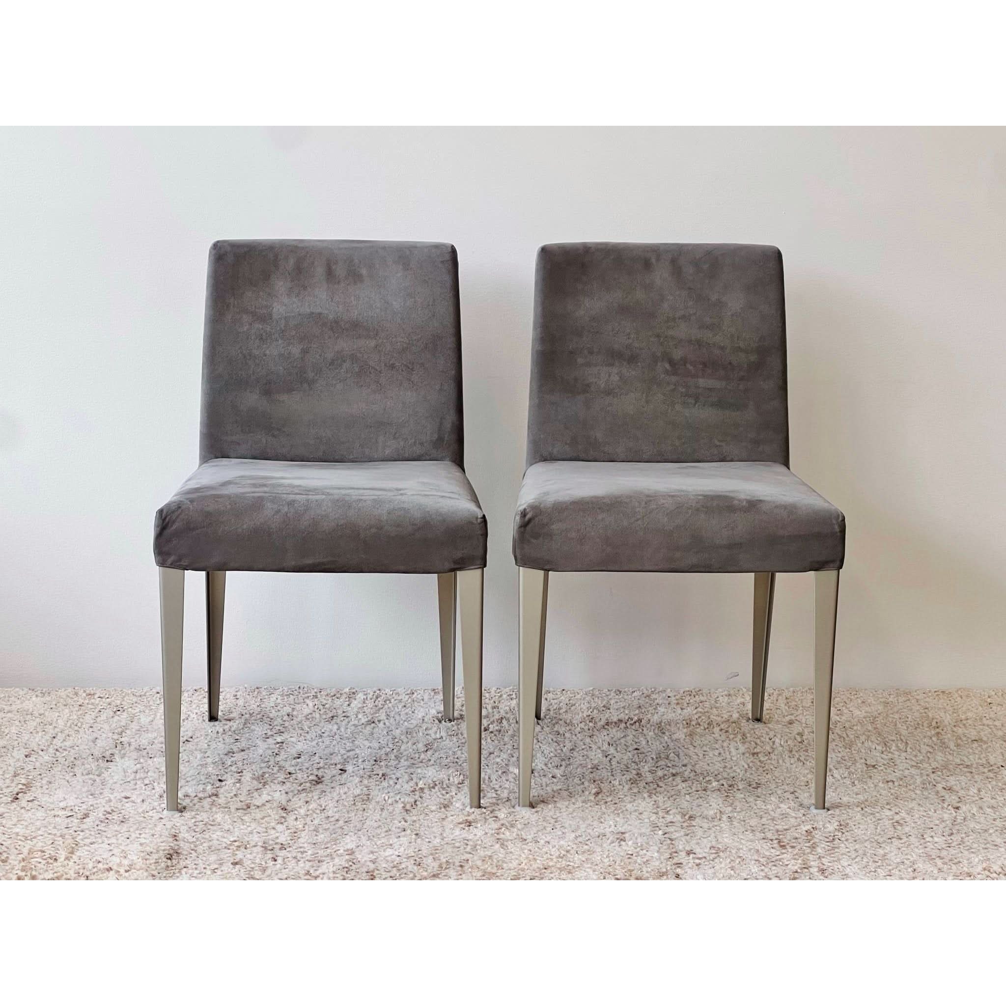 The Melandra Dining Chair is a classic and timeless design by Antonio Citterio for B&B Italia’s Maxalto line. The comfortable shape and stylish silhouette would suit any style of home or office. A fully padded seat & back offer luxurious seating comfort & feature removable fabric covers for ease of cleaning. Tapered metal legs cut an elegant, lightweight silhouette. Features include plastic glides on the feet & an embossed B&B Italia logo on the seat back. This set of chairs are in good condition with some marking visible on the legs.