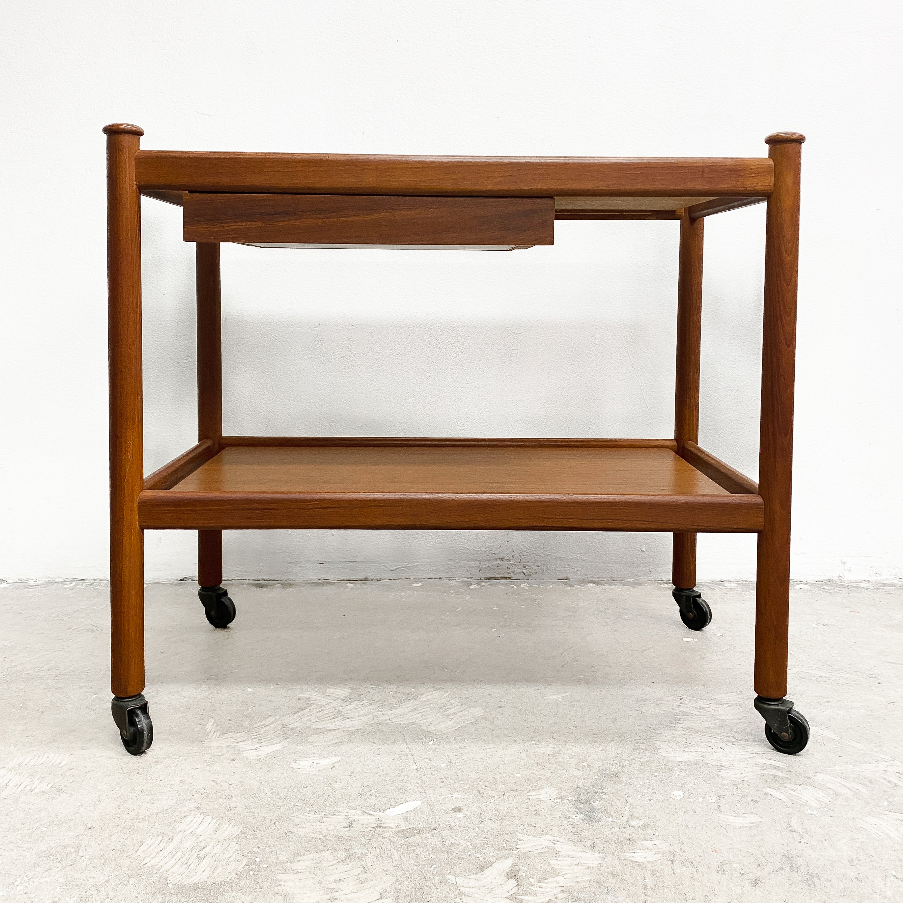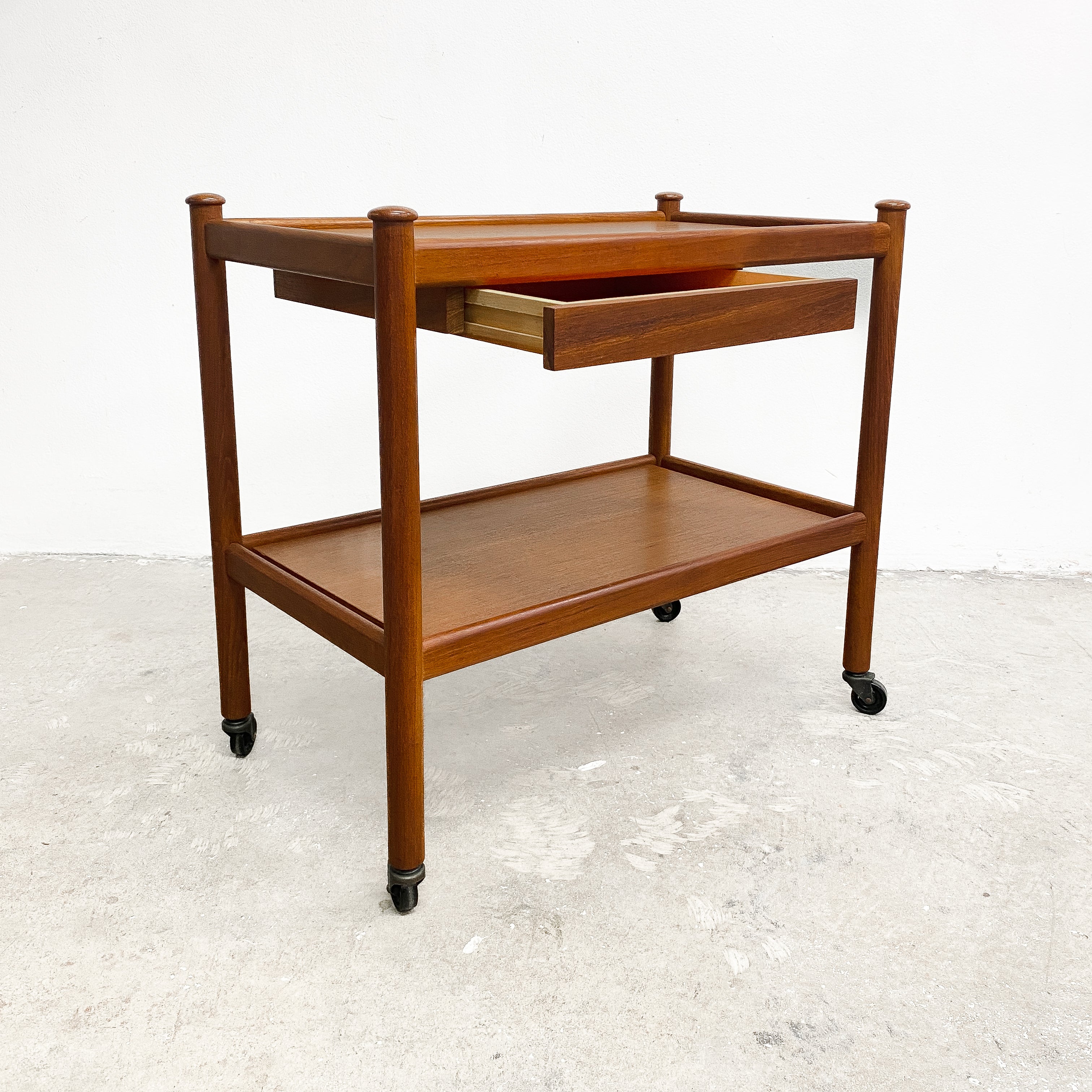 Classic mid century Parker two tier teak drinks trolley, with a orange felt lined drawer. The perfect addition to any living room or bar, and could also easily function as a side table.