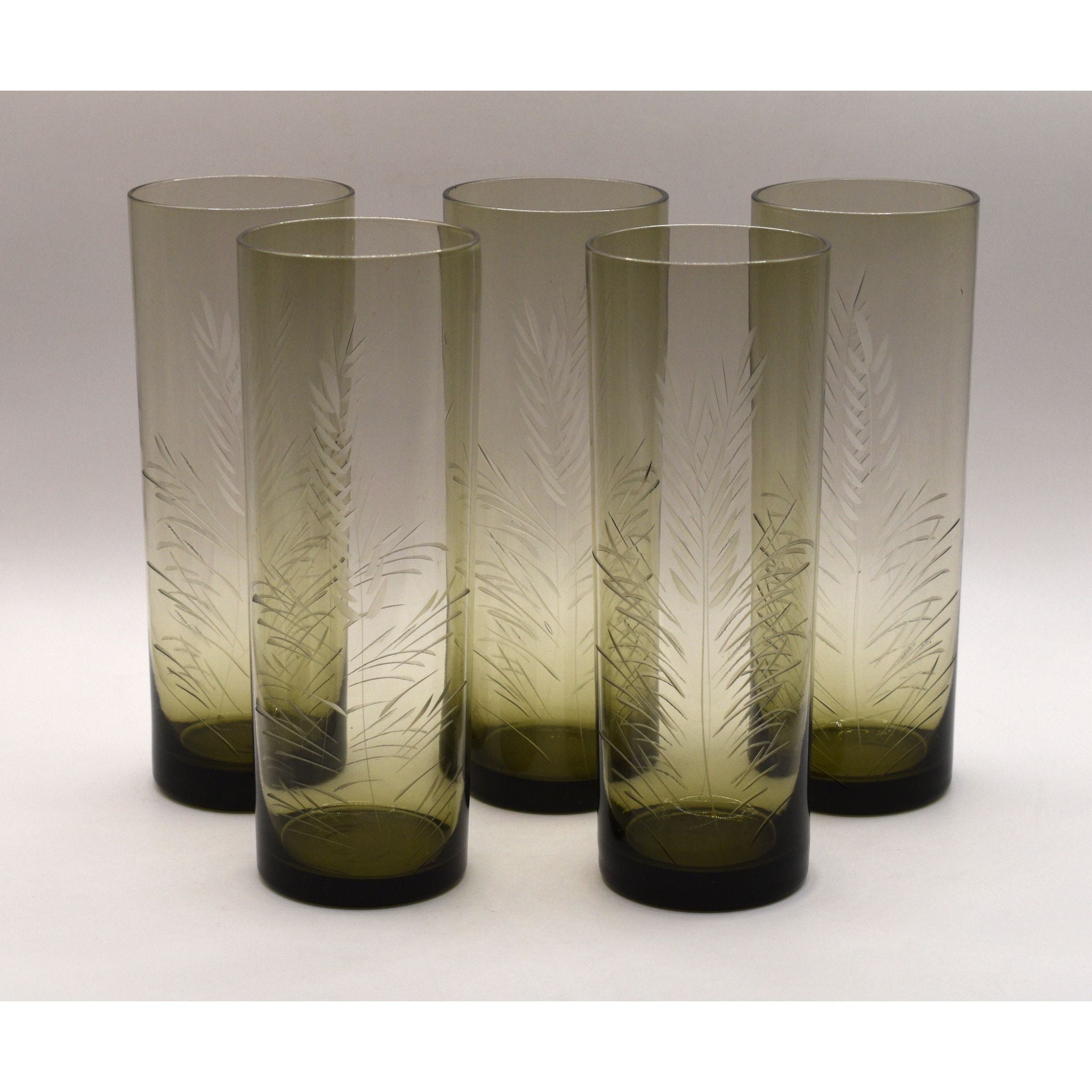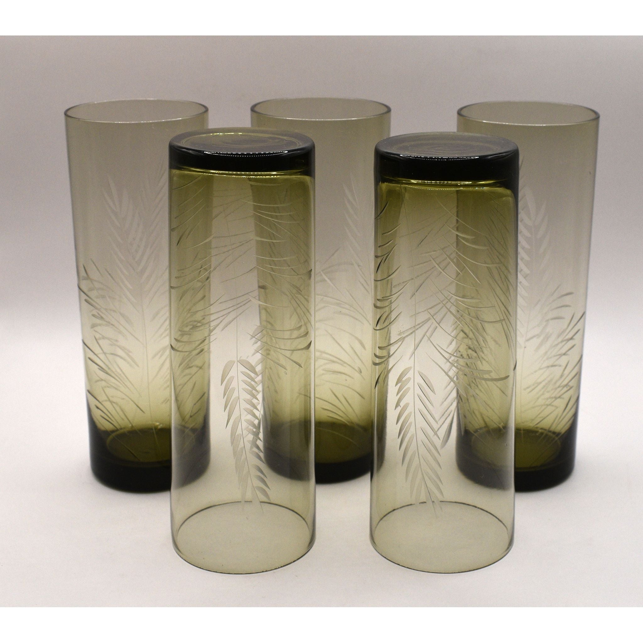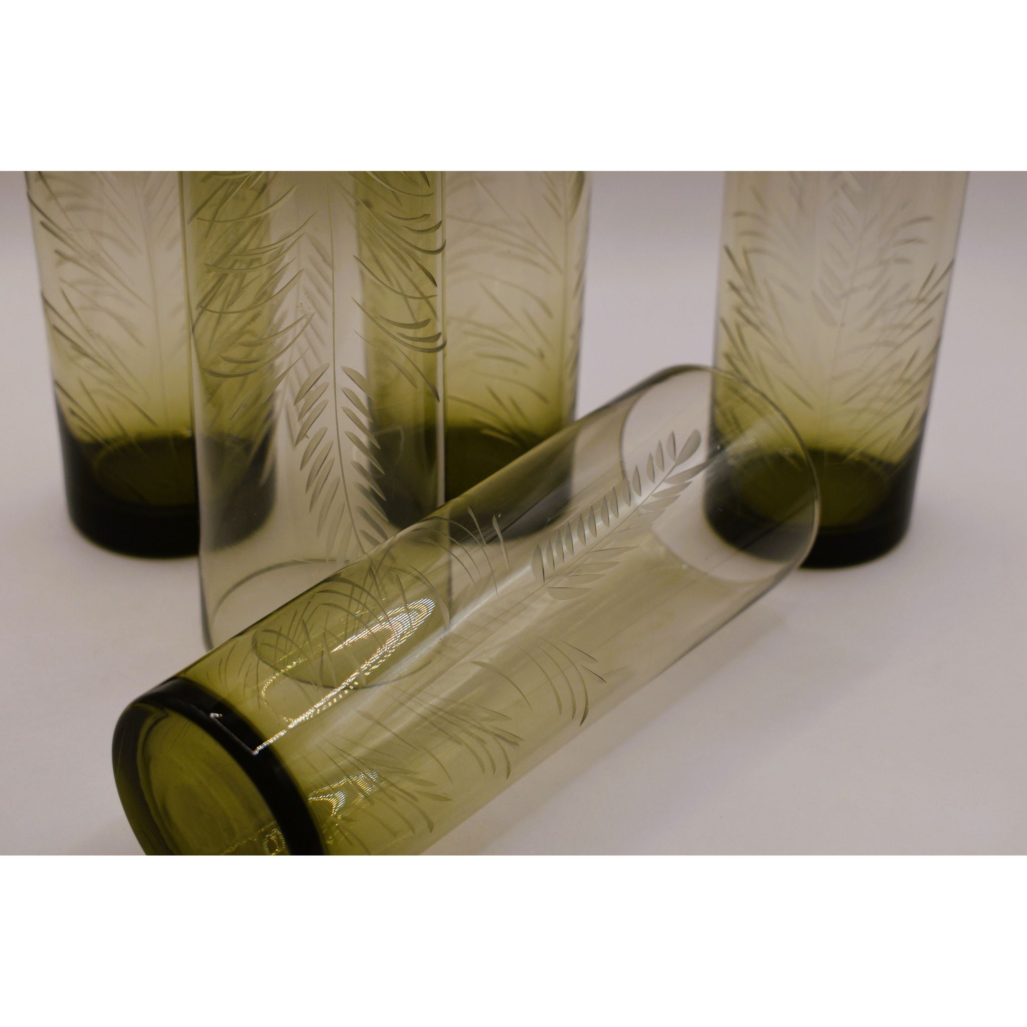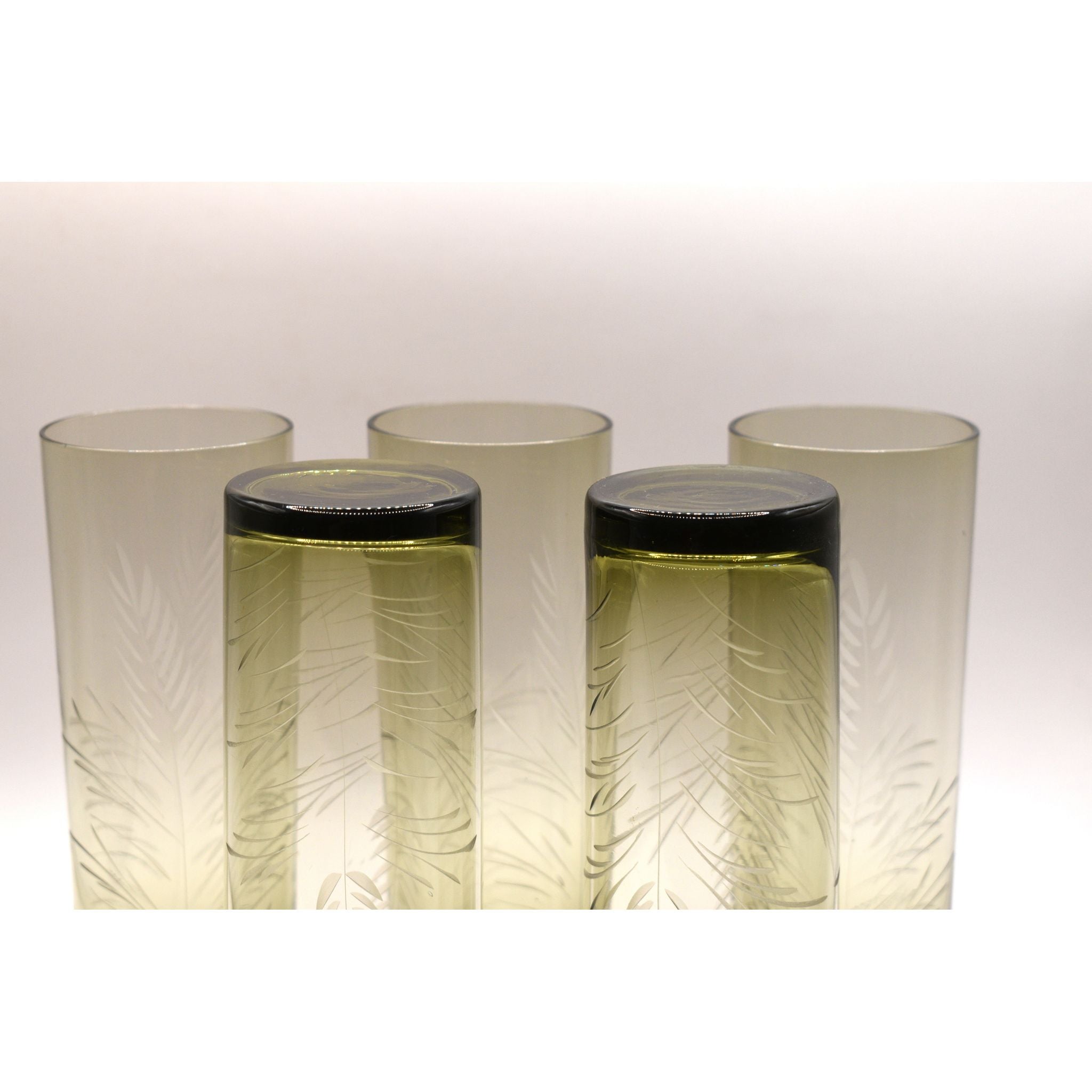 Fabulous set of 5 olive green etched Tom Collins tumblers.