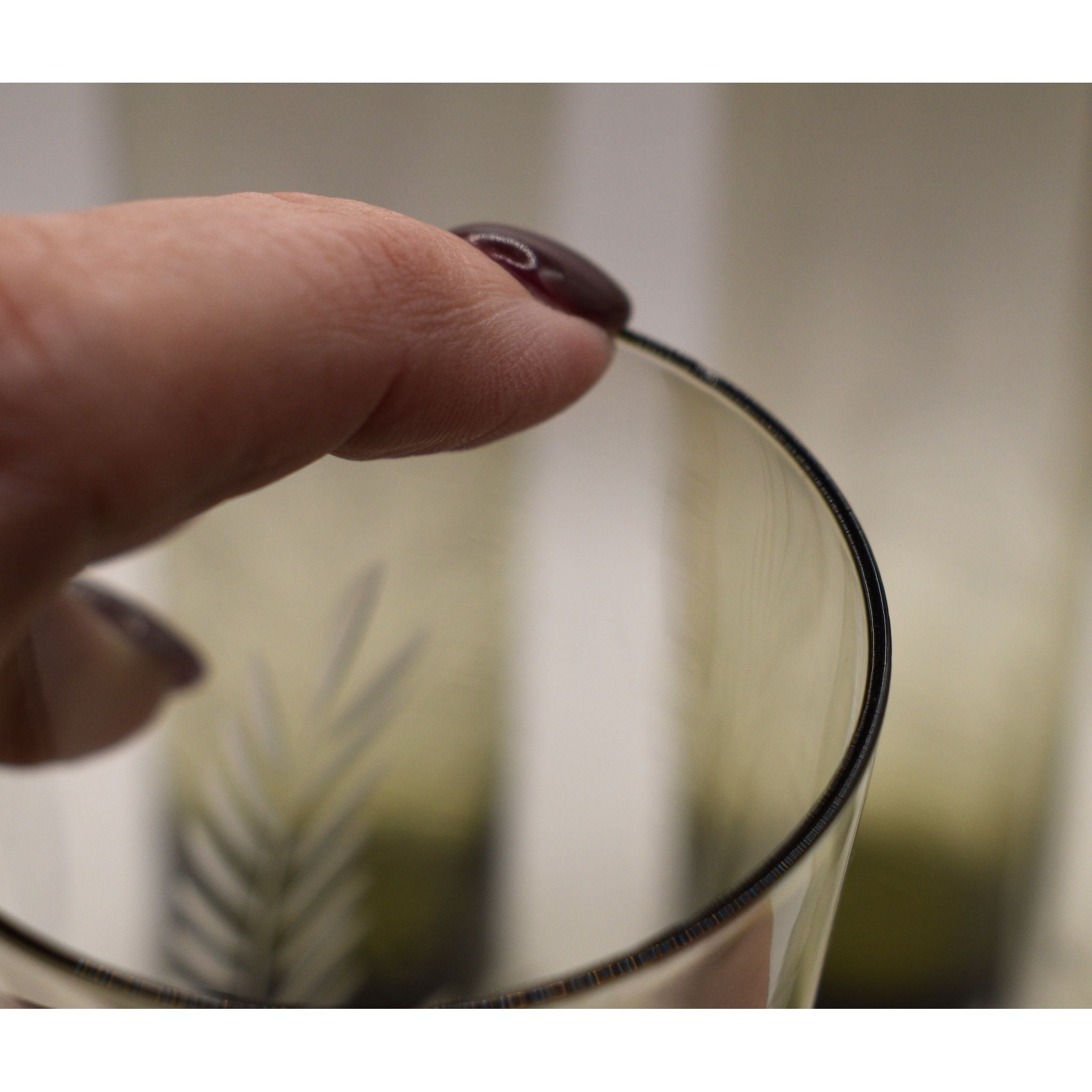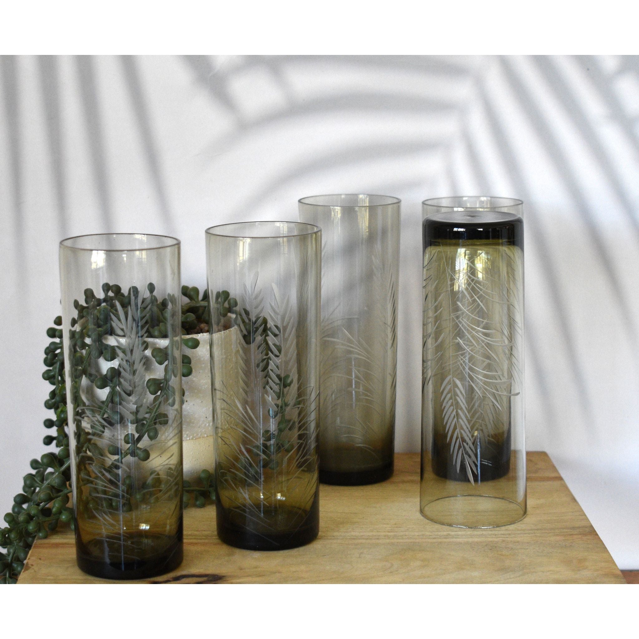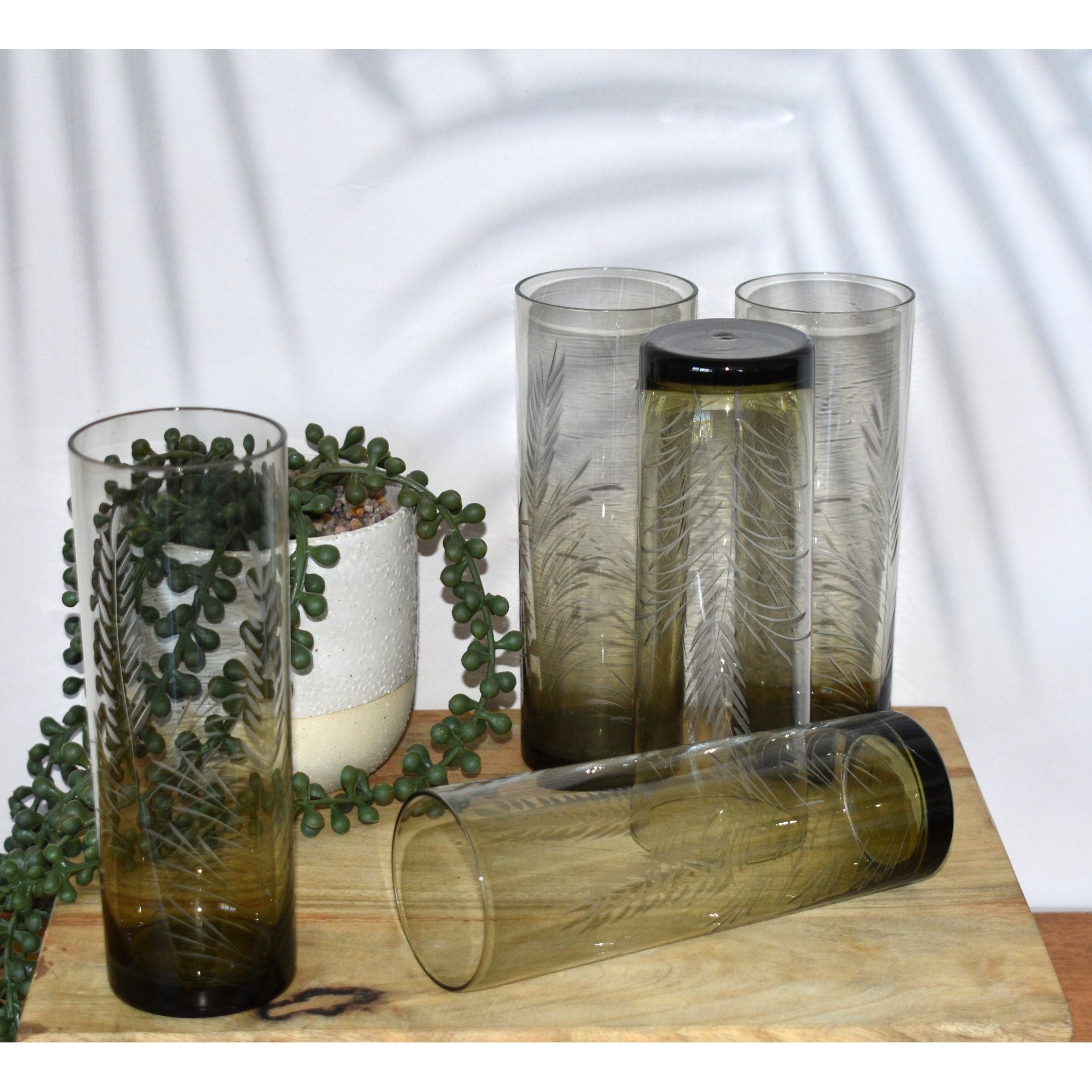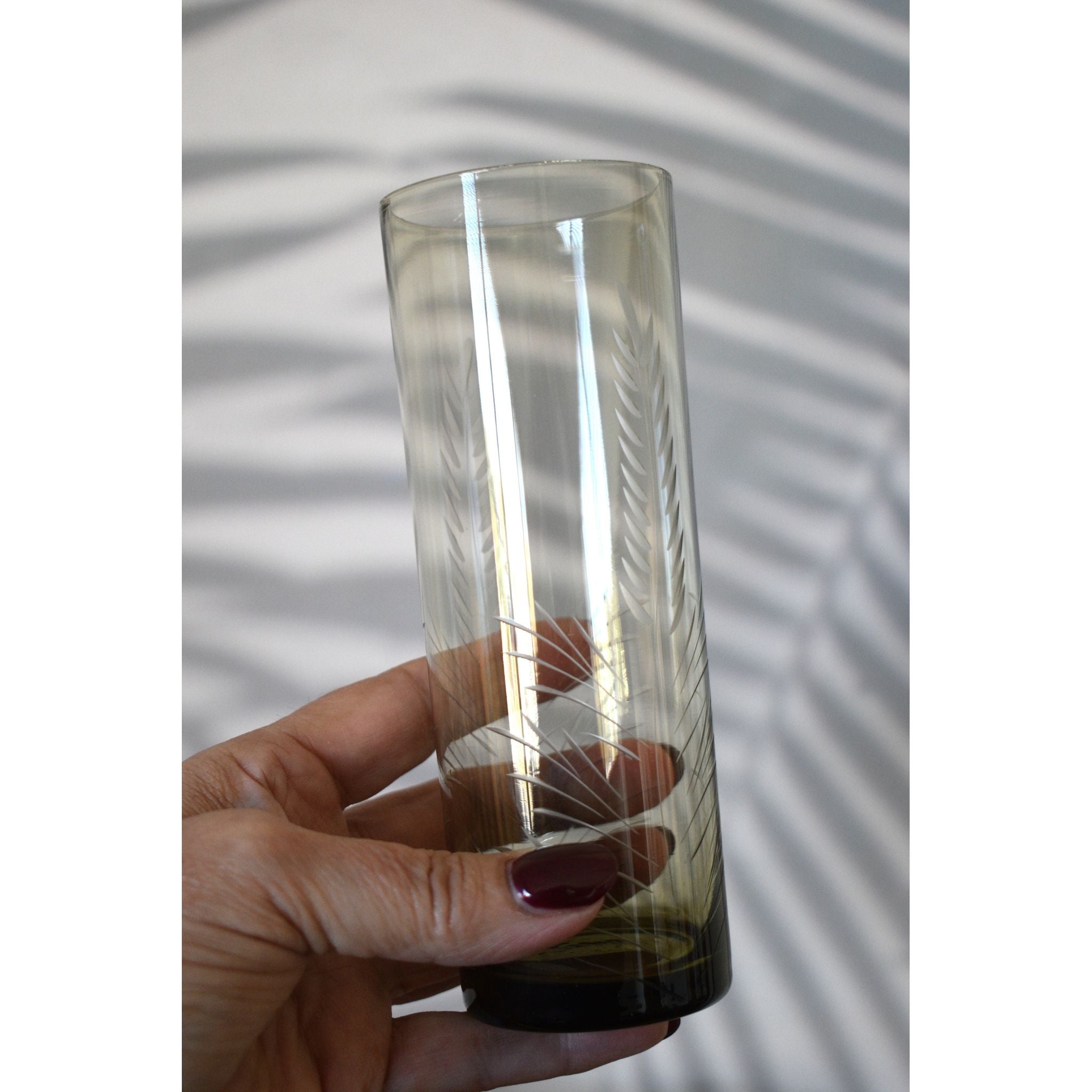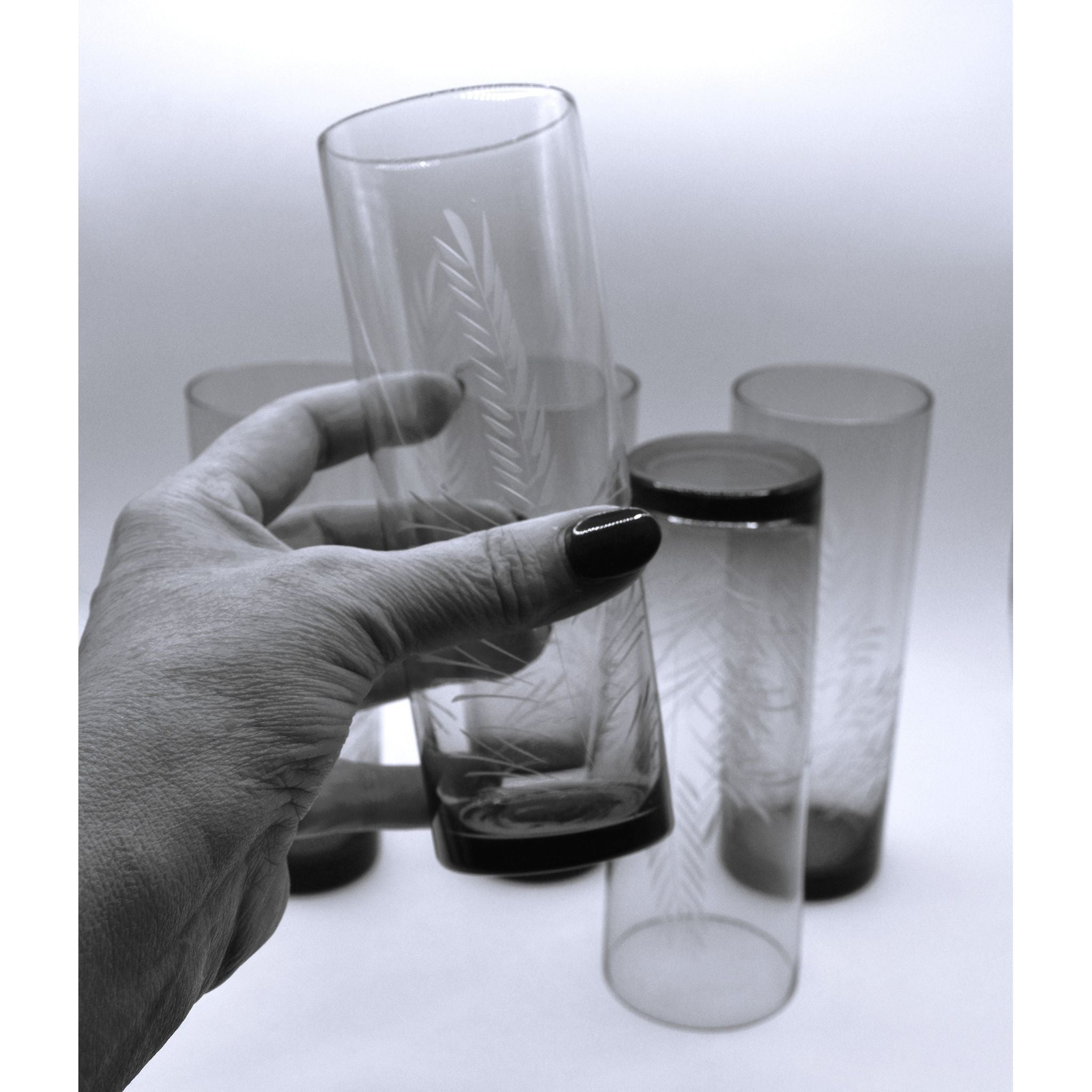 Fabulous set of 5 olive green etched Tom Collins tumblers.