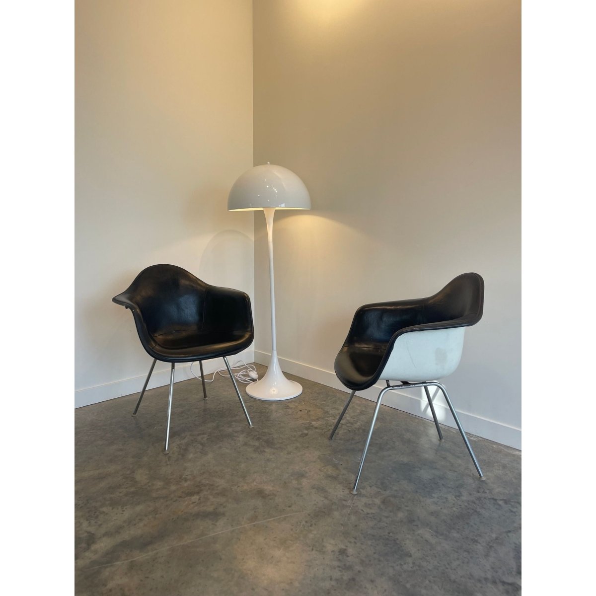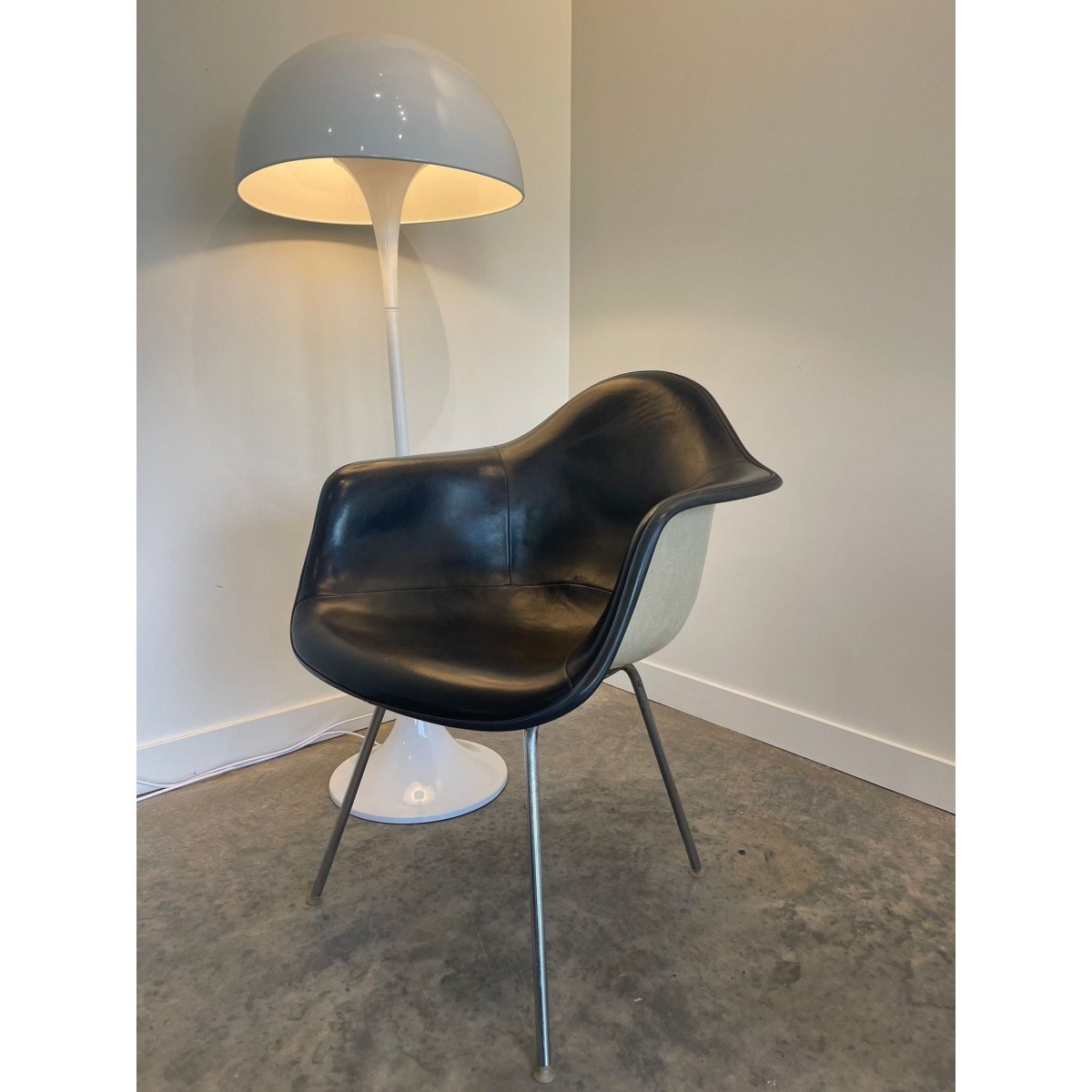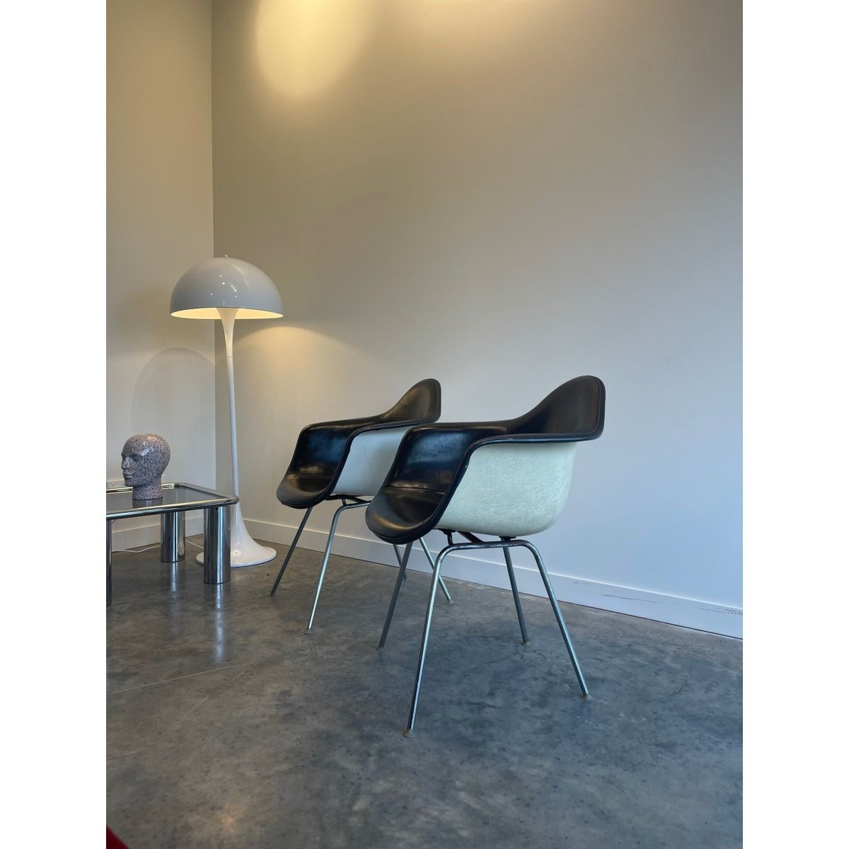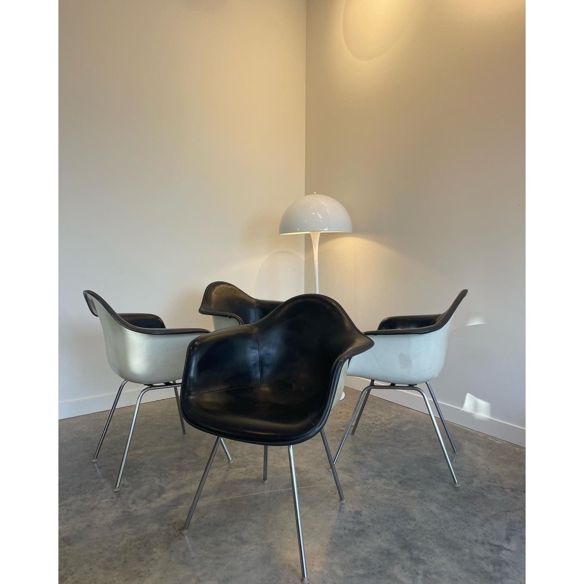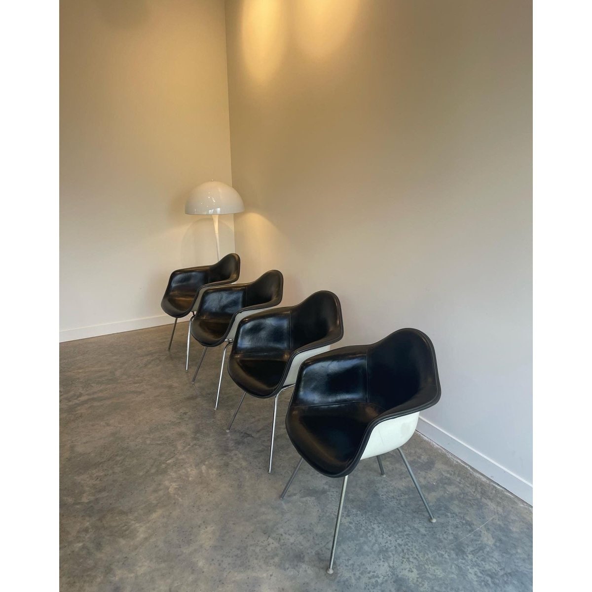 In good vintage condition. There is light scuffing and scratches to the surface of all fiberglass shells, as-well as some discolouration, one chair shell in particular is slightly darker than the others. Medium rust on all of the chairs chrome H-bases, consistent with age and use. Have all been heavily cut and polished, however the rust spots are still apparent in some areas. Vinyl/leather covers have some small scuffs, nicks and marks, however are in overall great condition. One chair does have an area where there is a notable split in the upholstery, which has been re-glued. The condition is exactly alike any other DAX armchairs of the same vintage currently listed on the market, condition is reflected in price. Please see photos for any notable imperfections.