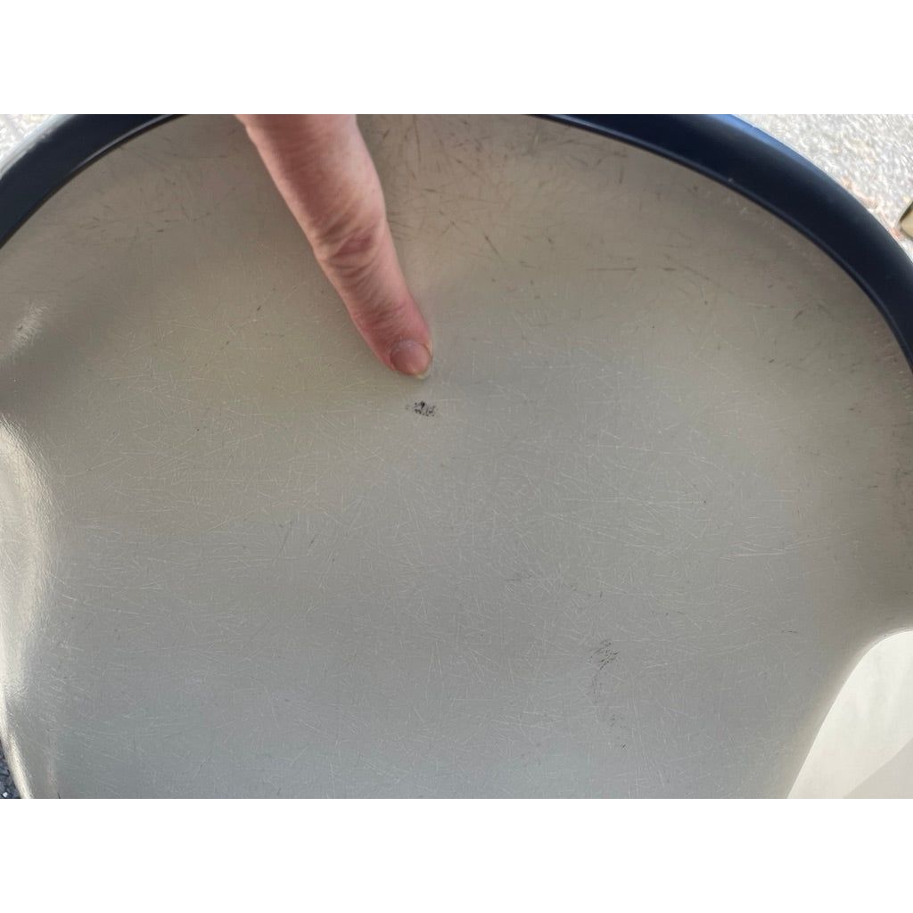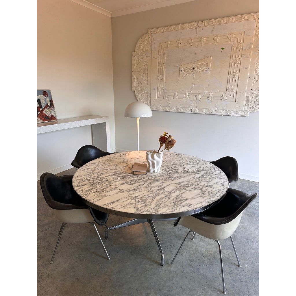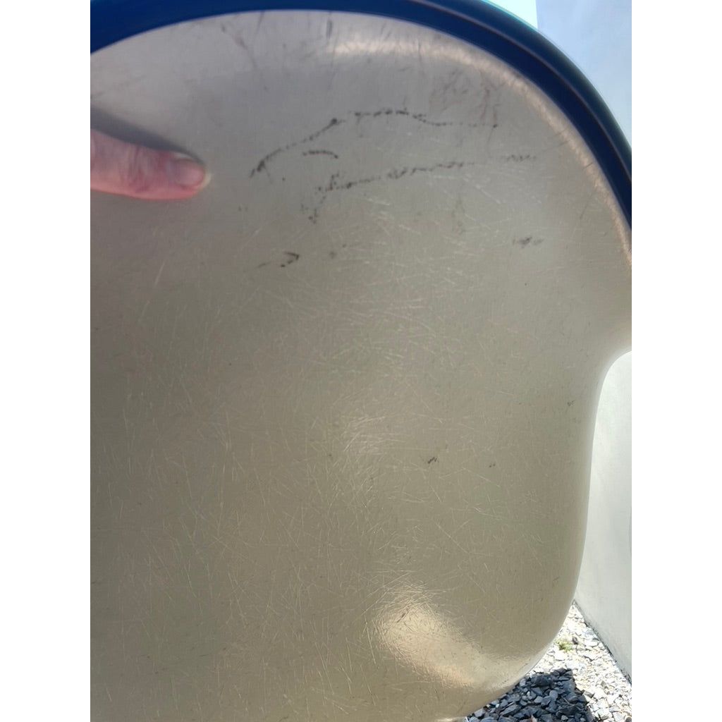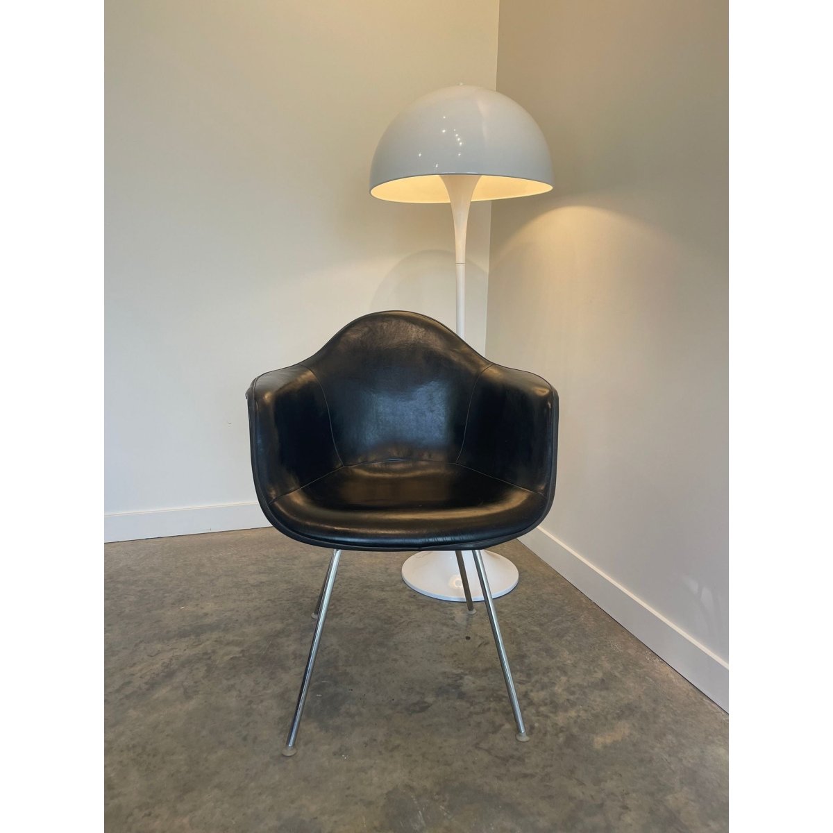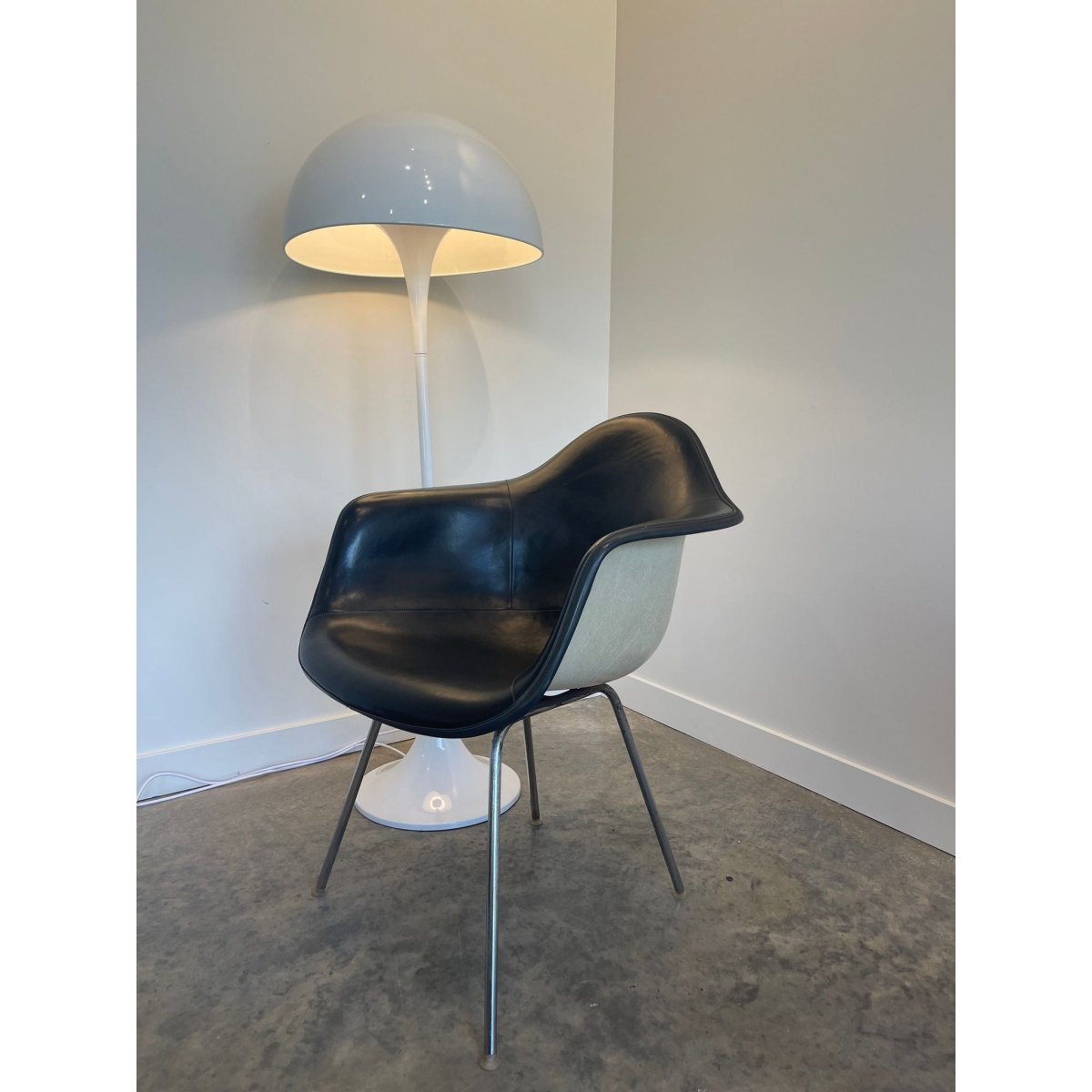 In good vintage condition. There is light scuffing and scratches to the surface of all fiberglass shells, as-well as some discolouration, one chair shell in particular is slightly darker than the others. Medium rust on all of the chairs chrome H-bases, consistent with age and use. Have all been heavily cut and polished, however the rust spots are still apparent in some areas. Vinyl/leather covers have some small scuffs, nicks and marks, however are in overall great condition. One chair does have an area where there is a notable split in the upholstery, which has been re-glued. The condition is exactly alike any other DAX armchairs of the same vintage currently listed on the market, condition is reflected in price. Please see photos for any notable imperfections.