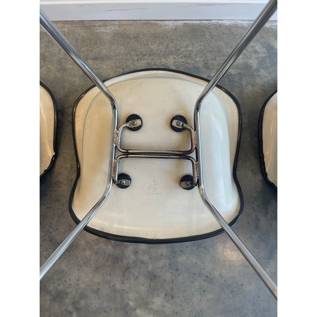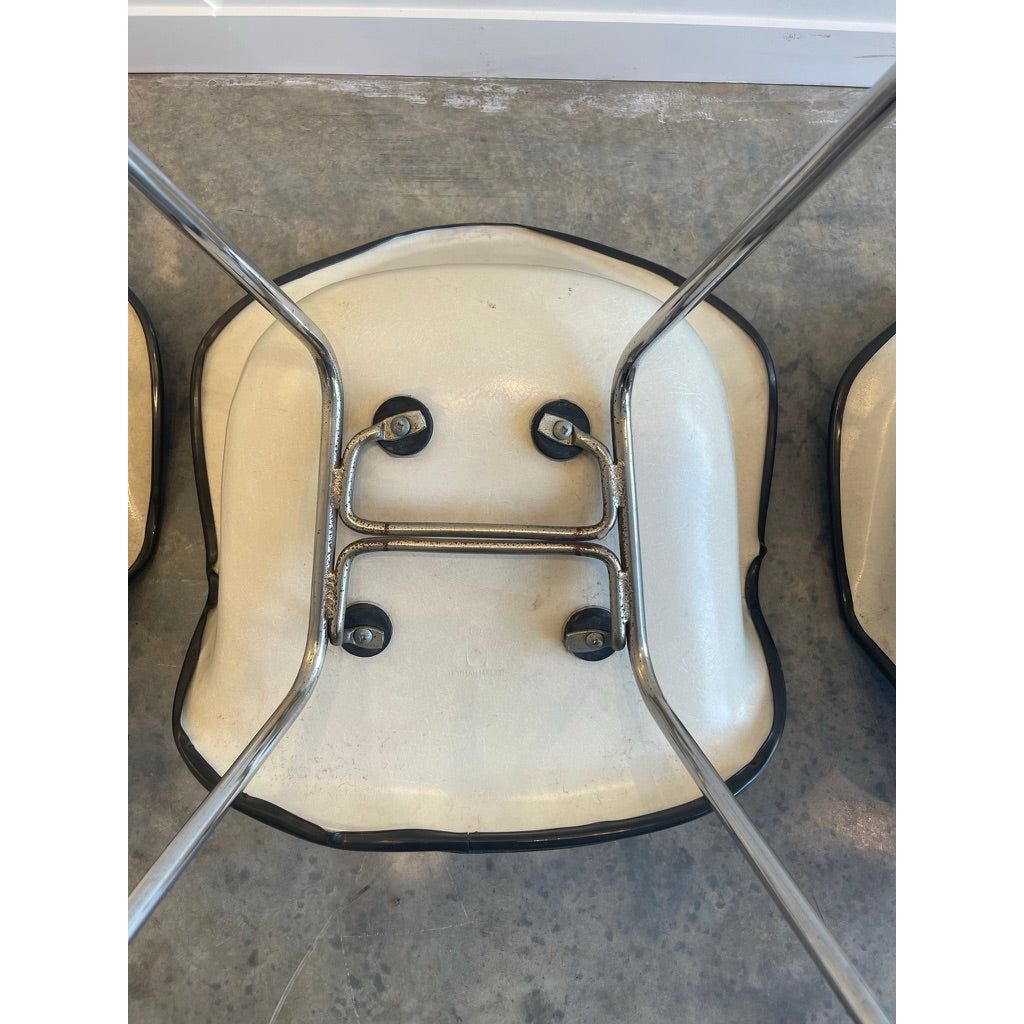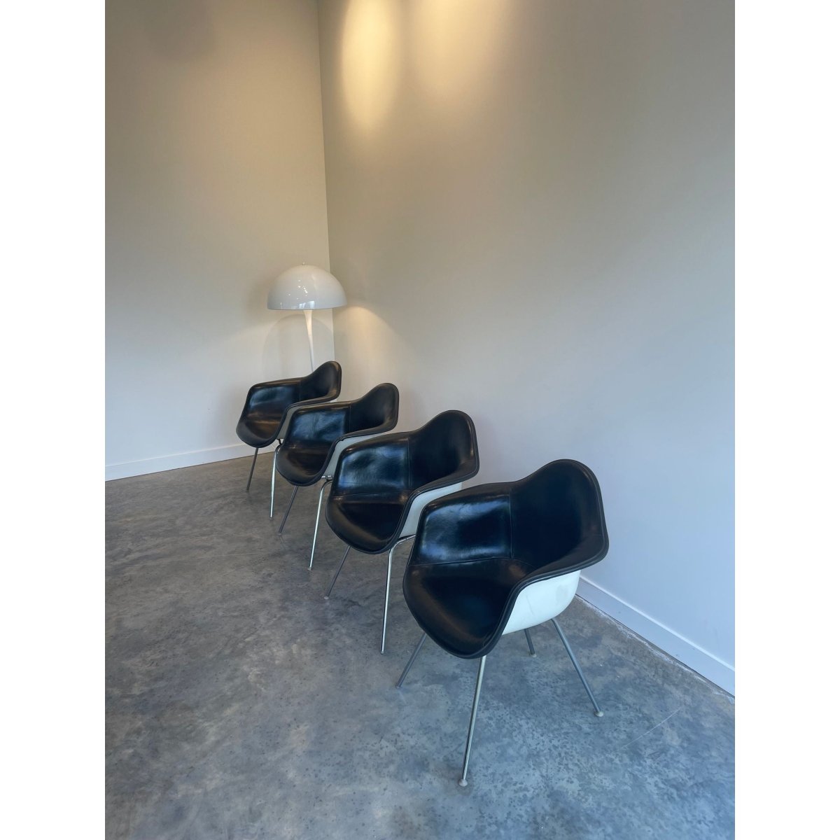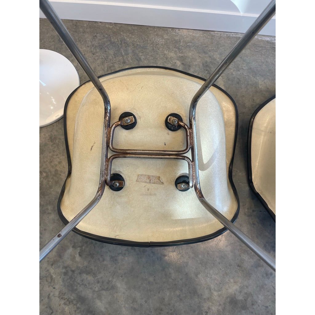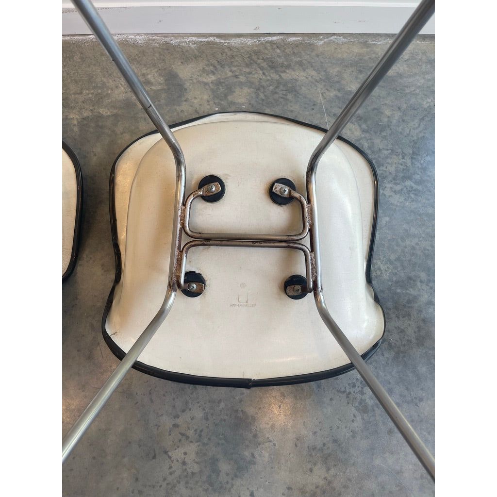 Made by Herman Miller, 60's, USA, - designed by Charles & Ray Eames. These chairs constitute of an off white fibreglass shell and a contrasting, black vinyl - leather style upholstery. H - Base. A rare set of four, priced per pair.