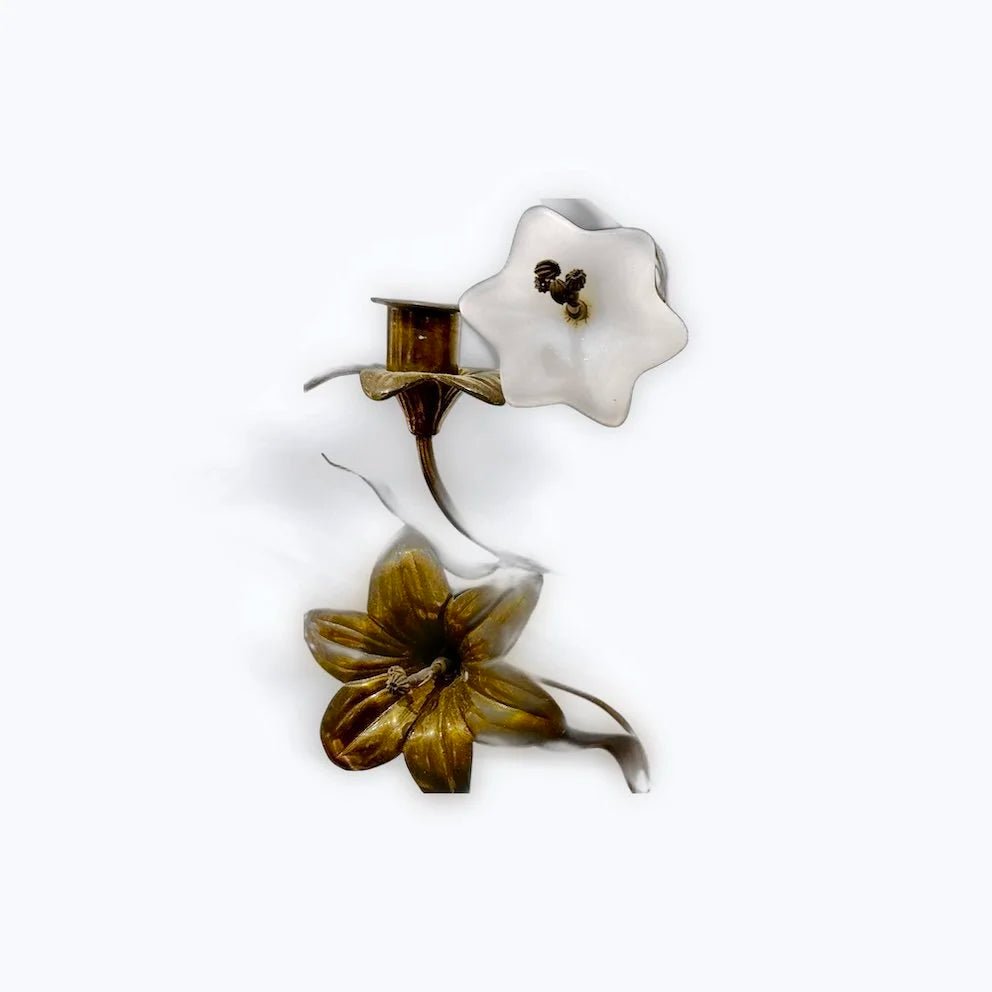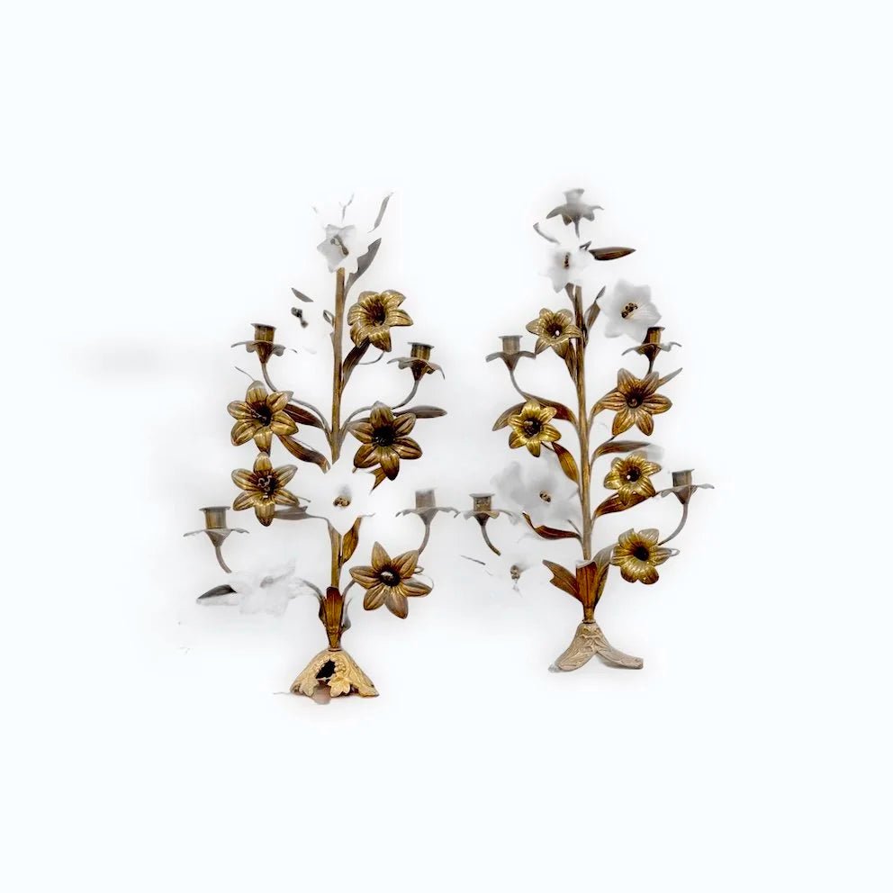 A pair of tall antique French metal church candlesticks with milk glass & metal flowers. Holds 5 candles. c 1910 size: 59cm h x 32 cm w