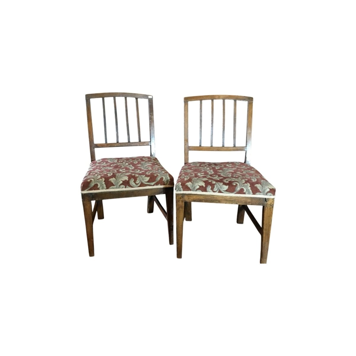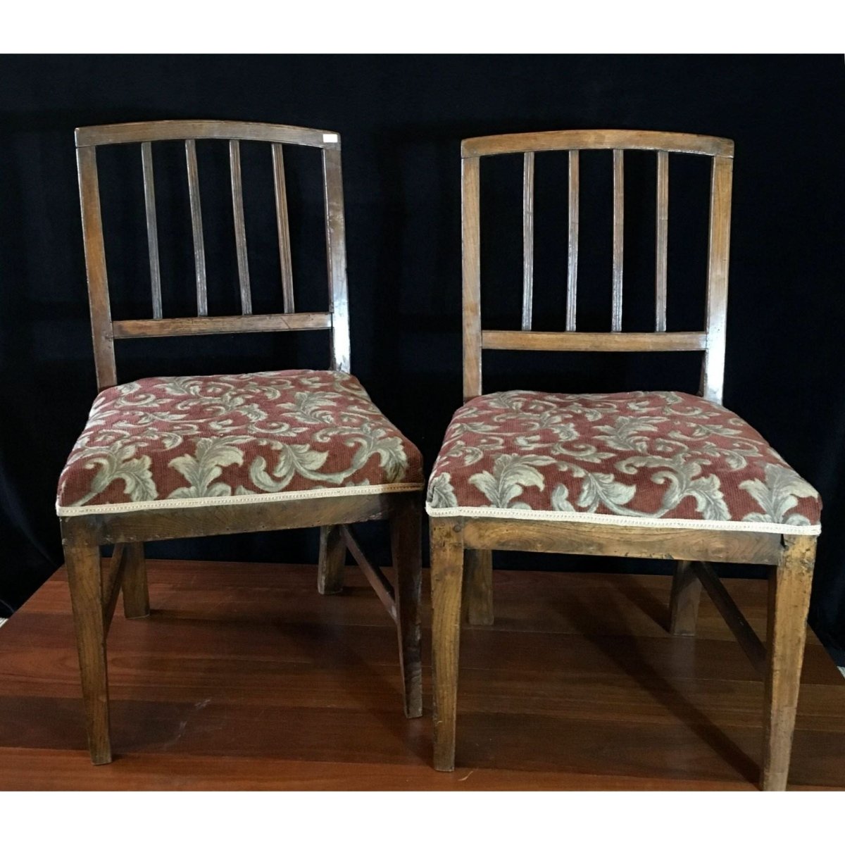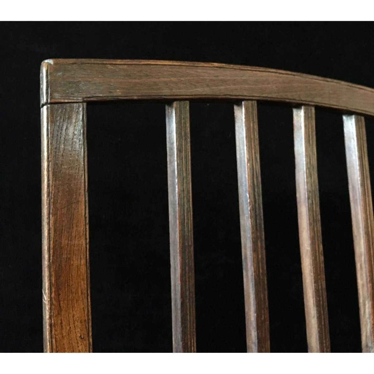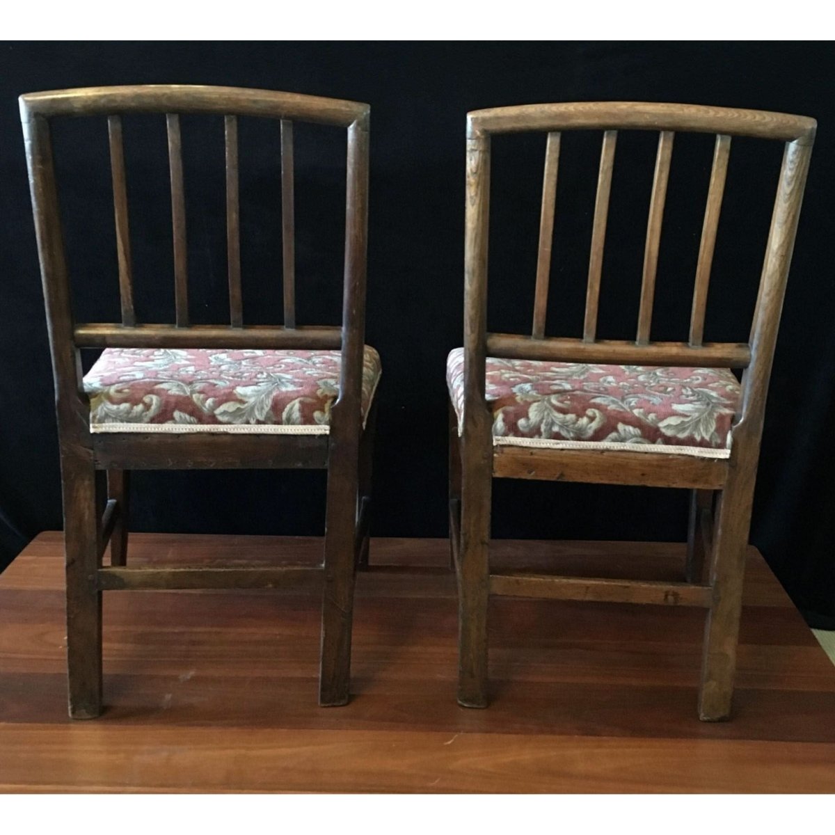 Pair of English elm country chairs with original patina and fine stringing to the four splats. Circa 1800
