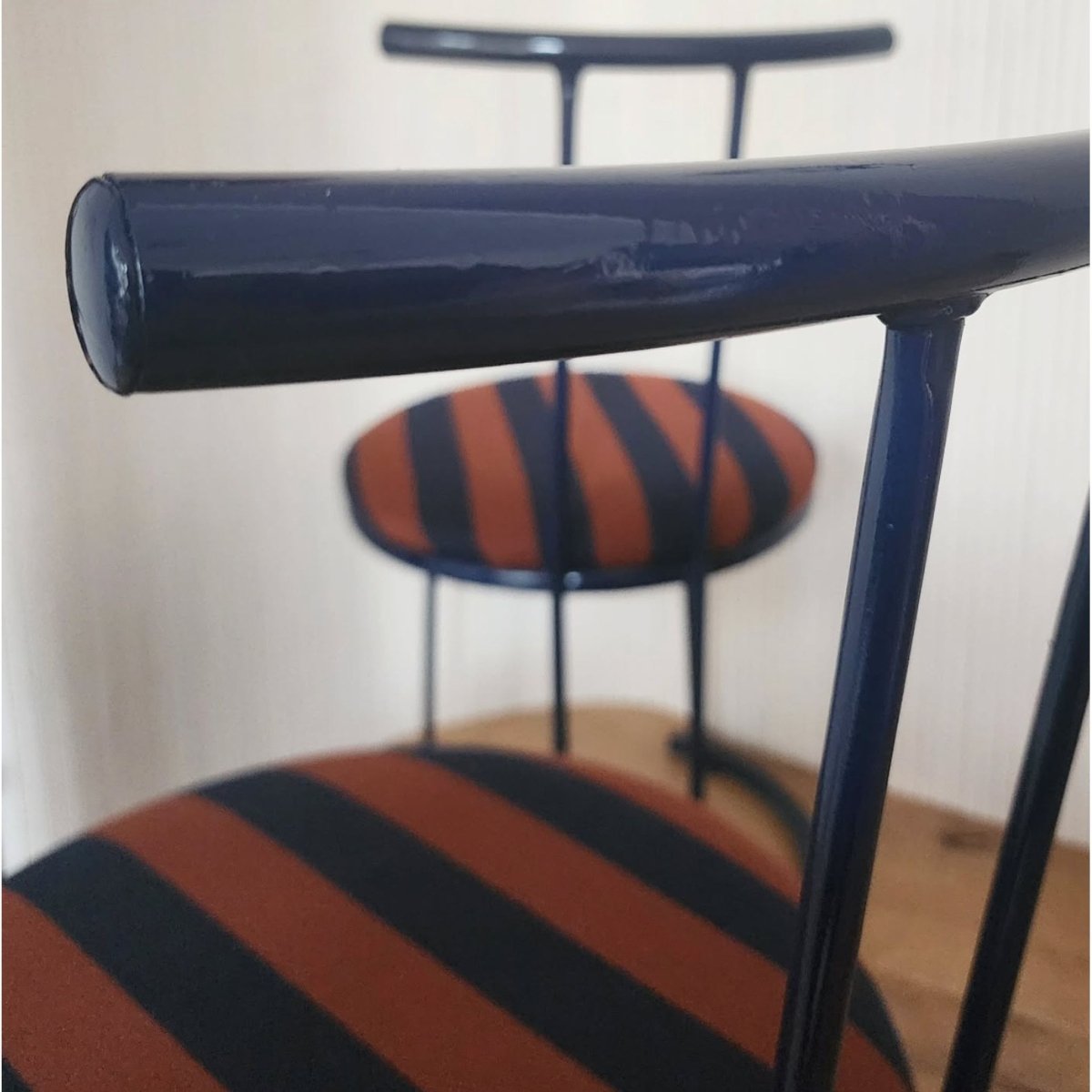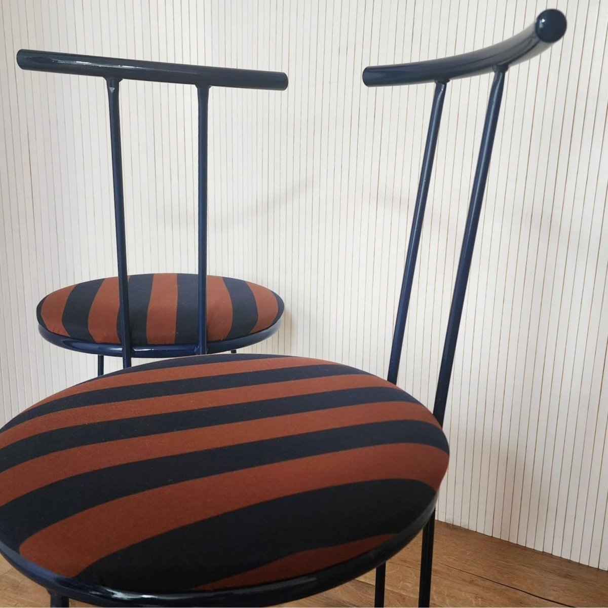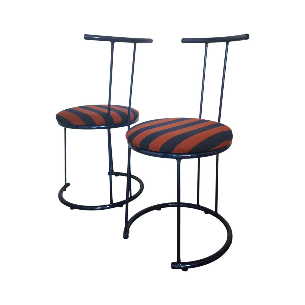 Upcycled curve metal chairs in the darkest navy complimented with newly reupholstered seats in terracotta and navy stripe cotton fabric. Slight imperfections in the paint but generally presents well.