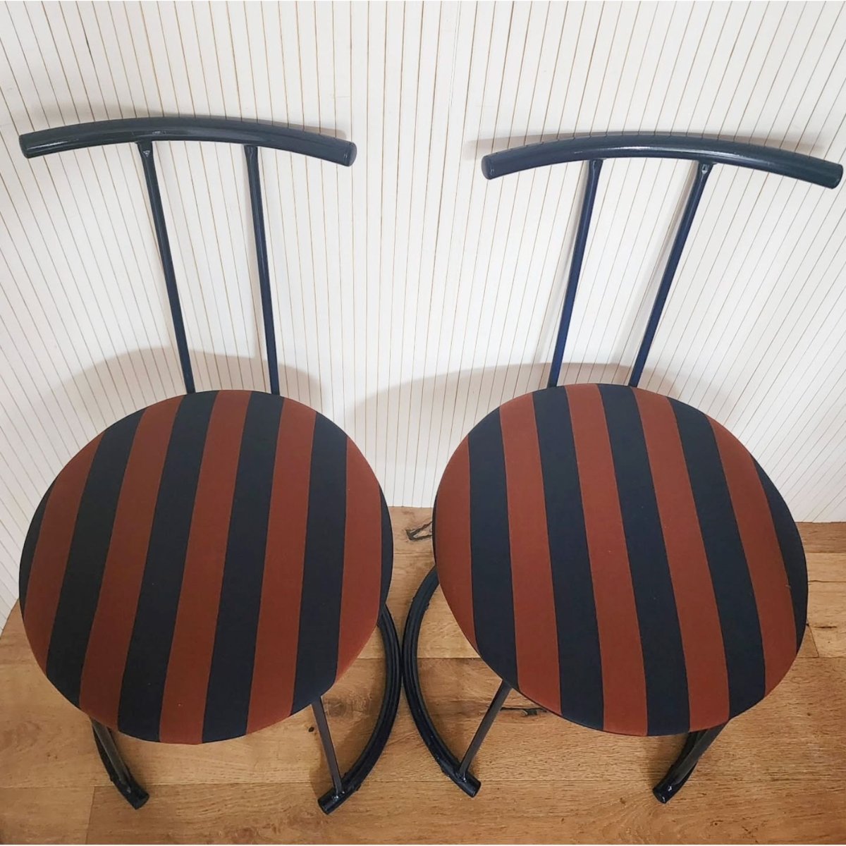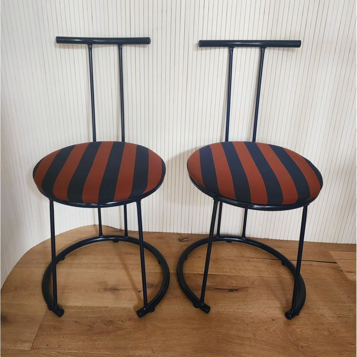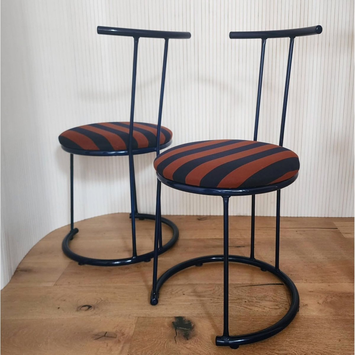 Upcycled curve metal chairs in the darkest navy complimented with newly reupholstered seats in terracotta and navy stripe cotton fabric. Slight imperfections in the paint but generally presents well.