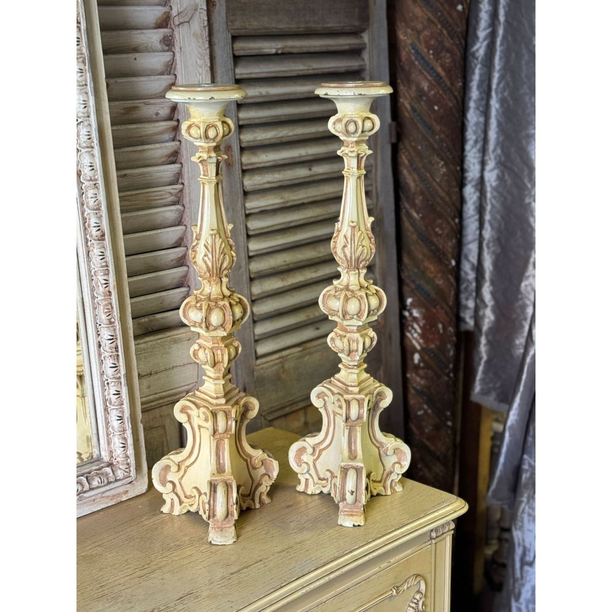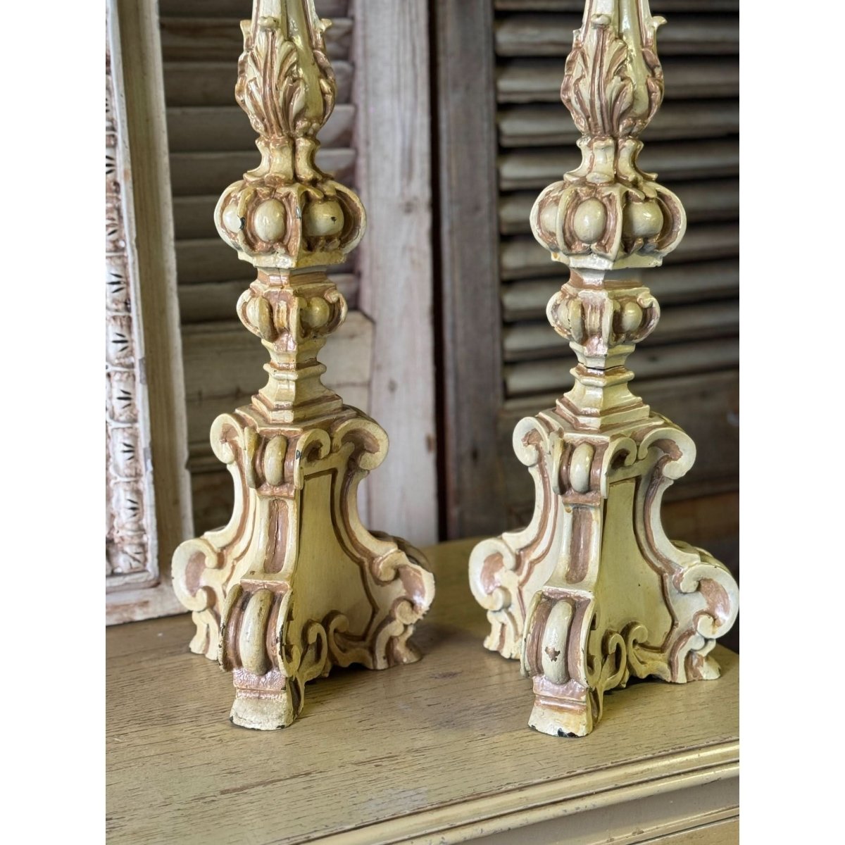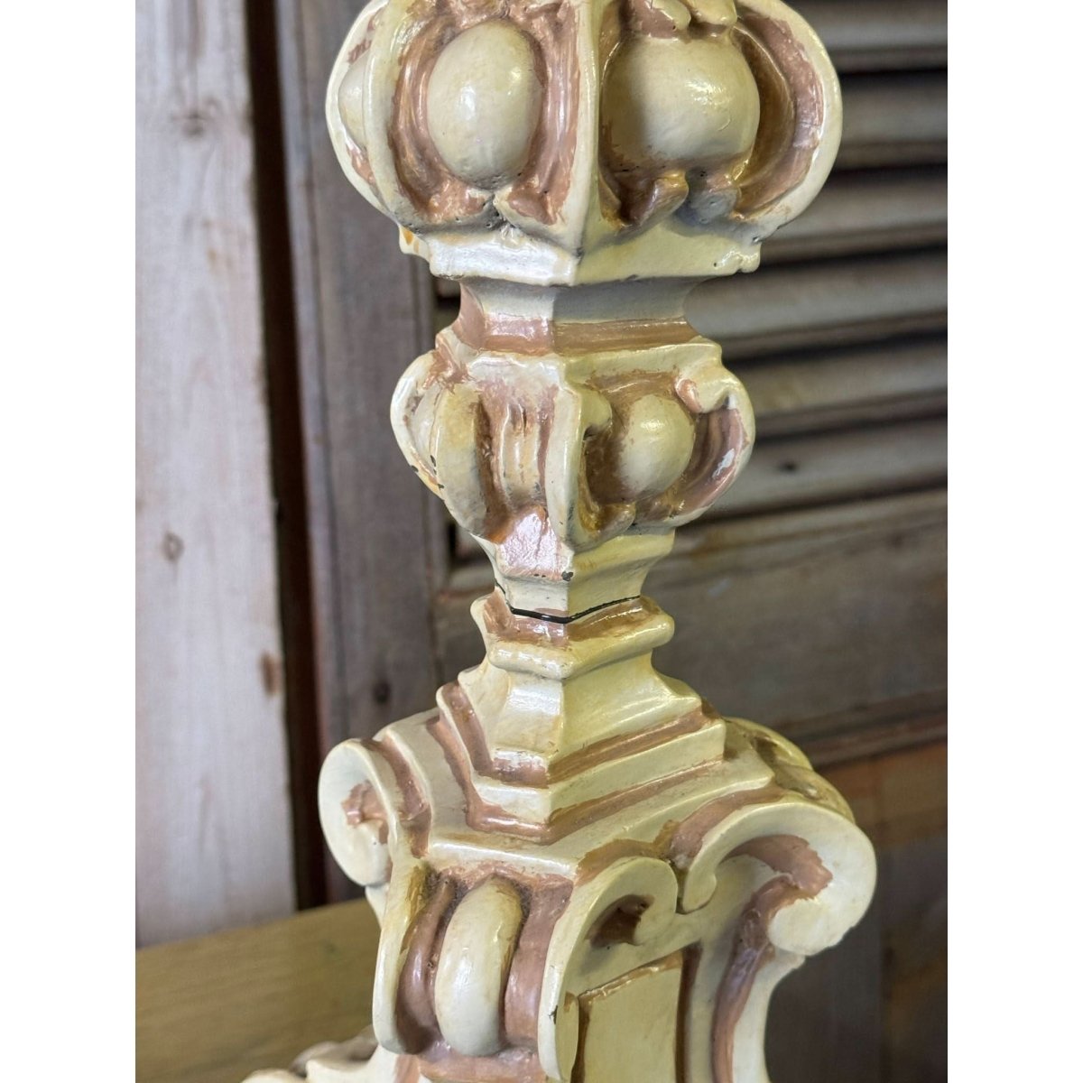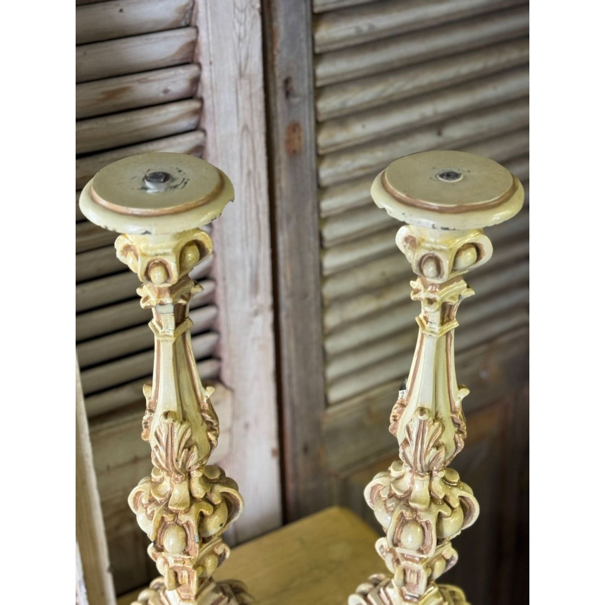Pair of vintage French style resin candlesticks. Wear and repairs, condition reflected in price. See photos for more. Sold as a pair.