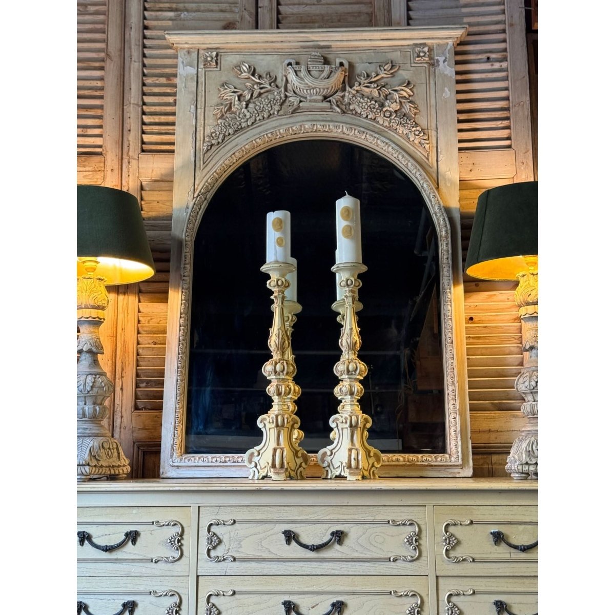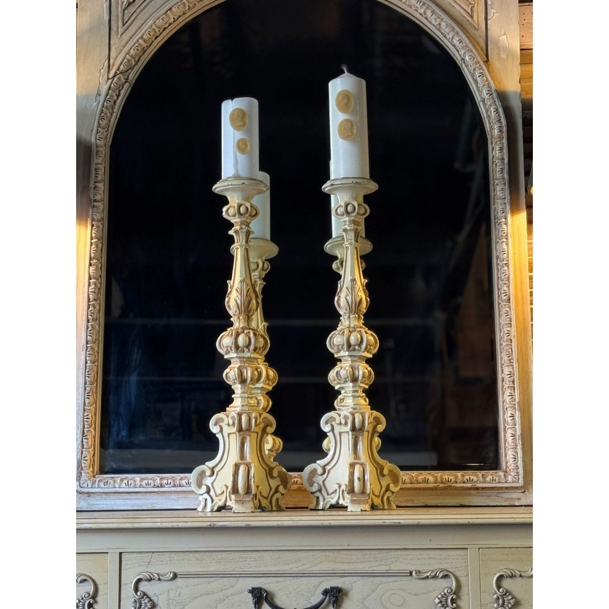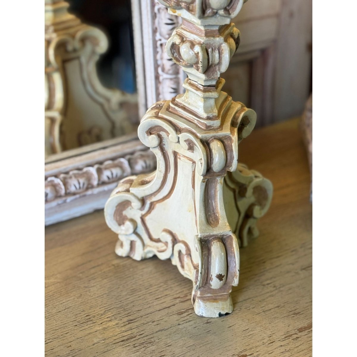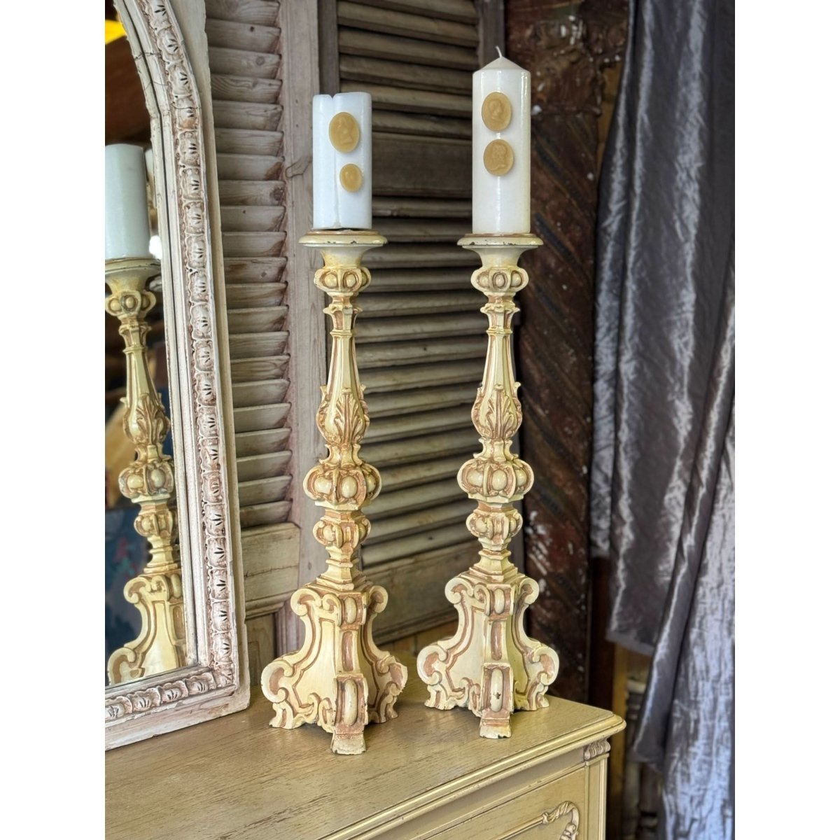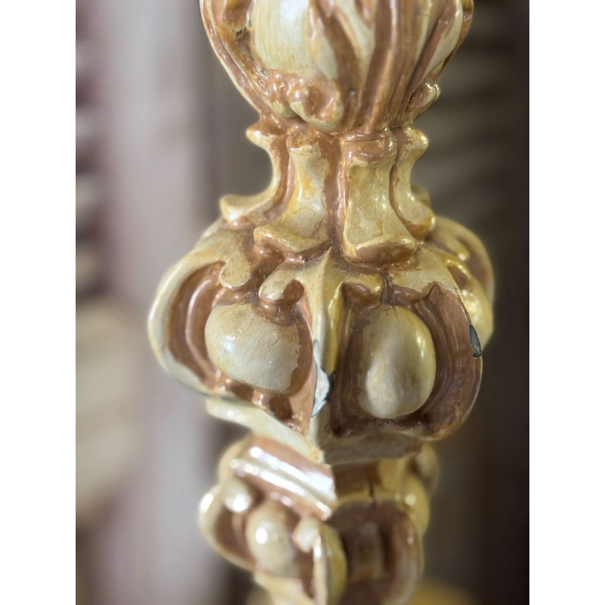 Pair of vintage French style resin candlesticks. Wear and repairs, condition reflected in price. See photos for more. Sold as a pair.