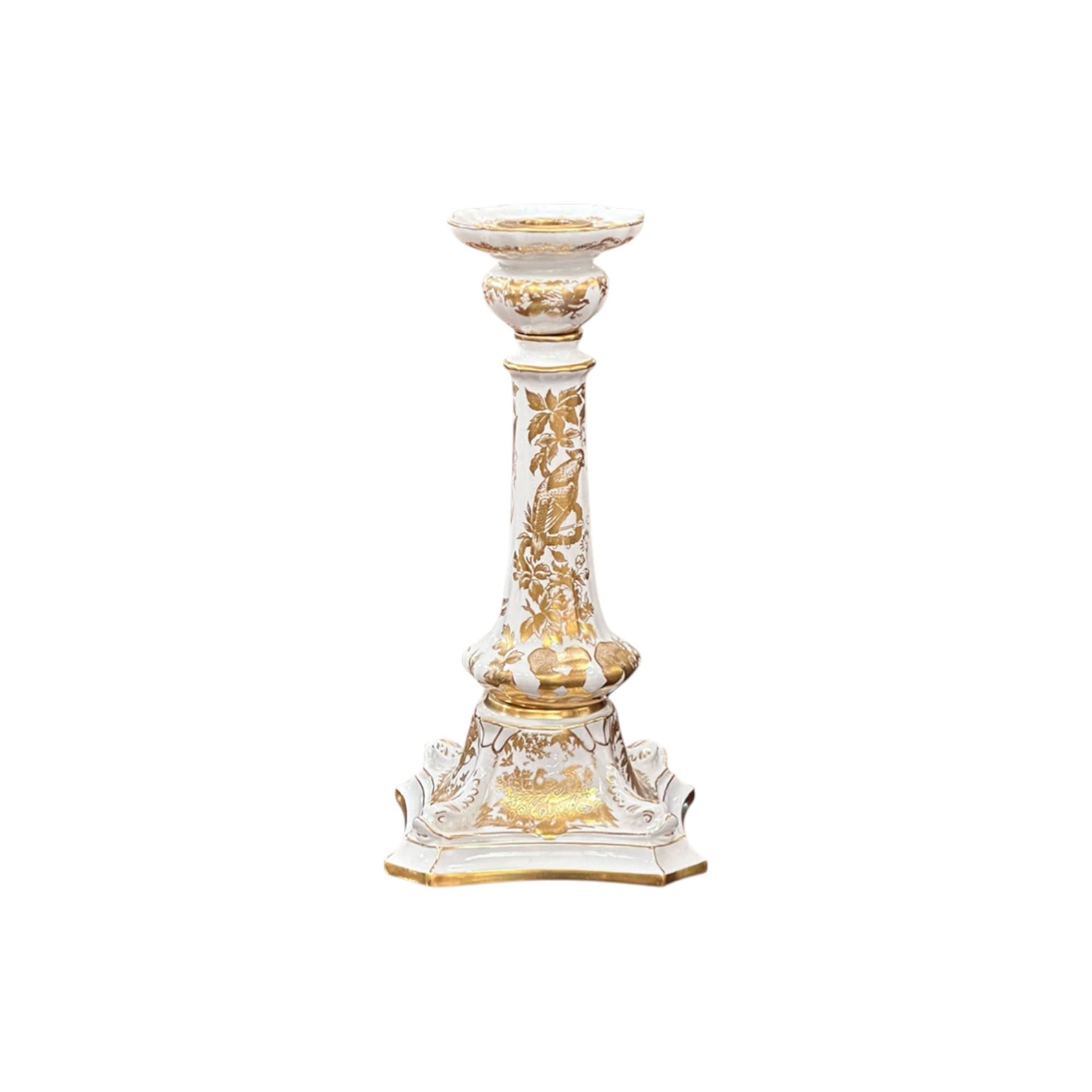 A singular Royal Crown Derby candlestick crafted from high quality ceramic and handpainted. Named “Gold Alves” from England c.1975.