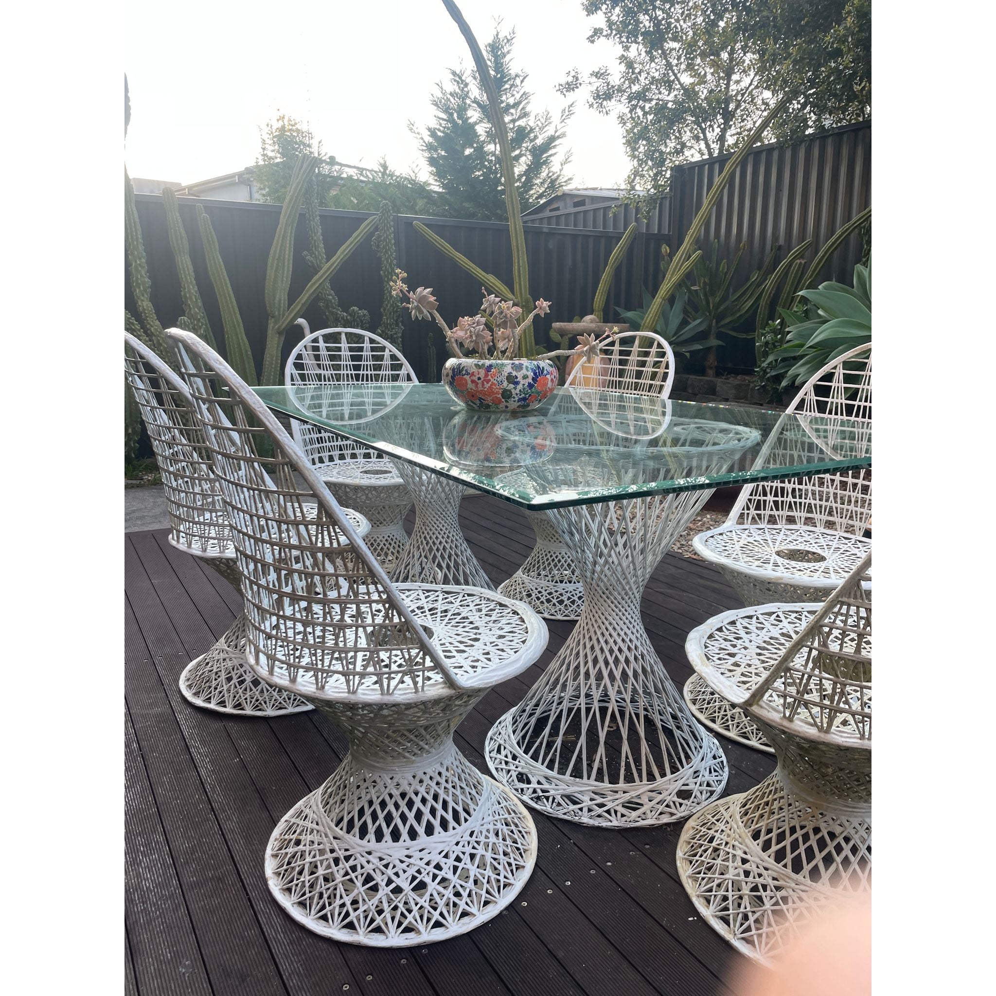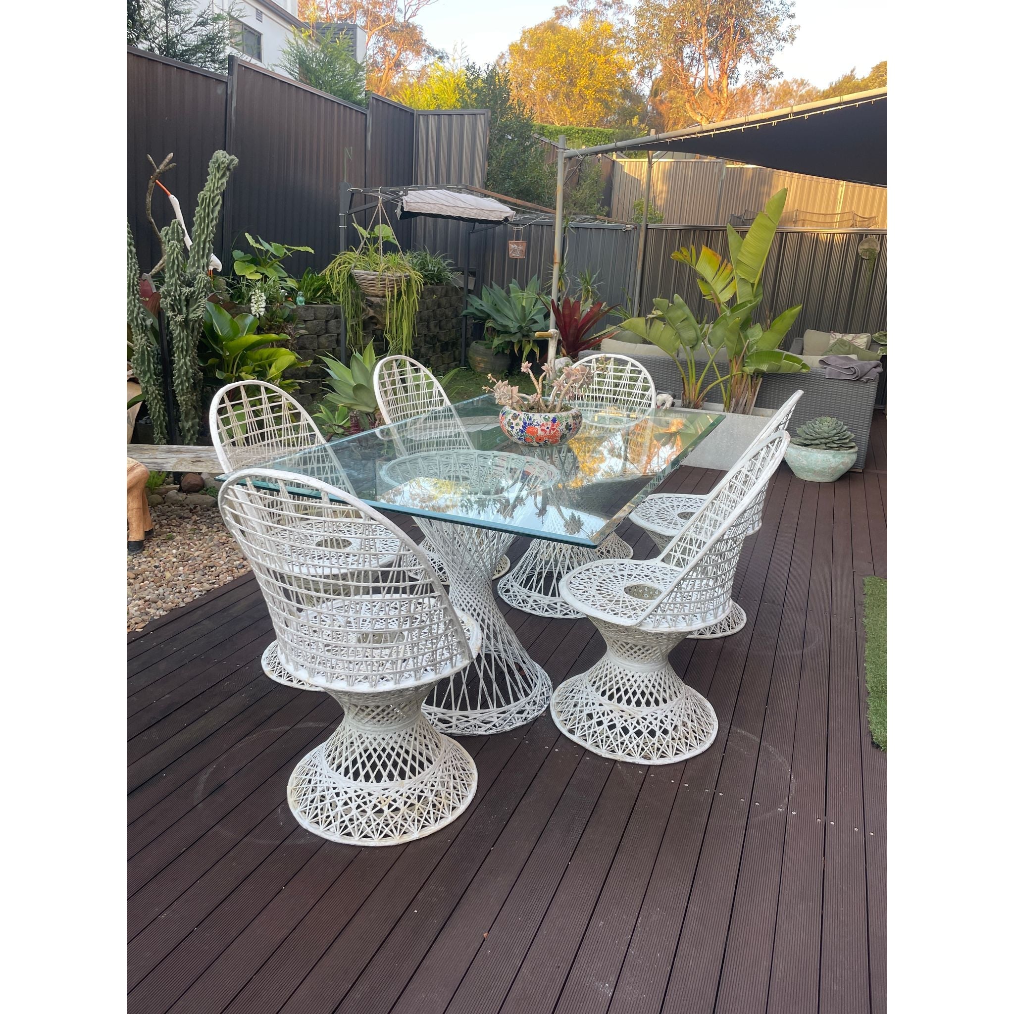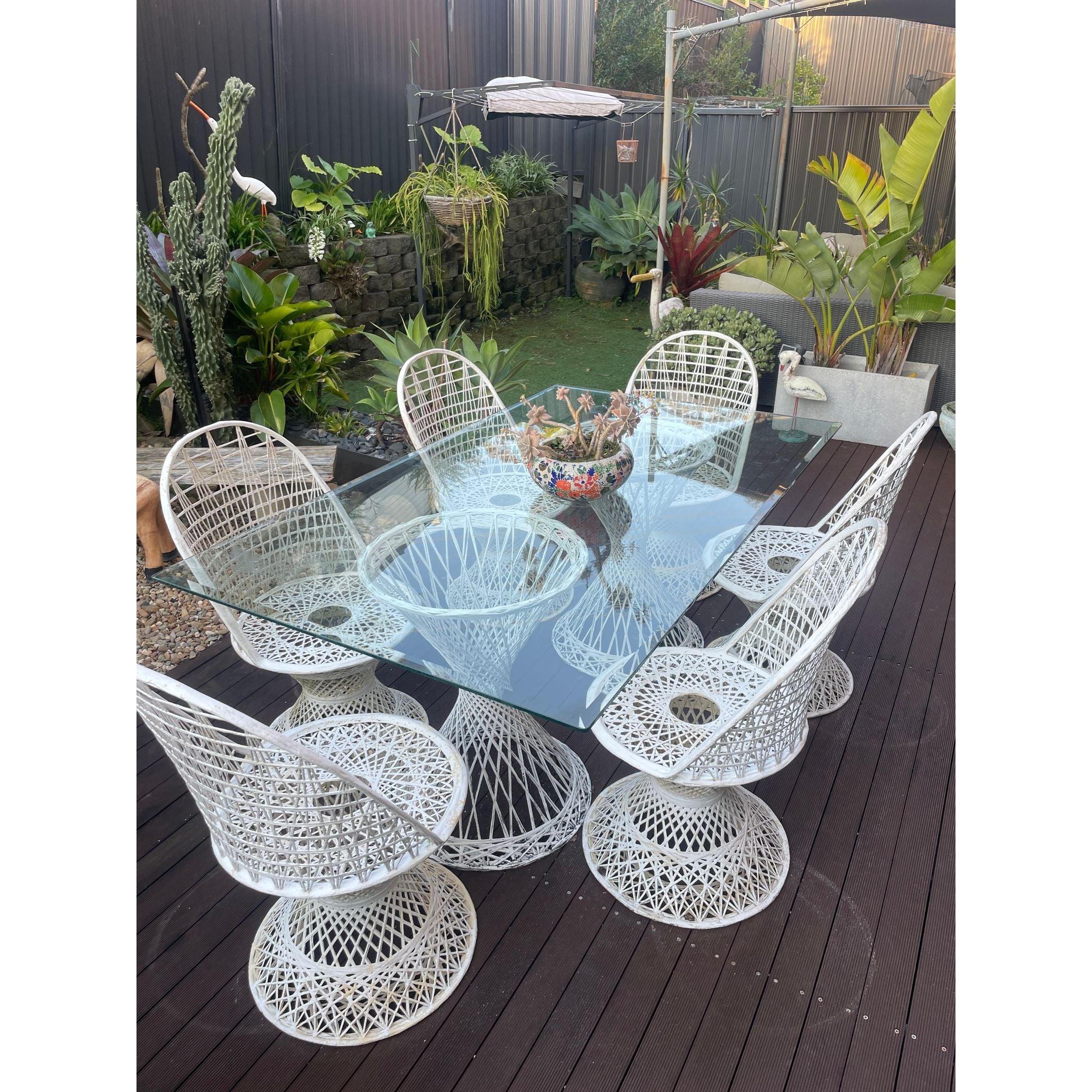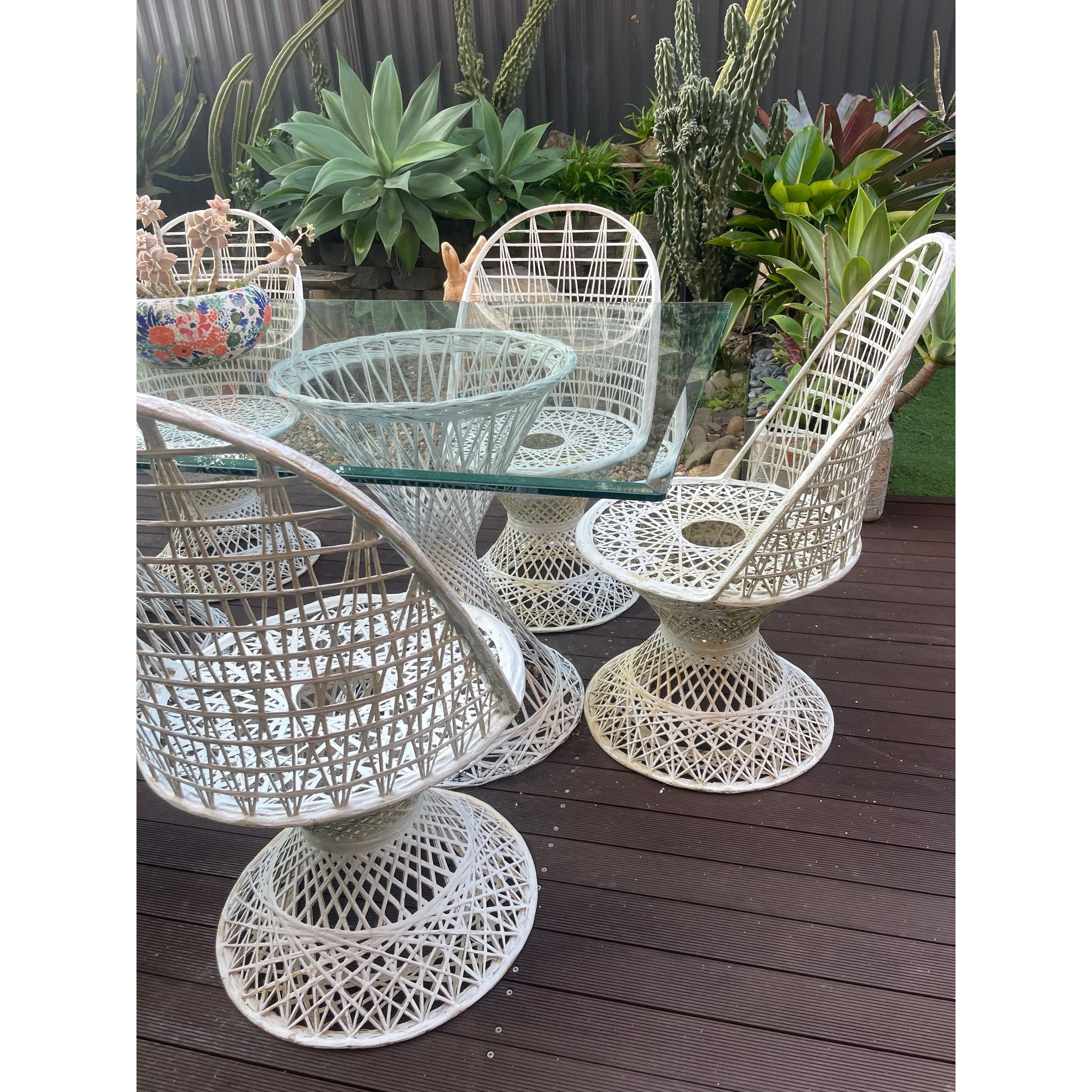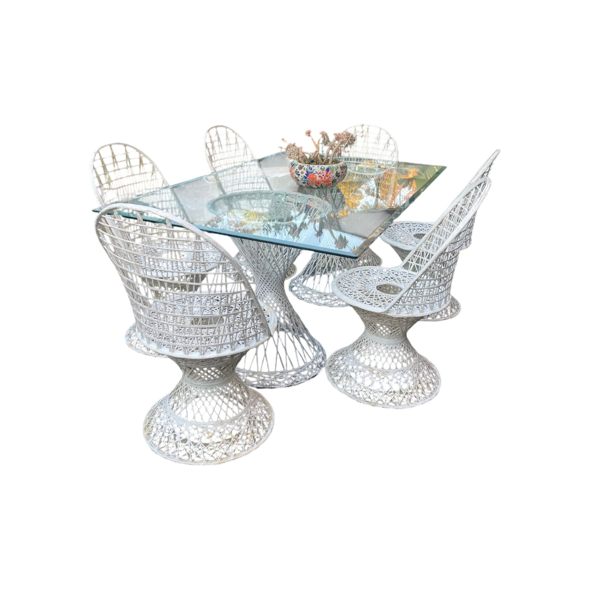 Bring mid-century modern elegance to your outdoor space with this Russel Woodard outdoor set in crisp white. Renowned for its sculptural, airy designs and durable construction this set combines timeless style with functional comfort making it perfect for patios, gardens or poolside entertaining.
