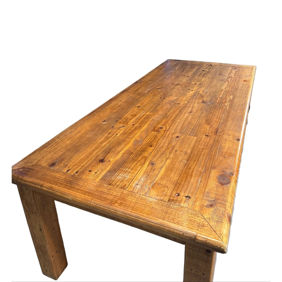 Crafted from solid wood with authentic rustic character, this substantial dining table serves as a striking centrepiece for any home. The generous proportions accommodate larger gatherings, while the natural grain patterns and warm finish celebrate the material's inherent beauty. Built to withstand years of family meals and entertaining, this piece combines durability with timeless appeal. Perfect for those seeking quality furniture that balances functionality with distinctive style.