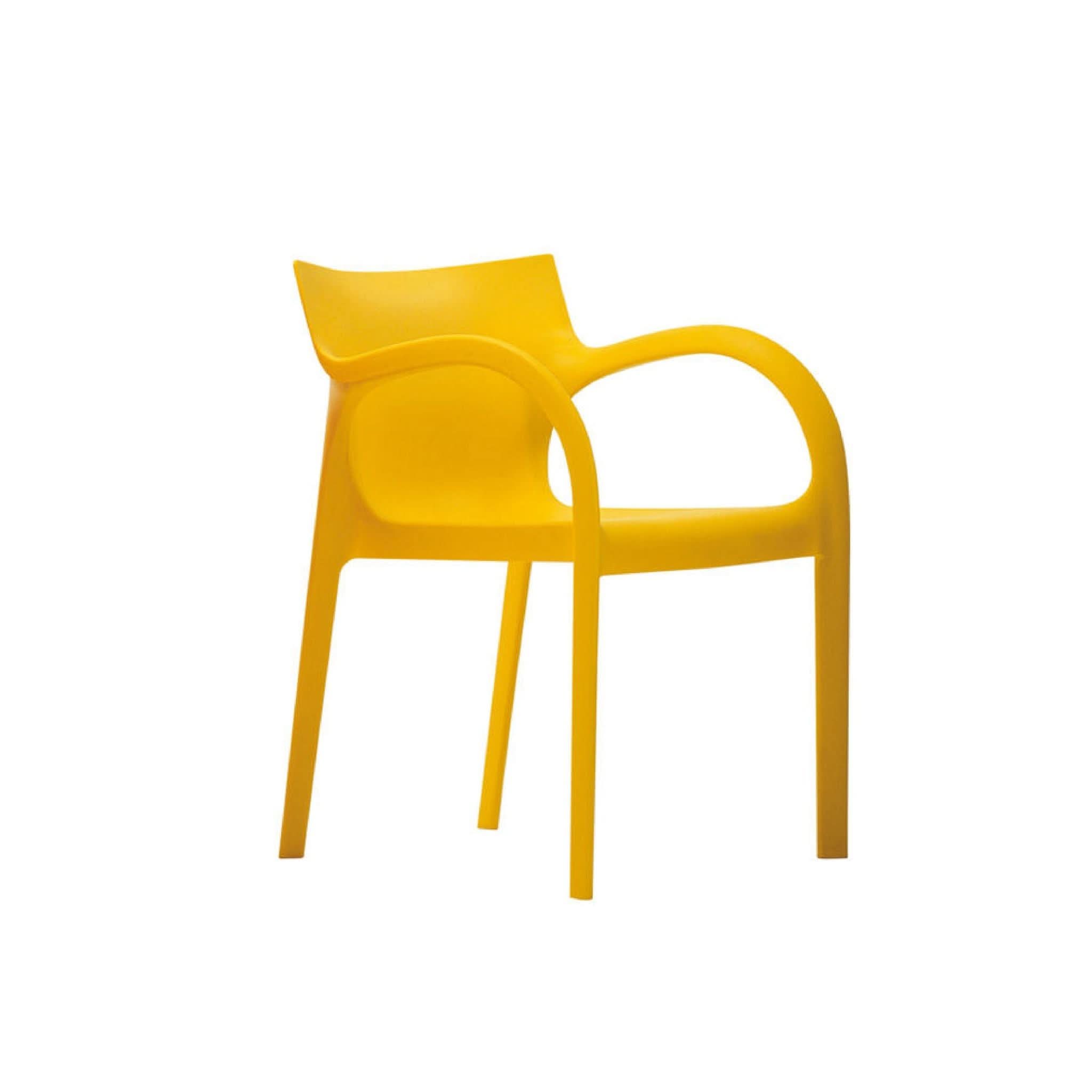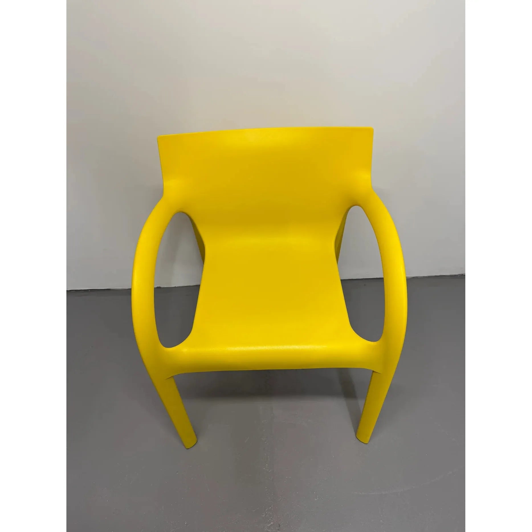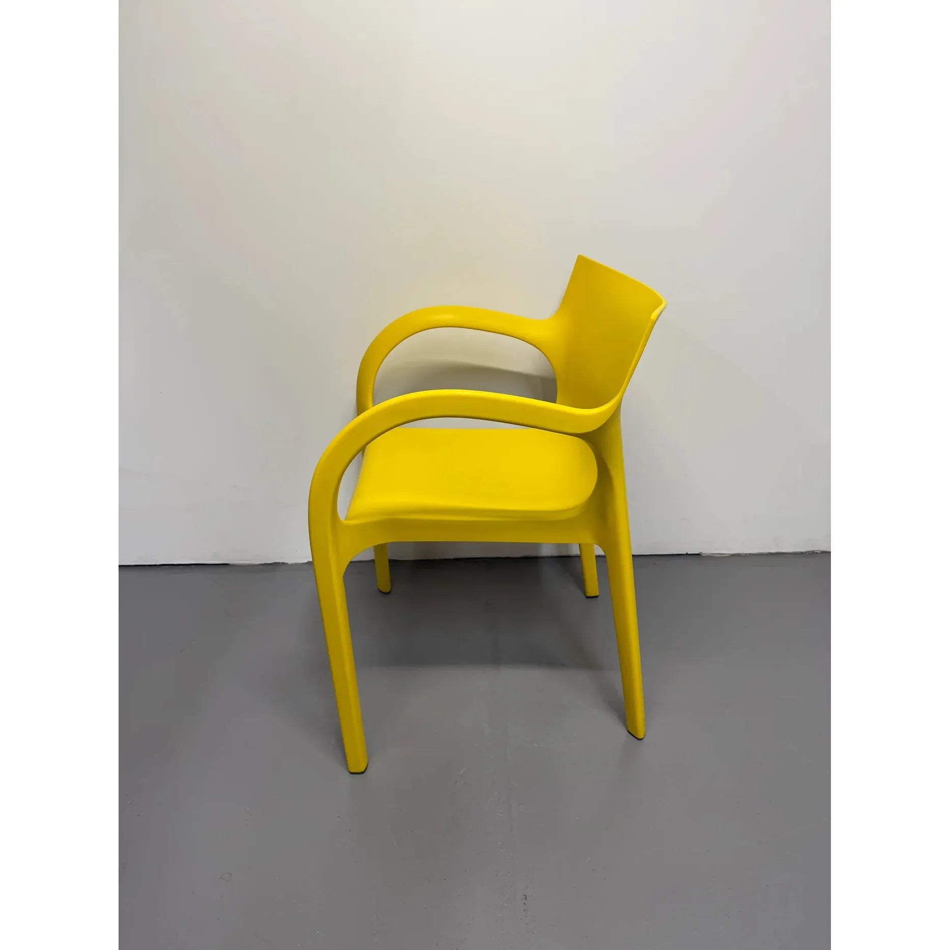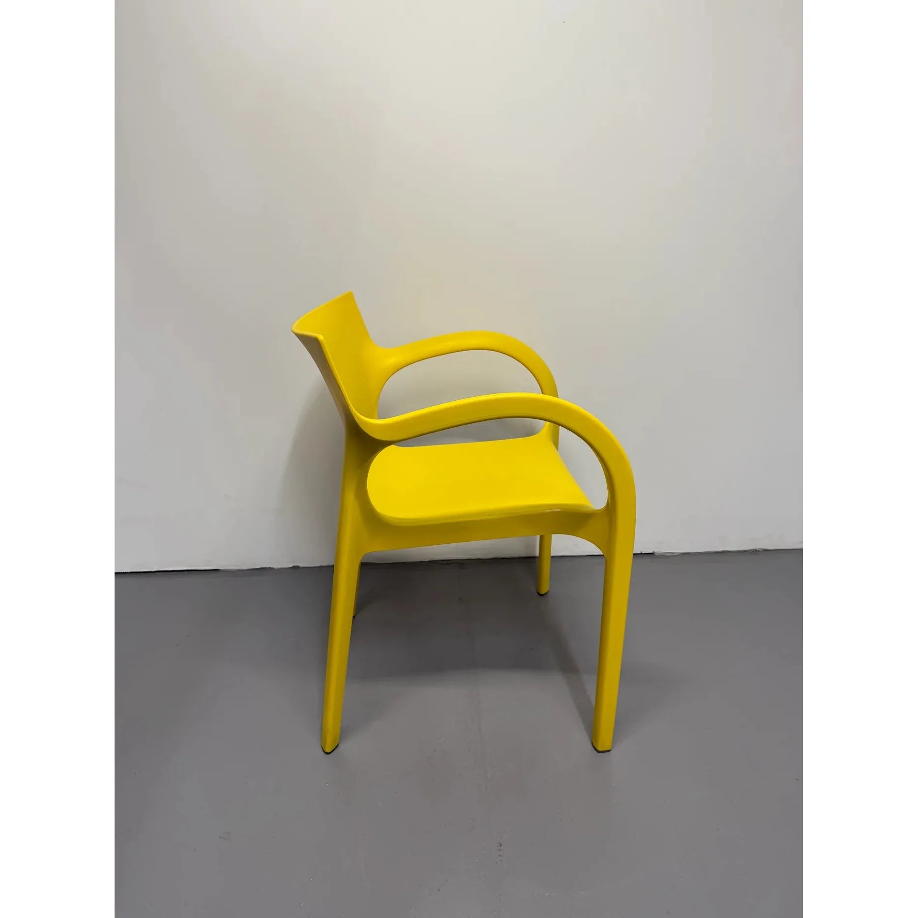 This version comes in a bright yellow finish, adding a vibrant pop of colour indoors or outdoors. Made with UV- and weather-resistant materials, the chair is lightweight, easy to clean, and stackable for flexible use.