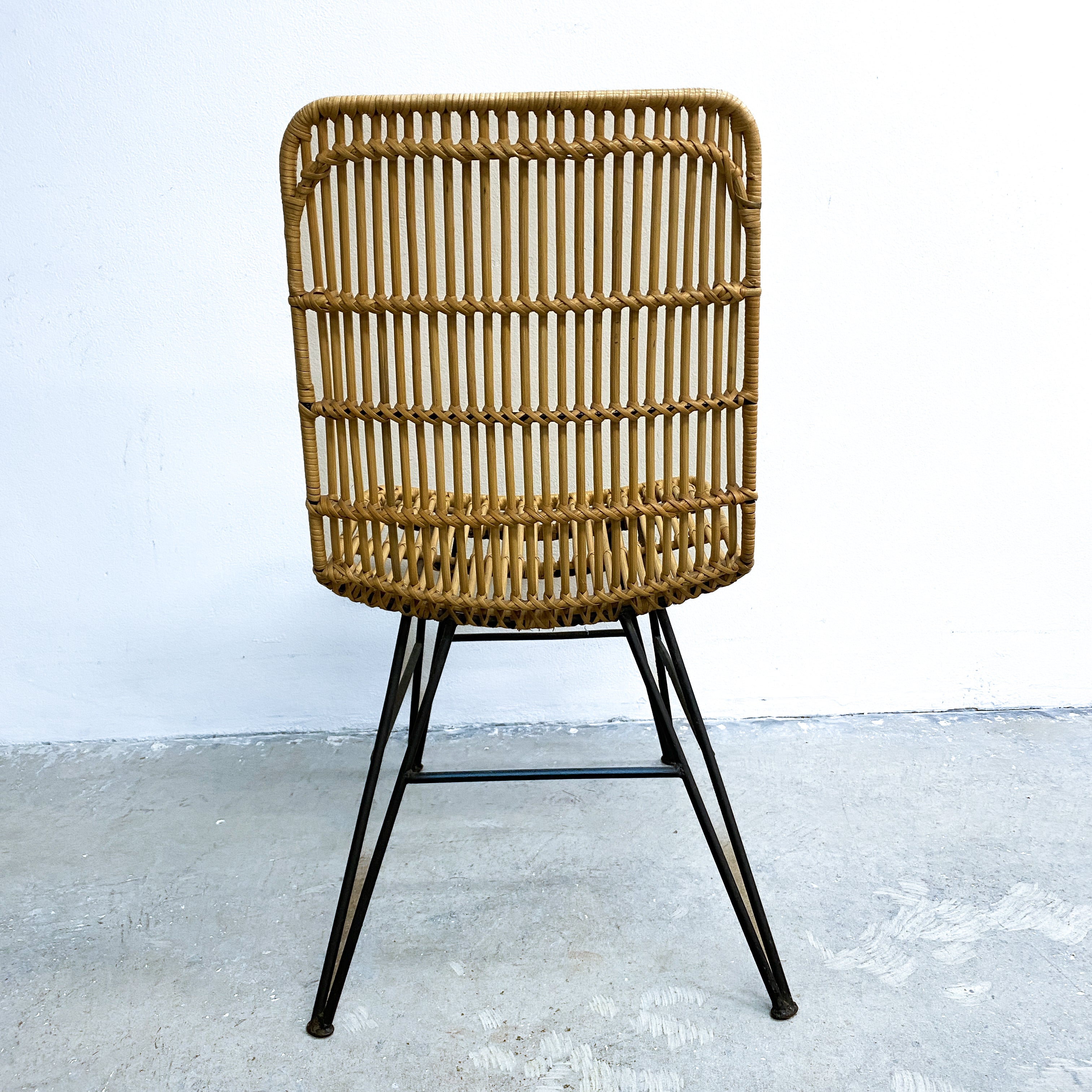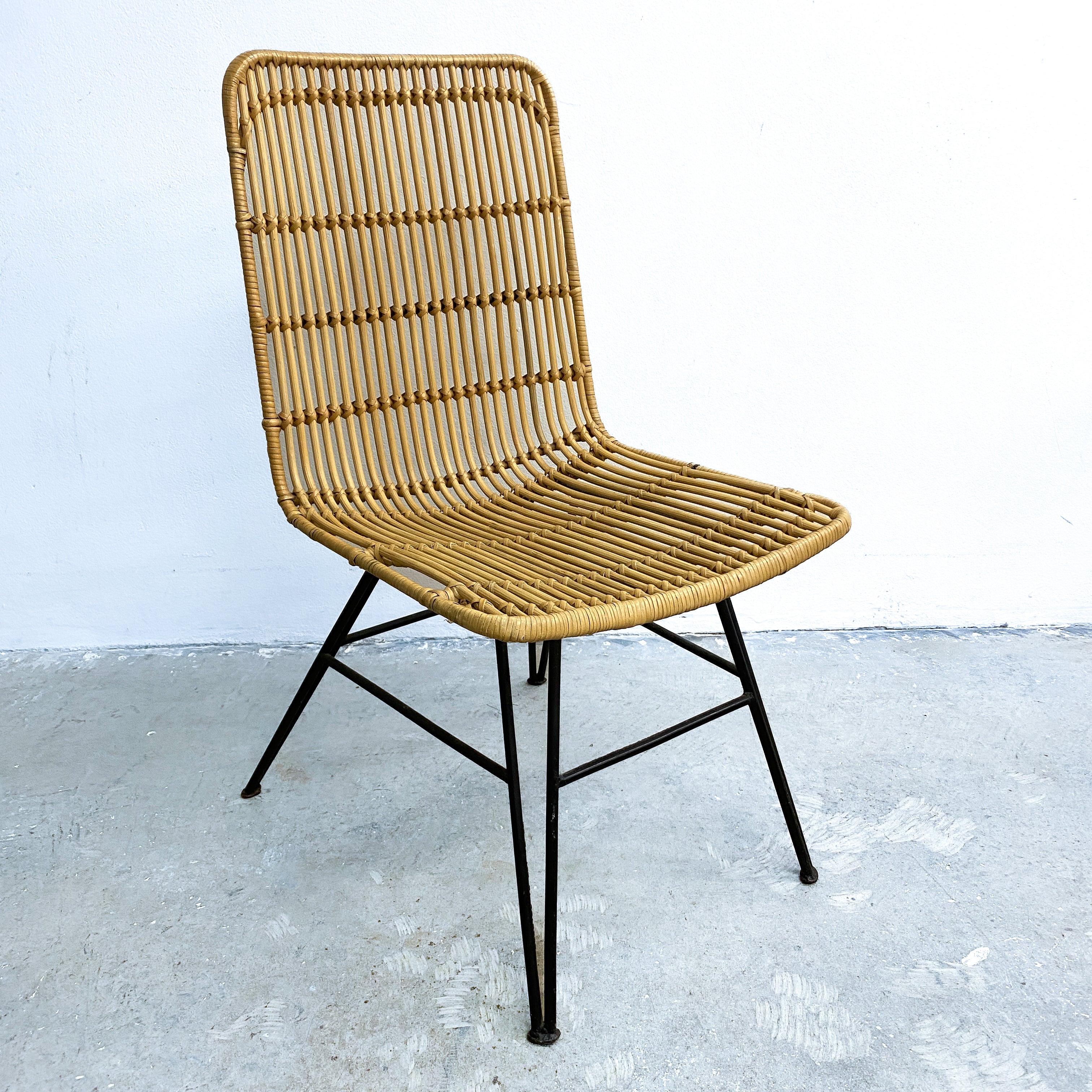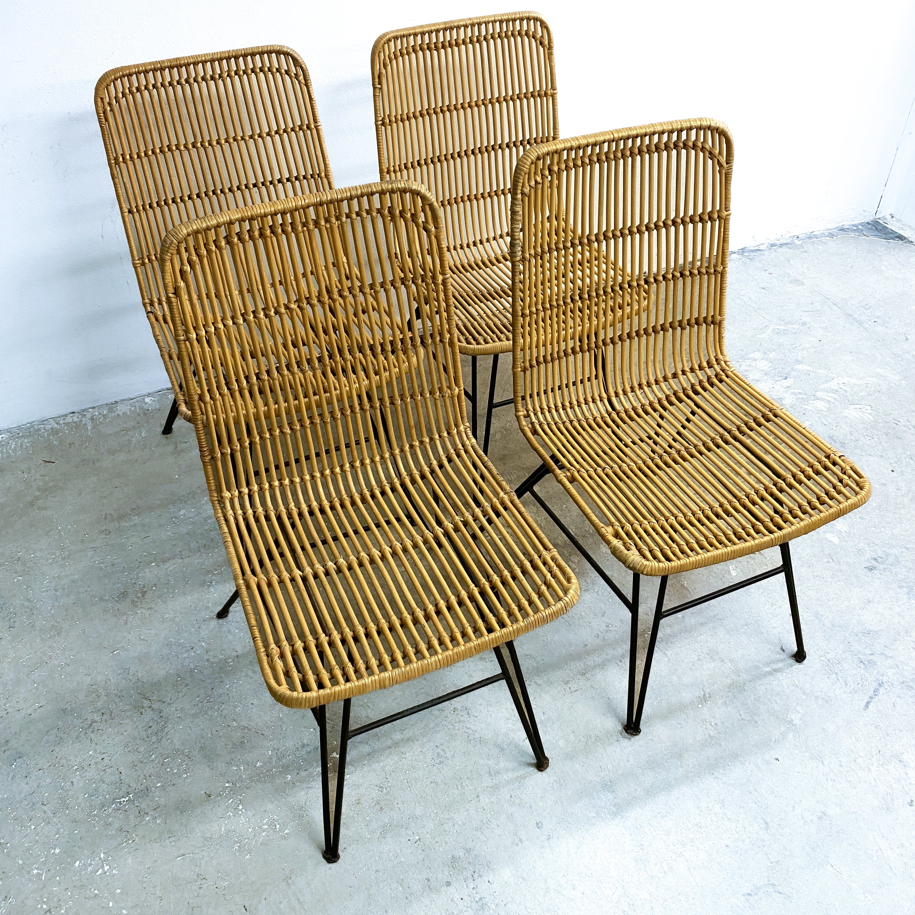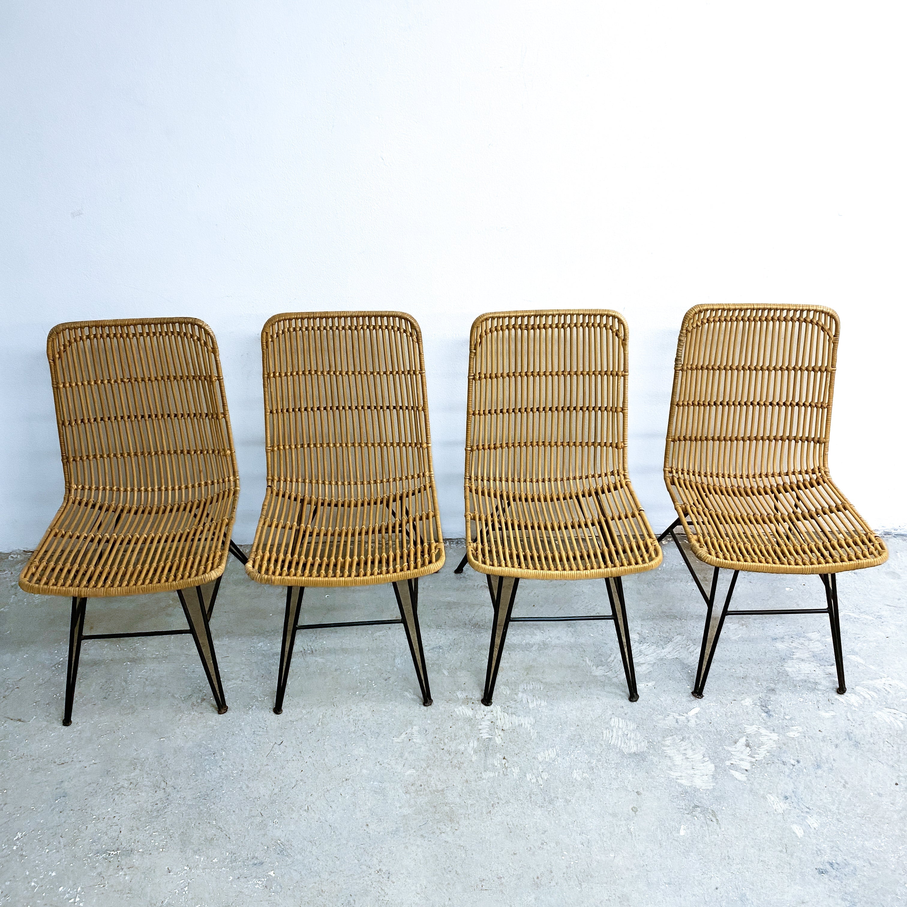 Fabulous set of 4 cane and black metal rod dining chairs. Perfect for a coastal or informal dining area on the deck or indoors. In great original condition.